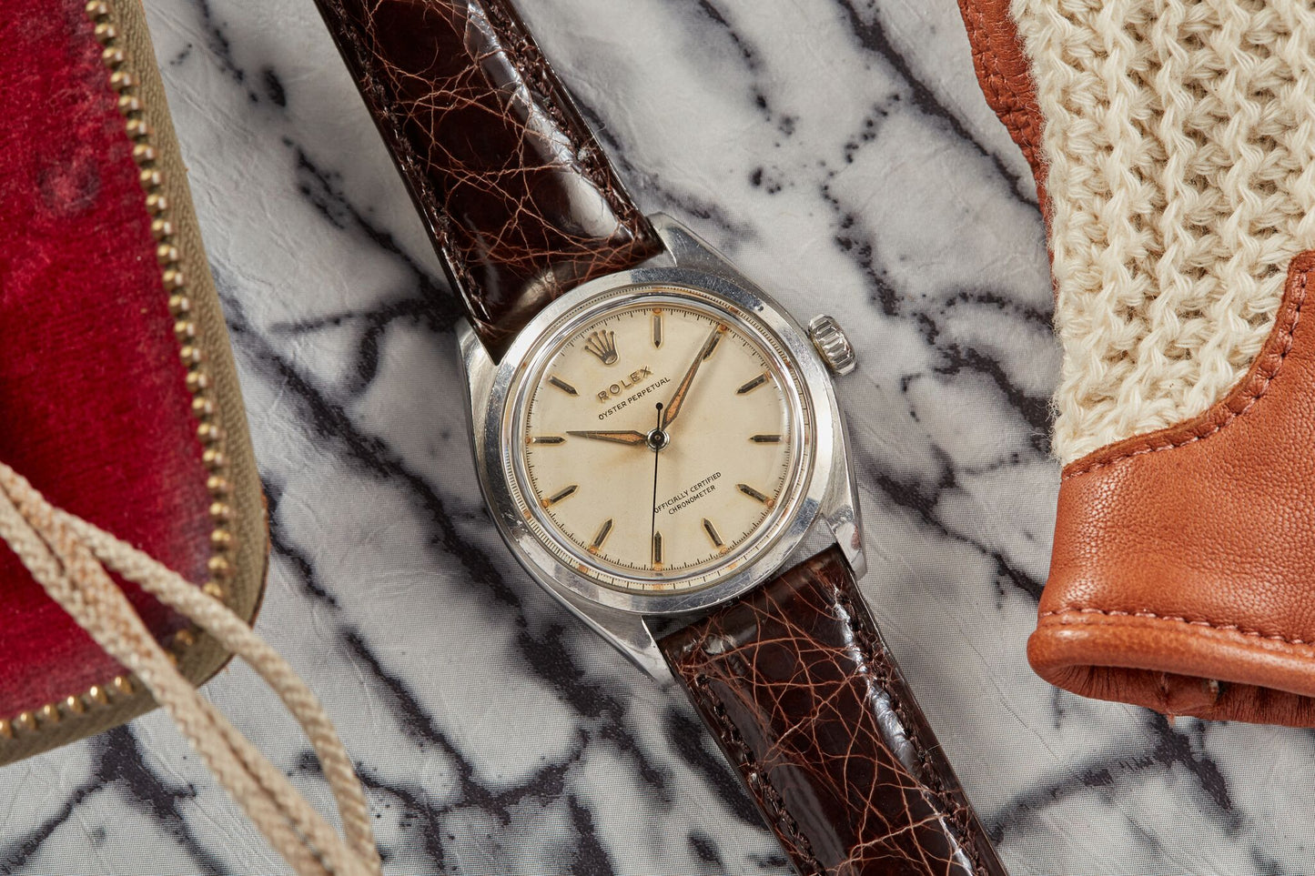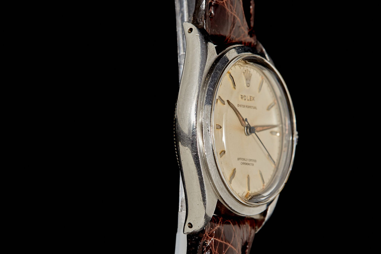 This watch, a Reference 6084 Oyster Perpetual dates to approximately 1953, and is loaded to the hilt with all the goodness you could possibly hope for in a mid-century Rolex. It possesses a 'semi-bubbleback' case of the type used by the manufacture from the 1930s to the 1950s; a prototypical Oyster case with an oversized 'bubble' case back to accommodate the oversized automatic calibres used in the era. Its silver satin dial has patinated to a soft cream tone and shows light radium burn from the luminous material in the alpha-style handset.