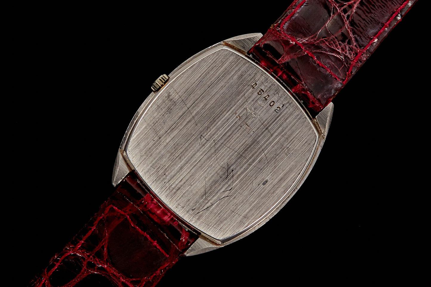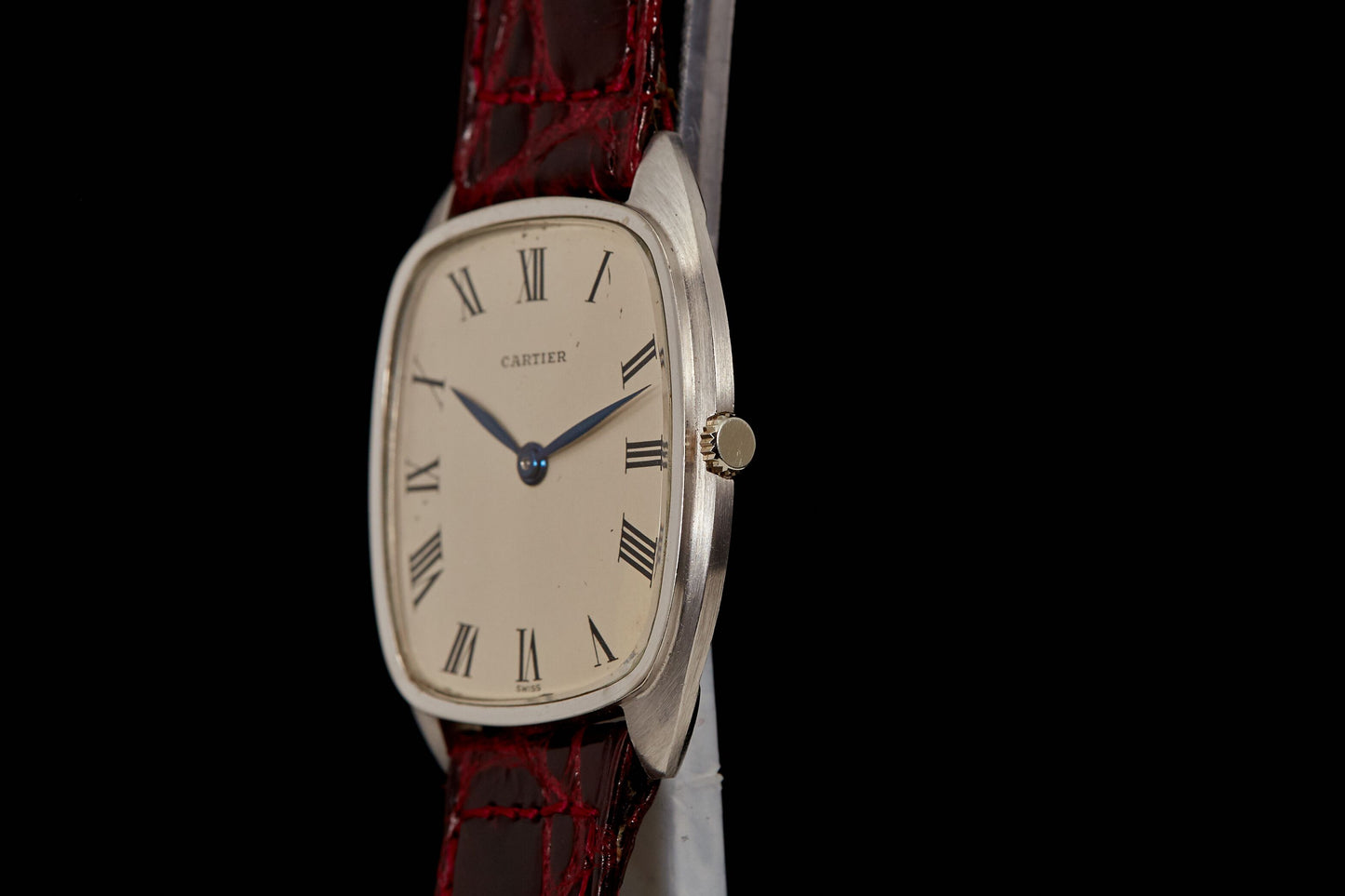 This elegant white gold Cartier dress watch is a perfectly example of the Maison's ability to create perfectly balanced timepieces which both striking and simple. Its softly cream colored dial is accentuated by clean roman numerals, beautiful blued steel hands, and that legendary name. As though the design wasn't appealing enough, the Calibre 2003 manually winding movement was supplied by none other than Audemars-Piguet.