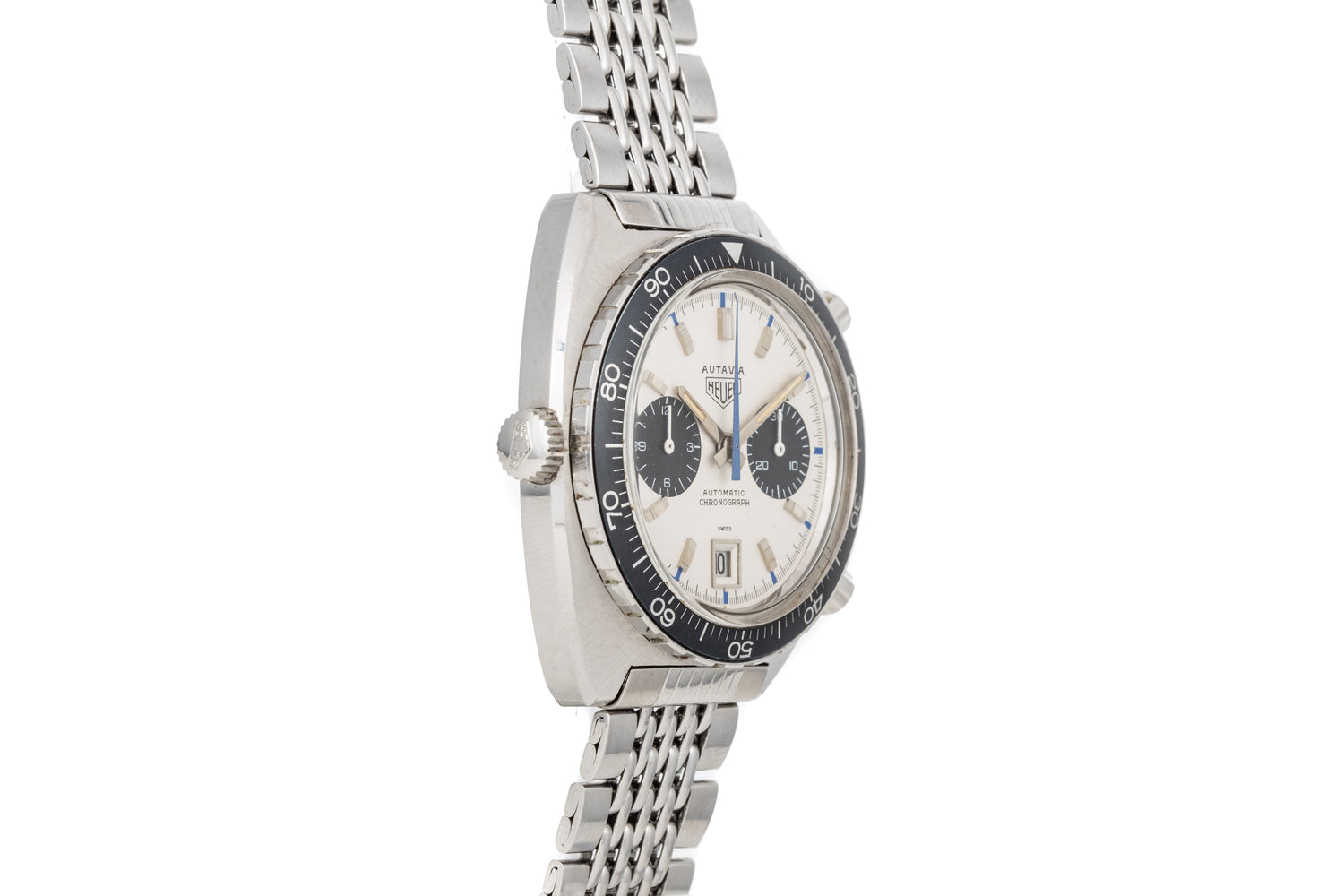For many collectors, the “Jo Siffert” Autavia Reference 1163 is the Autavia to own. Aesthetically and technically, it has it all. It combines the game-changing Chronomatic movement with a cushion case that’s eminently comfortable on the wrist, as well as a sprightly color way marked by the bright blue of the chronograph hand.