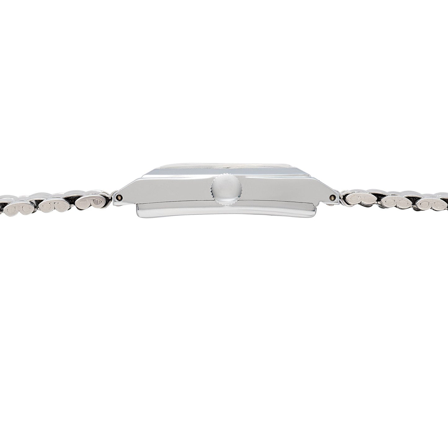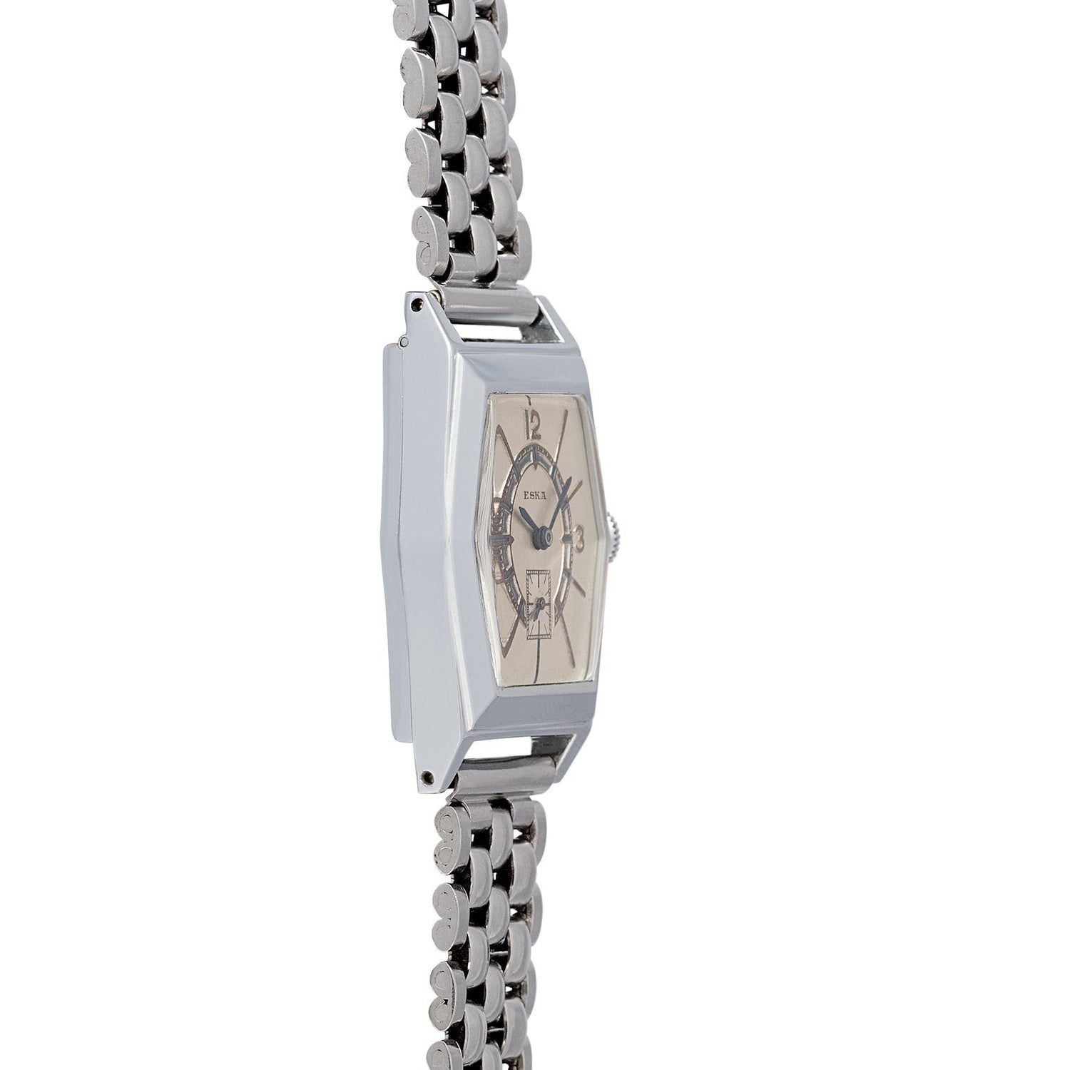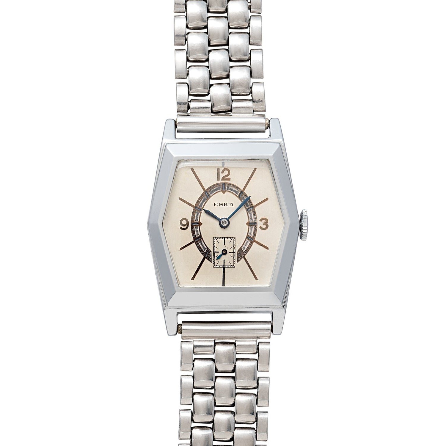 This Eska dress watch is a divine product of that era, featuring a hexagonal stainless steel case with a slender silhouette, polished bezel, an acrylic crystal and an unsigned crown. Its stunning, simple dial is a a microcosm of the entire Art Deco concept. It features a brushed silver tone, applied gold indices, a minute track with blue accents, a subsidiary seconds register at 6 o’clock and a matching, blued-steel handset. With sharp case lines and soft dial features, it is a supremely elegant clash of styles — in the only way an Art Deco piece could pull off.