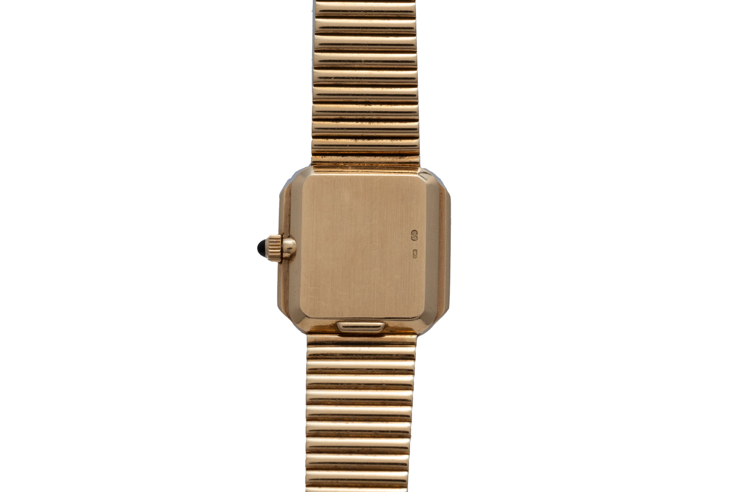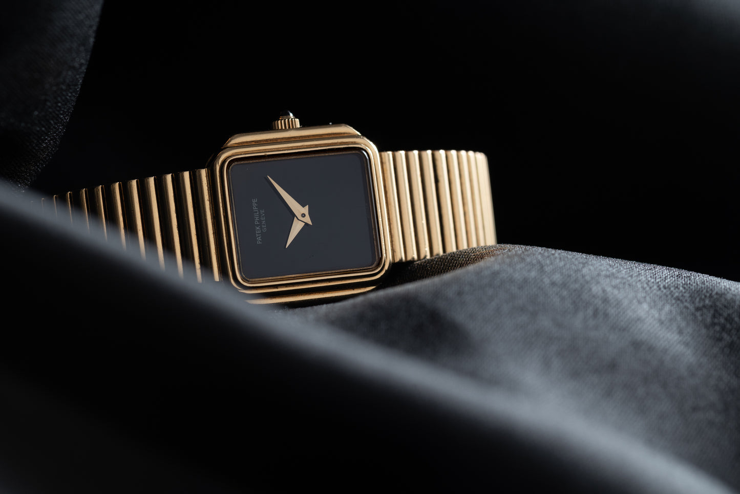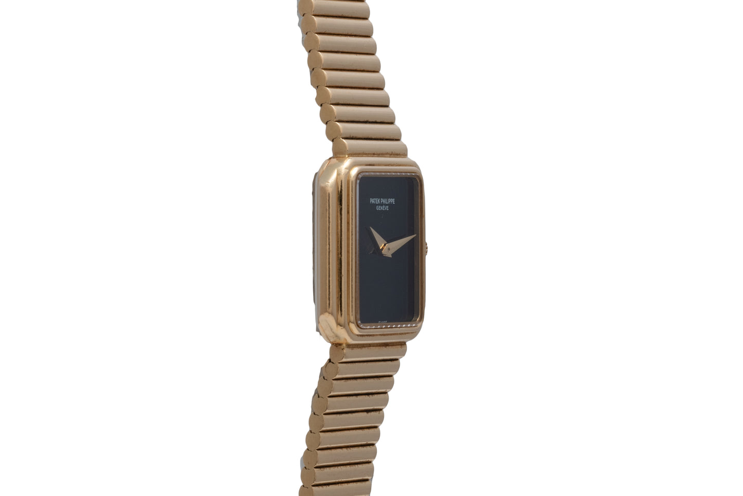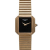 This piece, a Reference 4429/1J, dates back to the 1980s and features an 18k yellow gold stepped rectangular case with an integrated textured bracelet and a polished black onyx stone dial with a matching ‘dauphine’ handset.
