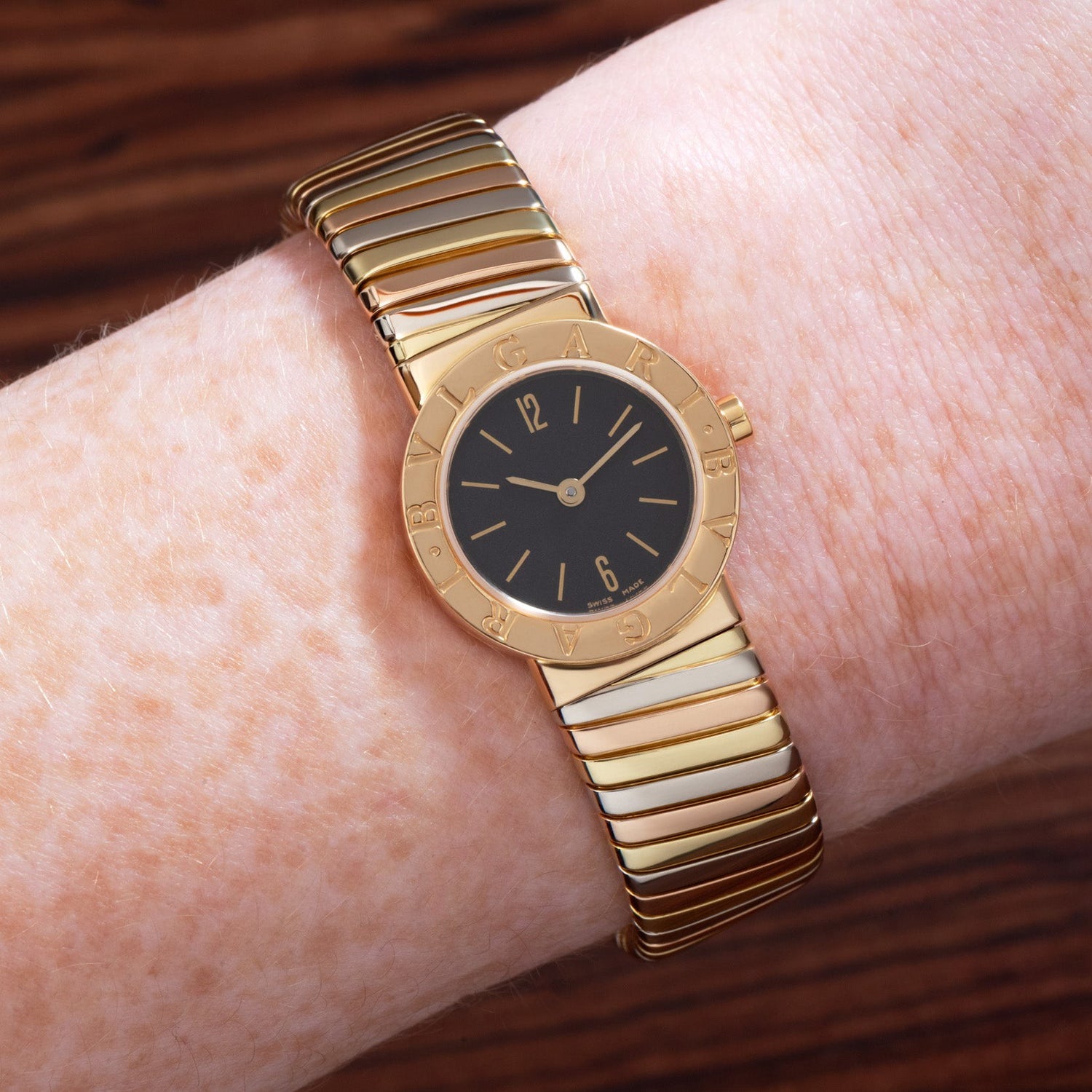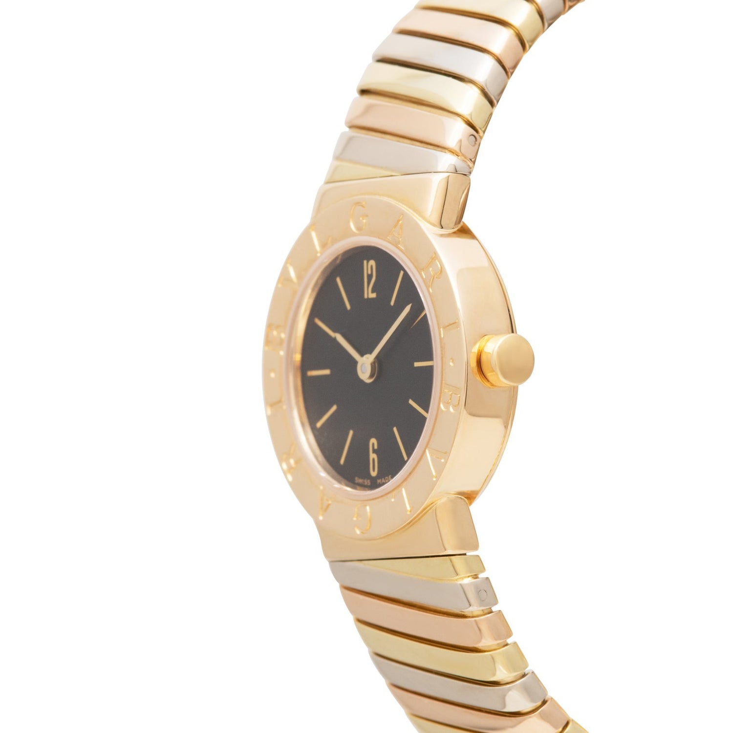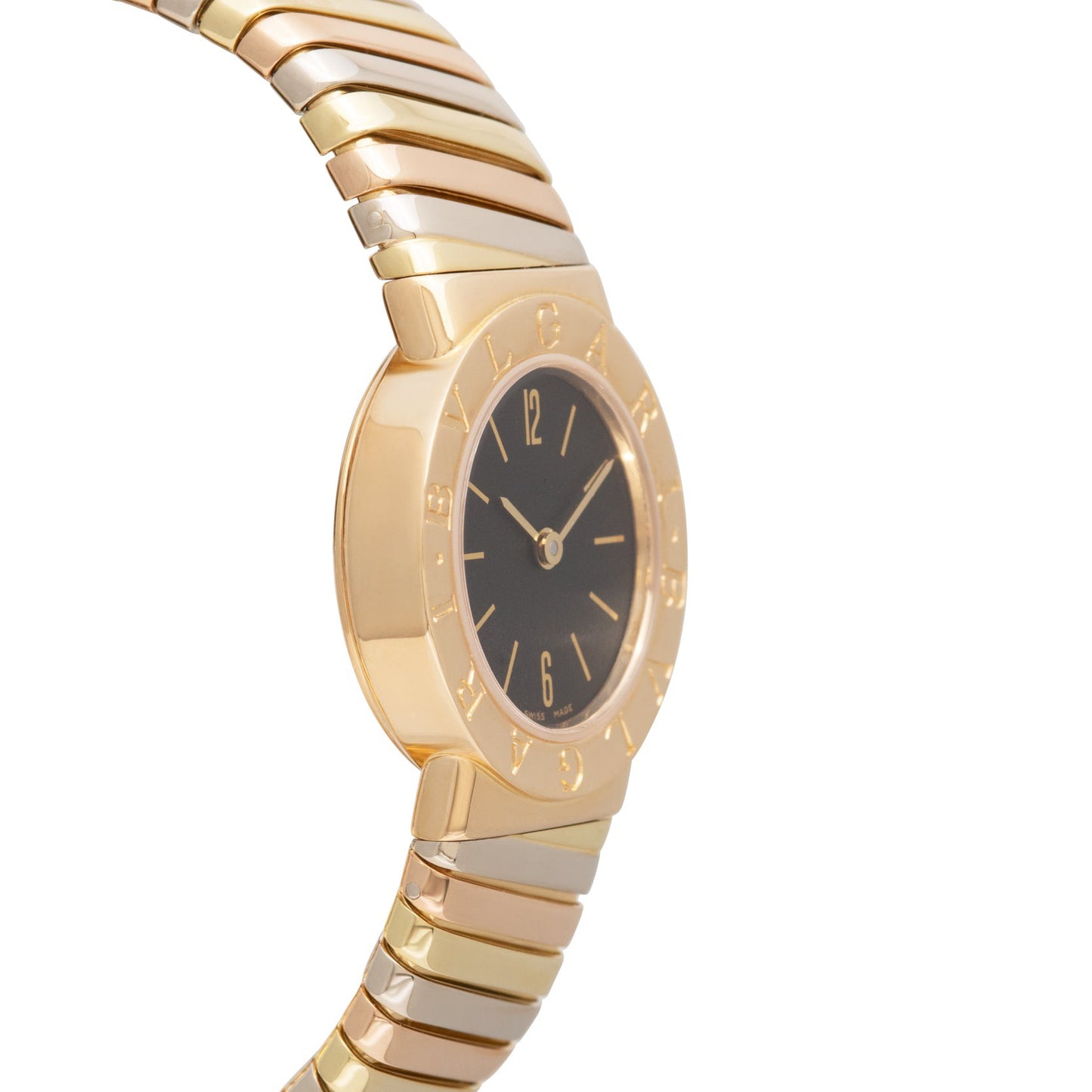 Bulgari is one of few companies whose thoughtful ladies’ watches have risen to the top –– perhaps because of the firm’s background as a jeweler. This particular piece, a Reference BB 23 2T, features a 22mm 18k yellow, rose, and white gold 'Tri Tone' case with a bezel engraved ‘BVLGARI BVLGARI’, a matte black dial with applied gold indices, a matching ‘pencil’ handset’ and an equally stunning Tri-Tone ‘Tubogas’ cuff bracelet.