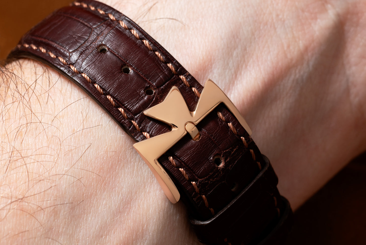It comes fitted to a signed brown leather alligator strap equipped with a signed 18k white gold pin buckle and is powered by the hand-wound Calibre 2455. Viewable through a sapphire exhibition caseback, this chronometer certified movement features exquisite finishing and offers a 40-hour power reserve.