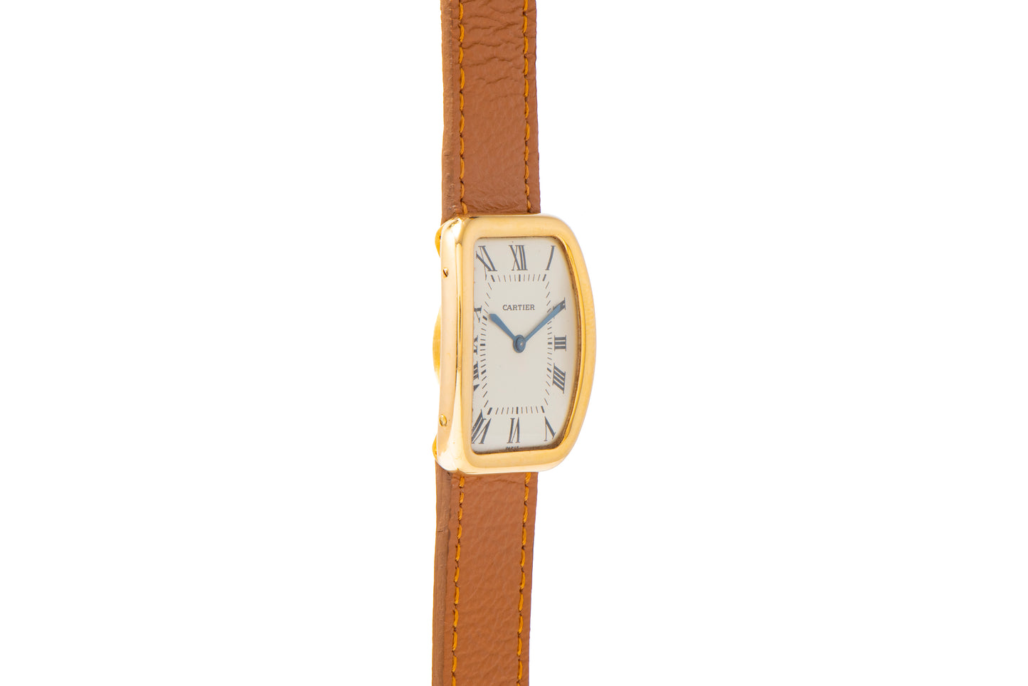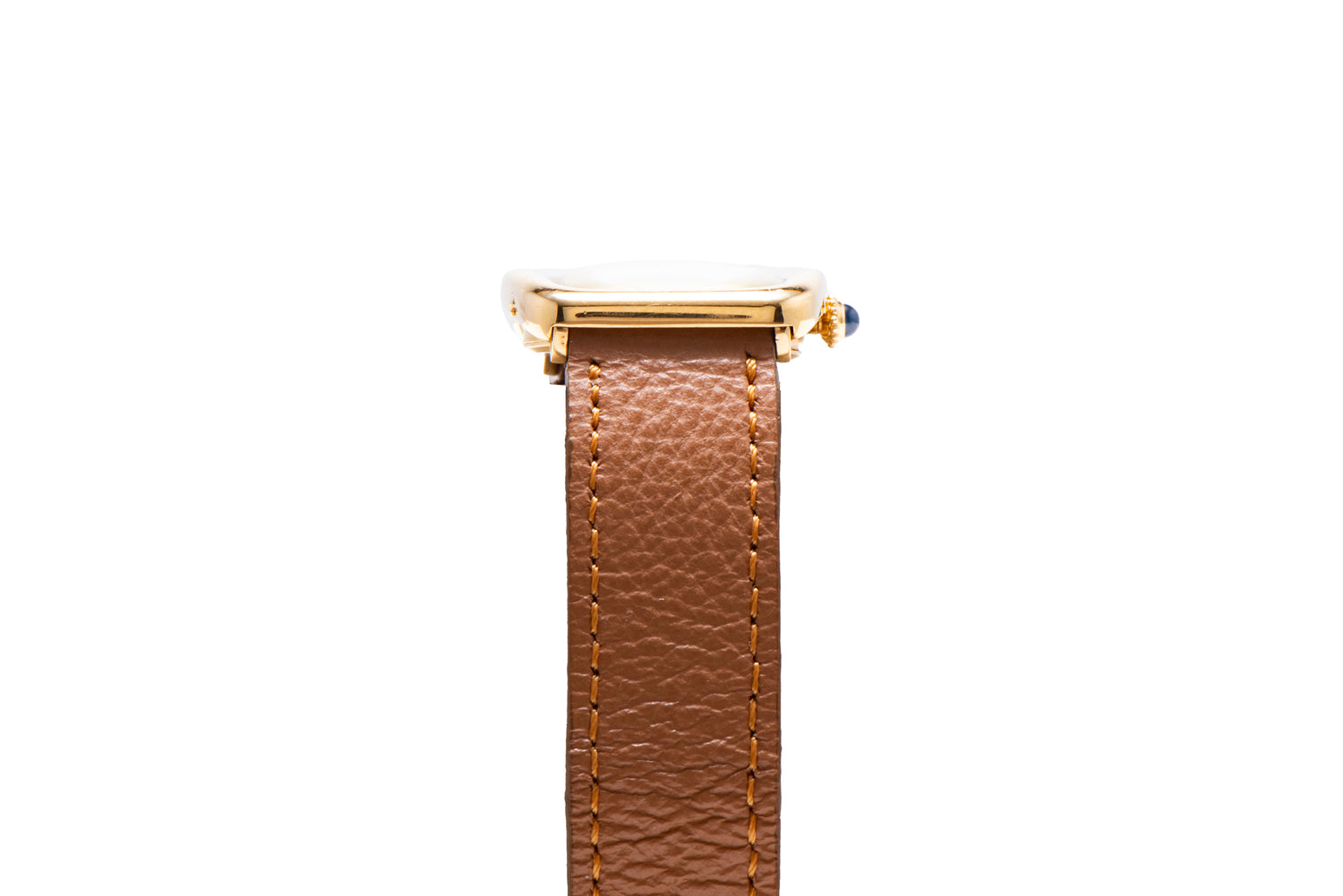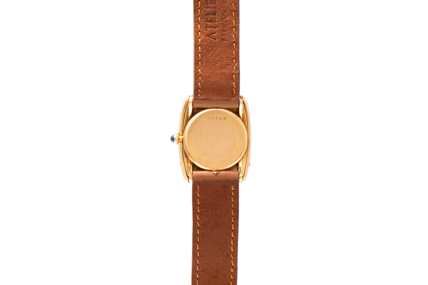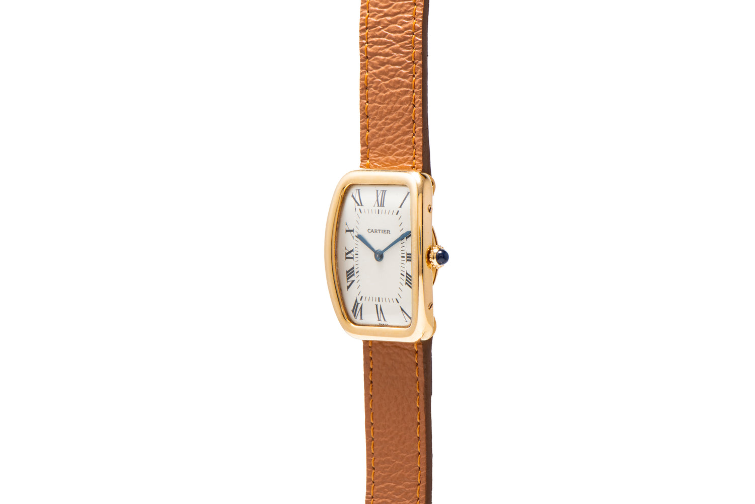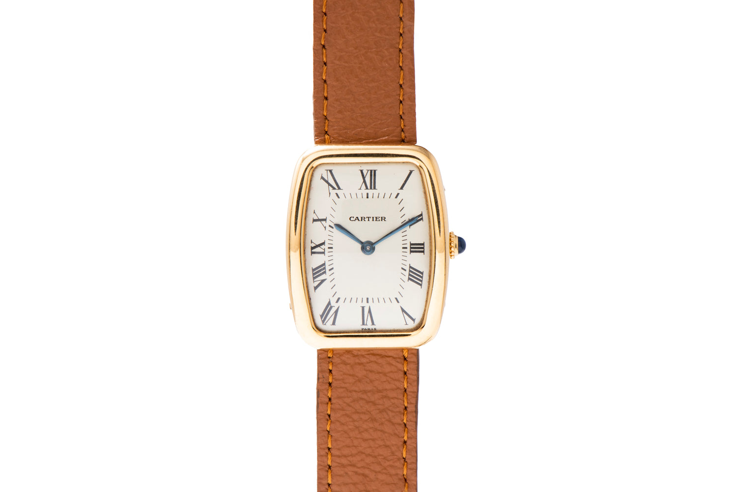 This elegant yellow gold Cartier dress piece from the 1960s— known as an Incurvé – is a perfect example of the maison’s ability to create perfectly balanced timepieces which are striking in their simplicity. It features a 26mm x 33mm yellow gold case with a rounded bezel, a set of cleverly hidden lugs which gives the case an uninterrupted presence, and the brand’s signature cabochon crown. The stunning Paris-signed silvered ivory dial features a fine eggshell texture and clean printed ‘Roman’ indices, an inner minute track, and a lovely blued steel handset.