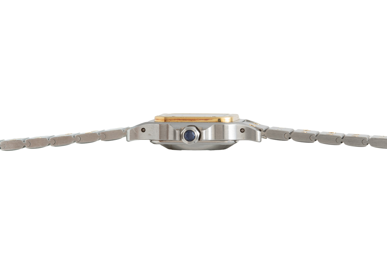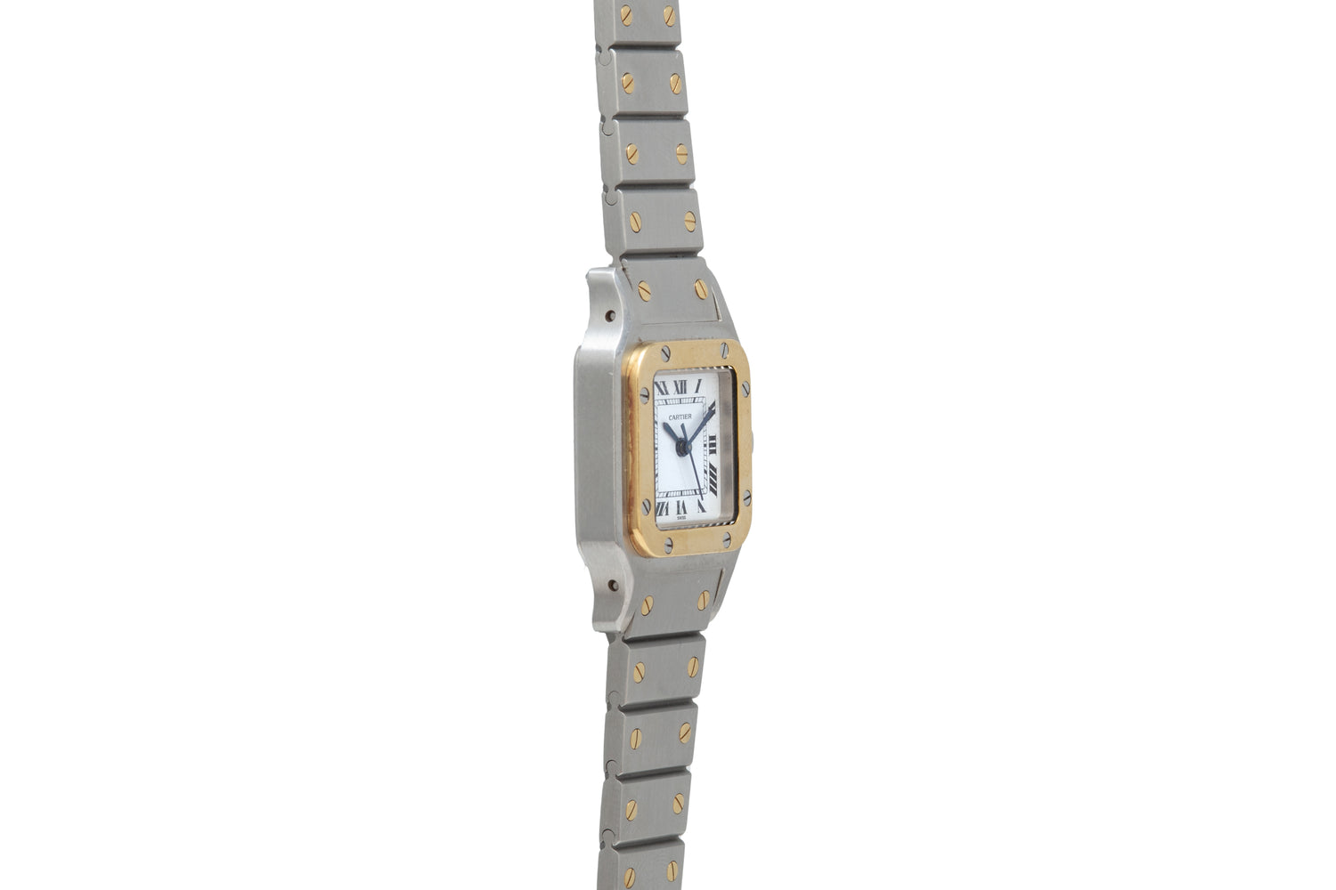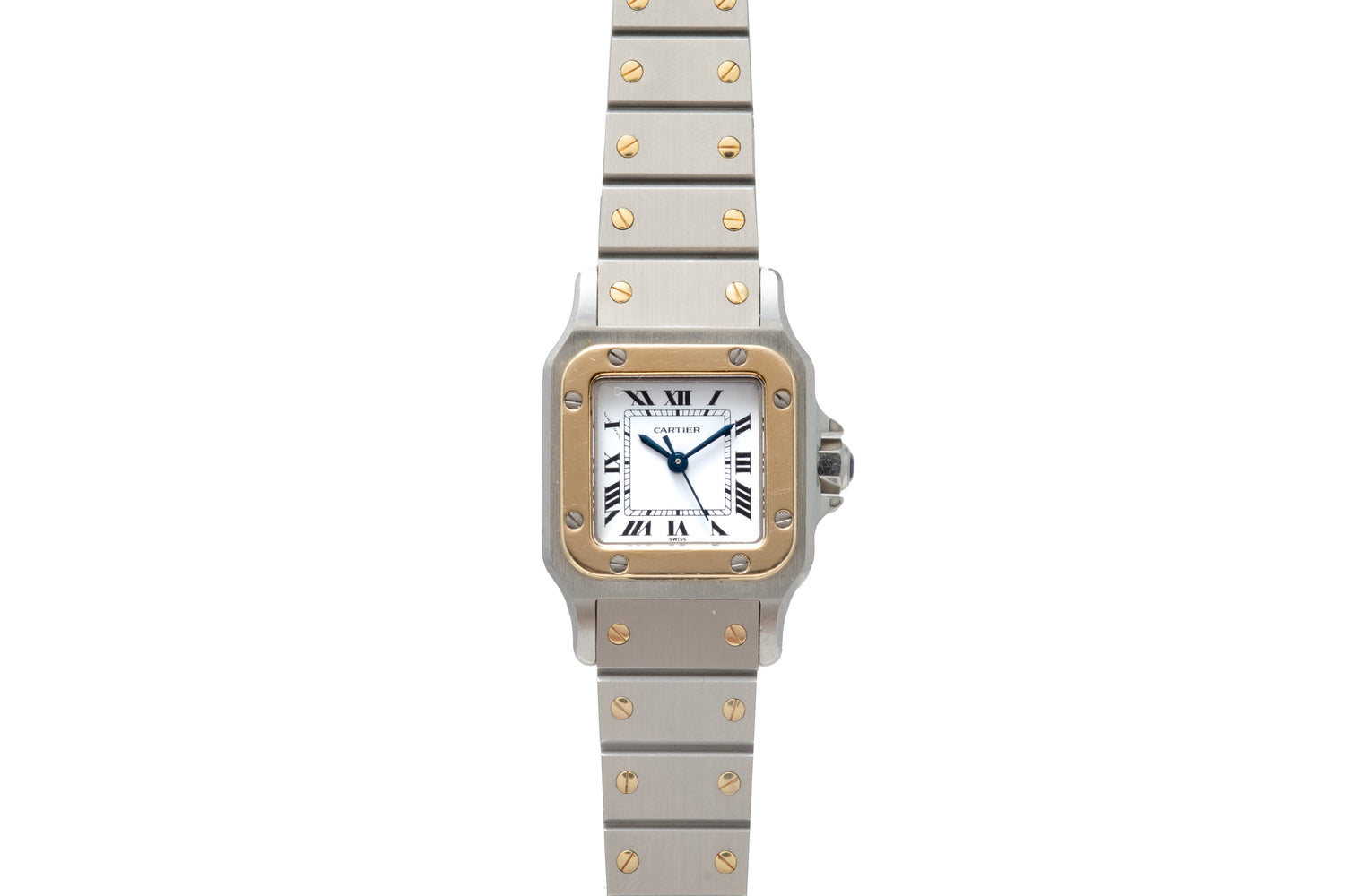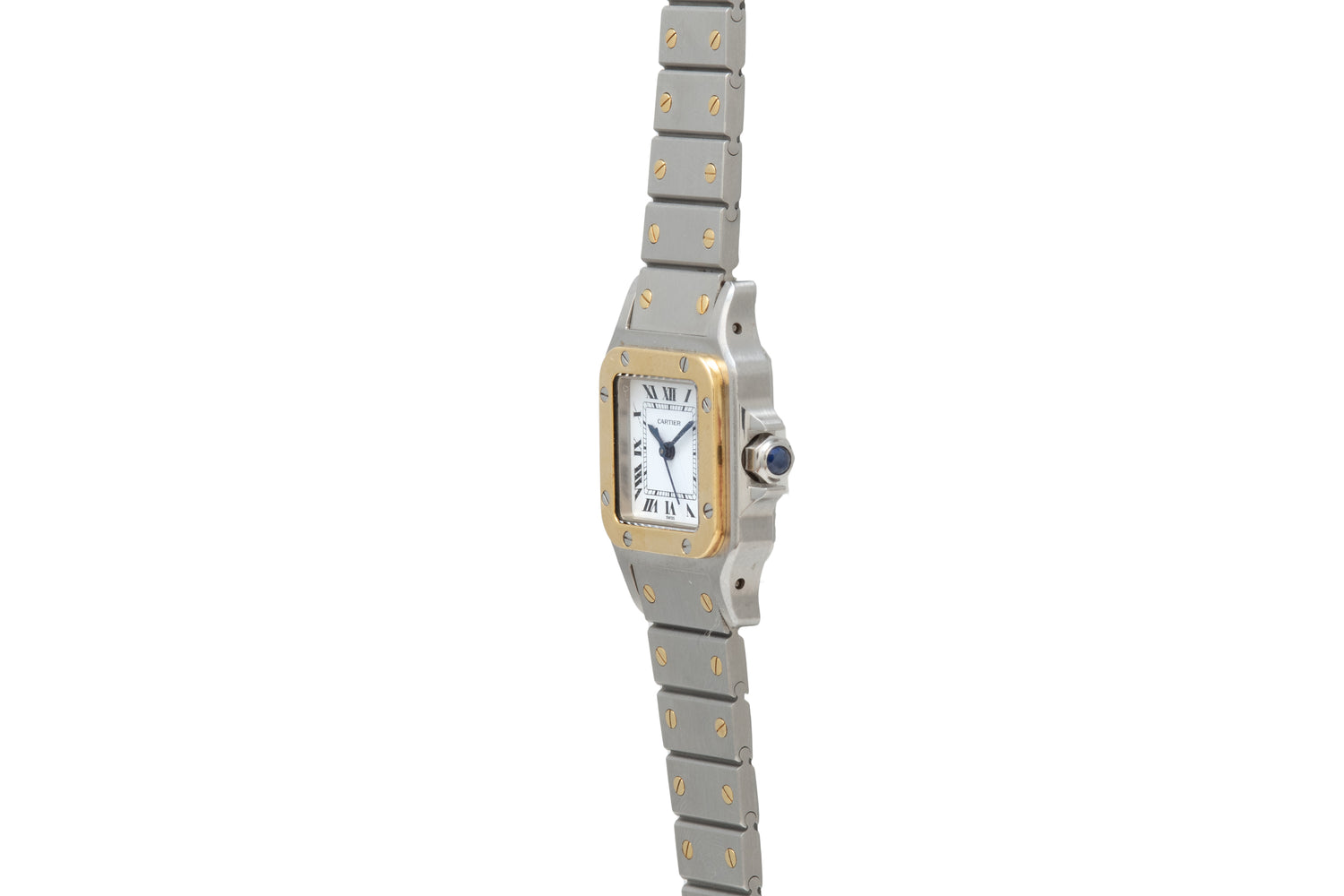 This particular Santos dates to the 1990s and features a svelte 24mm stainless steel and 18k yellow gold case with an excellent matching two-tone bracelet, sapphire crystal, sapphire cabochon crown, and a gloss white dial with printed black ‘Roman’ indices and a matching blued-steel ‘sword’ handset.