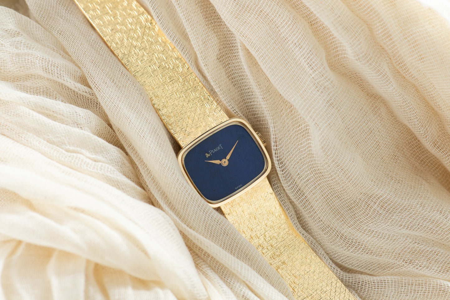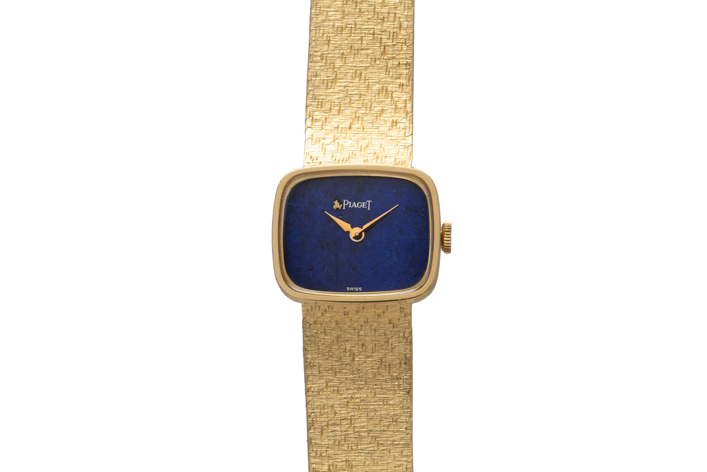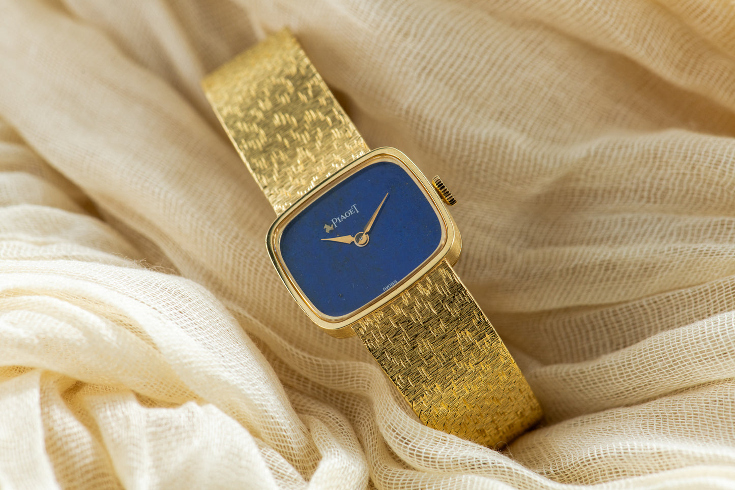 Housed in a 21mm, 18k yellow gold ‘TV’ case with a matching integrated yellow gold bracelet with ‘bark’ finishing and sa igned clasp, this piece features a standout blue 'Lapis Lazuli' stone dial with a matching 'dauphine' handset, stylized Piaget signature, a mineral crystal, and an ultra thin manual winding movement.