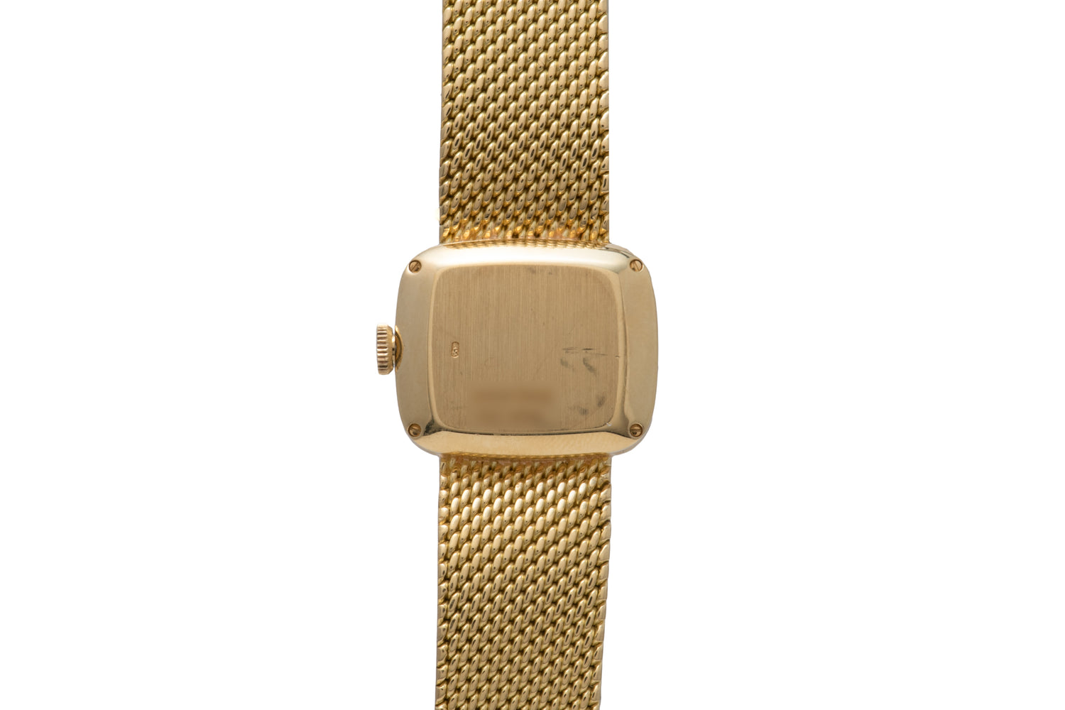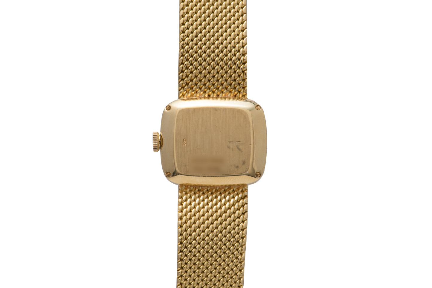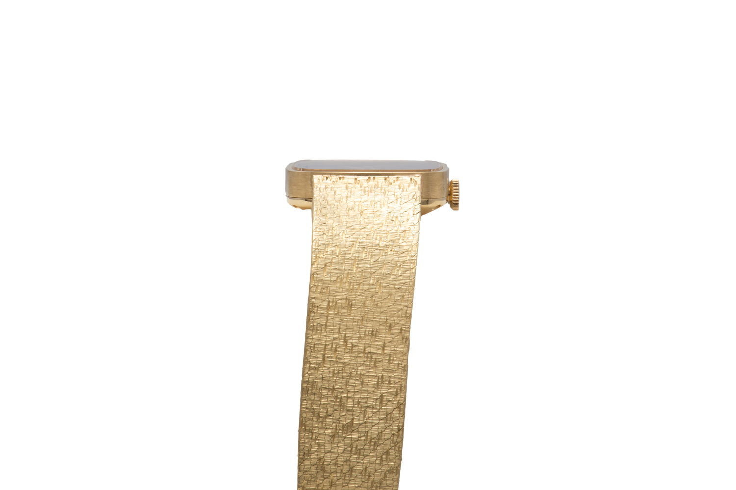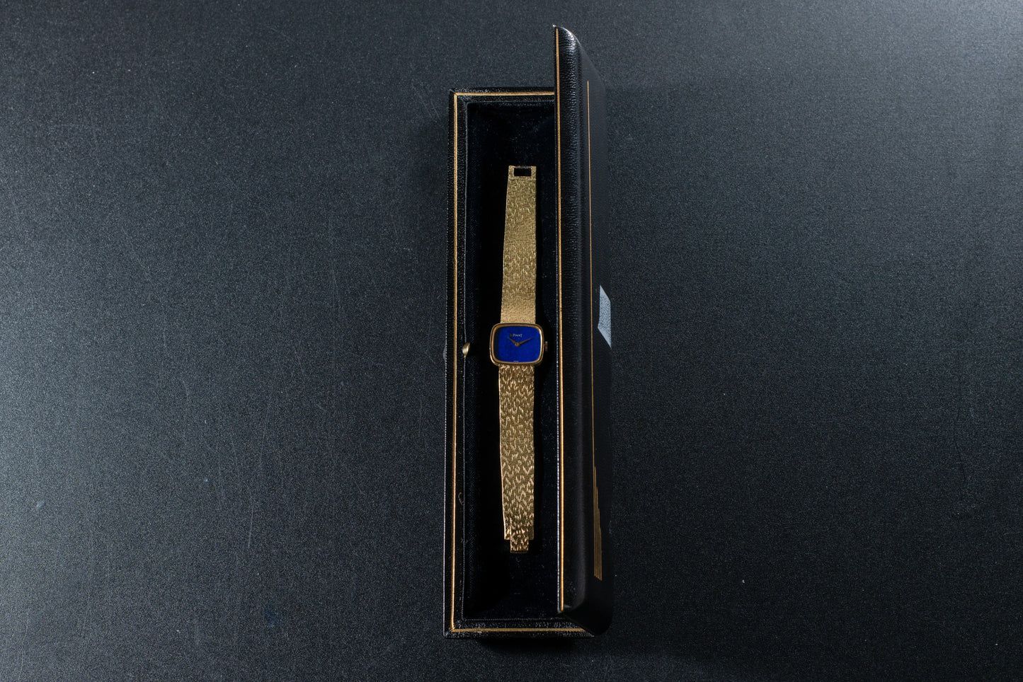Housed in a 21mm, 18k yellow gold ‘TV’ case with a matching integrated yellow gold bracelet with ‘bark’ finishing and sa igned clasp, this piece features a standout blue 'Lapis Lazuli' stone dial with a matching 'dauphine' handset, stylized Piaget signature, a mineral crystal, and an ultra thin manual winding movement.