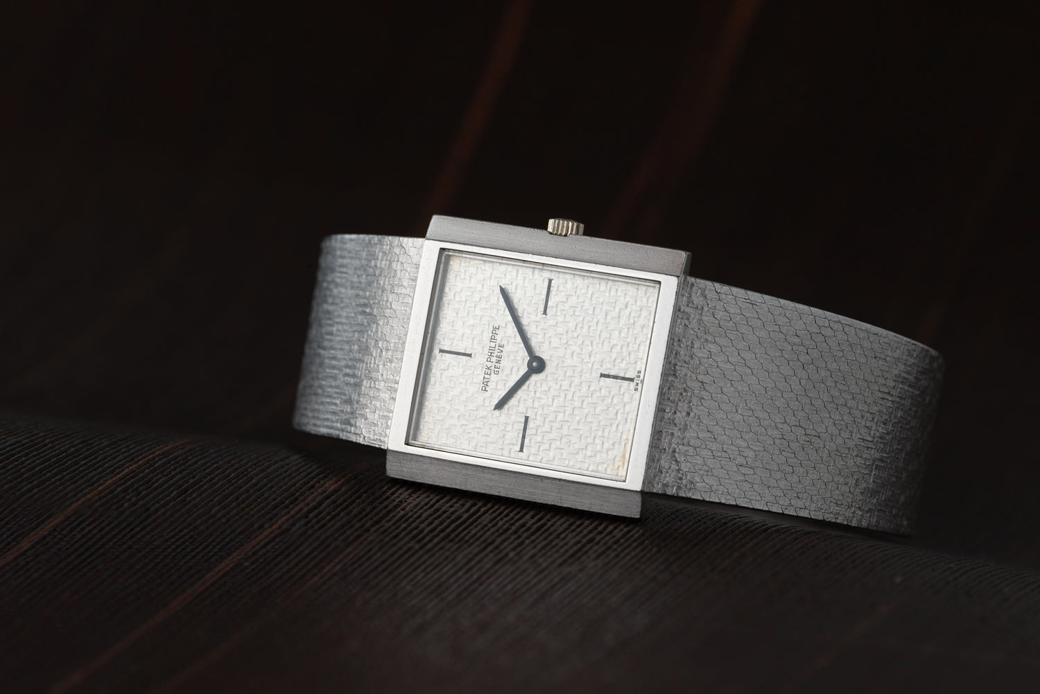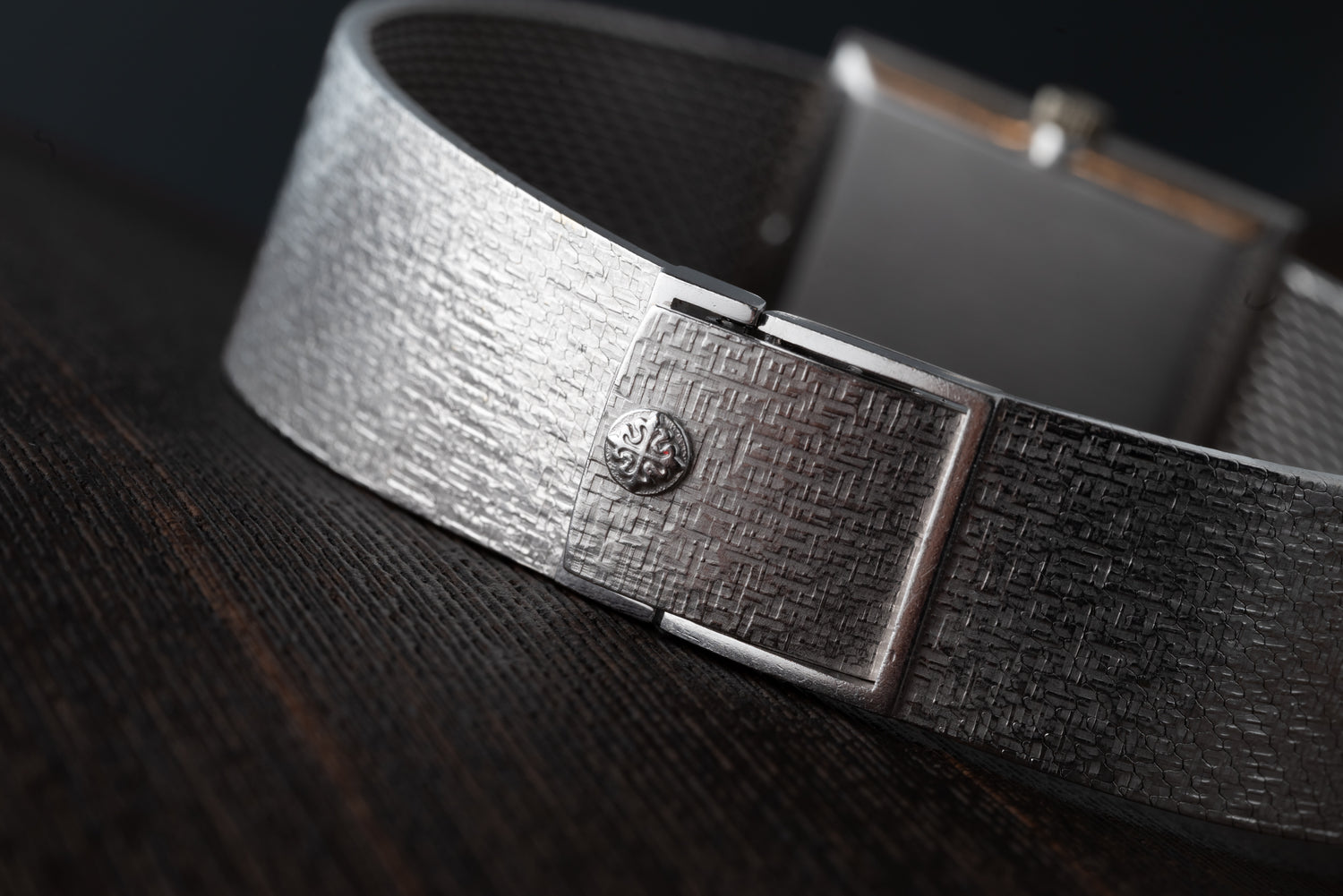 Dating to the 1970s, this lovely piece features a 26mm x 26mm square 18k white gold case fitted to an integrated 18k textured bracelet with a signed hook and lock clasp, a signed crown, and Patek’s manual-winding Calibre 175 — an ultra-thin work of art from the maison. The showstopper is its incredible silver tone hammered dial that offers more depth and dynamism than a standard matte, gloss, or sunburst offering more commonly seen. The dial is accented by a set of black baton markers at quadrant positions and a matching blackened steel ‘pencil’ handset.