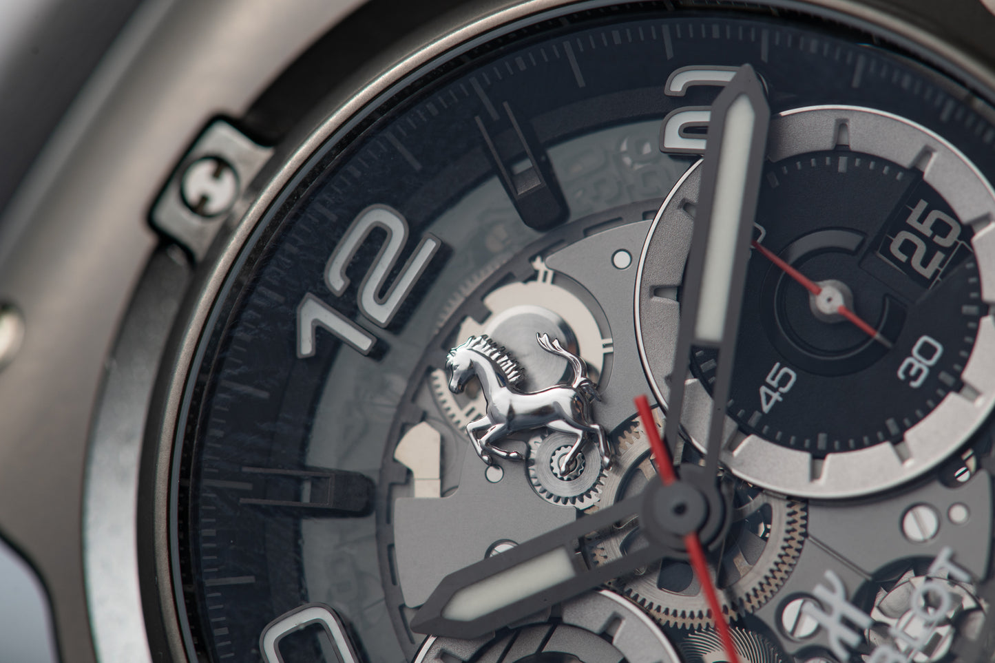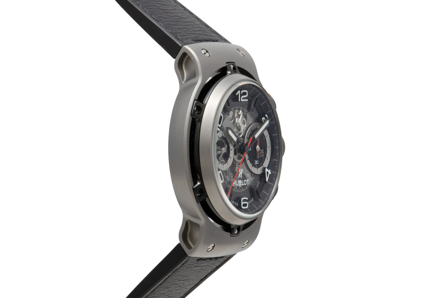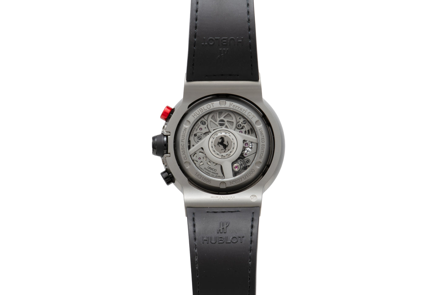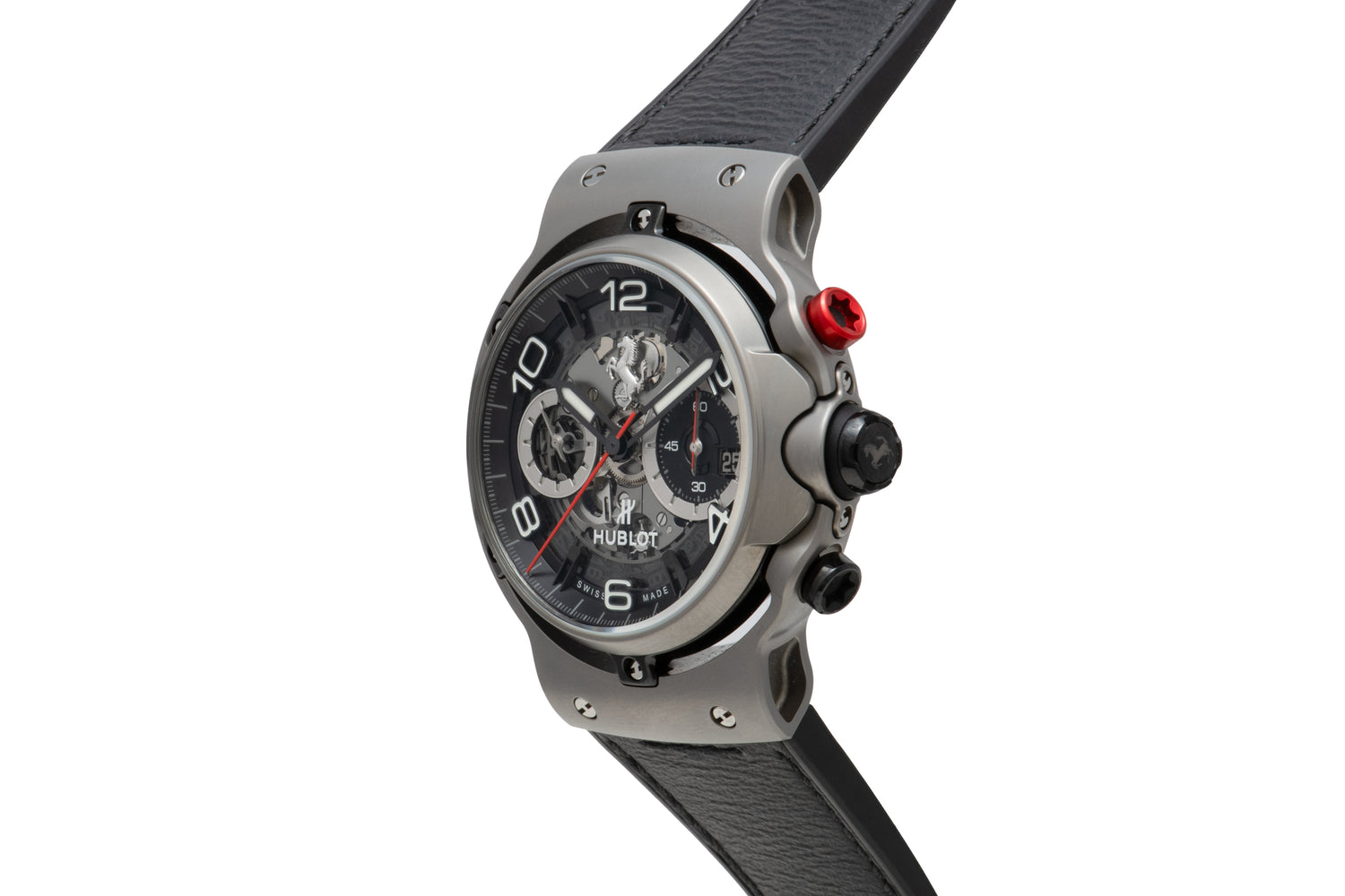 This particular example, a Hublot Classic Fusion Ferrari GT Limited Edition from the 2020s, remains is in virtually unworn condition and comes complete with its boxes, books, and paperwork. Housed in a 45mm titanium case with a screw-down bezel, a ‘prancing horse’-signed crown, black and red chronograph pushers, and a sapphire crystal, it features a skeletonized dial with white ‘Arabic’ indices, a matching, luminous ‘sword’ handset, a dual-register chronograph layout, and a date window at 3 o’clock.