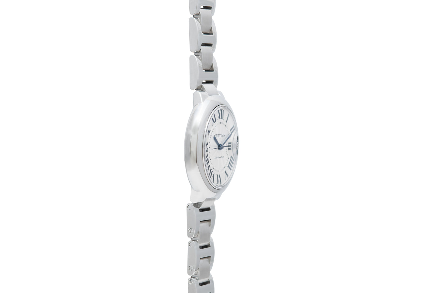 This Ballon Bleu, a Reference WSBB0044, is housed in a 33mm stainless steel case with a sapphire crystal and a guarded sapphire cabochon crown. It features a silver guilloché dial with printed black Roman indices, a blued-steel 'sword' handset, and an inner minute track. Powered by an automatic movement, it comes paired to an integrated multi-link stainless steel bracelet with a signed hidden deployant clasp.