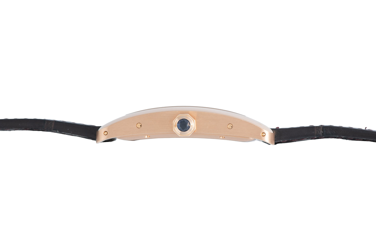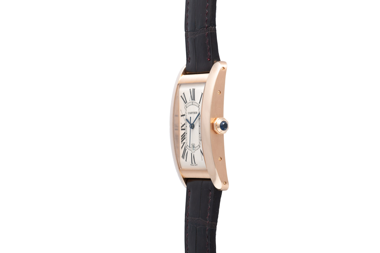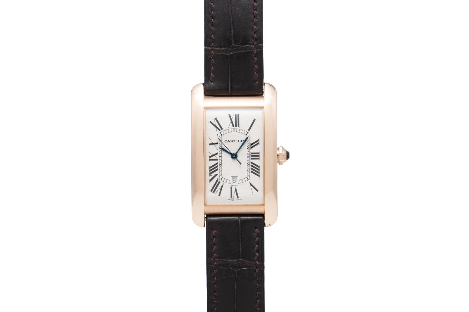 This particular Americaine, a 'Large' sized Reference 2505, features a 27mm 18k rose gold case with a curved sapphire crystal, a non-luminous silver guilloche dial with printed ‘Roman’ indices, blued-steel ‘sword’ handset, a date window at 6 o’clock, a hidden signature within the 7 o’clock hour marker and Cartier's ubiquitous sapphire cabochon winding crown.