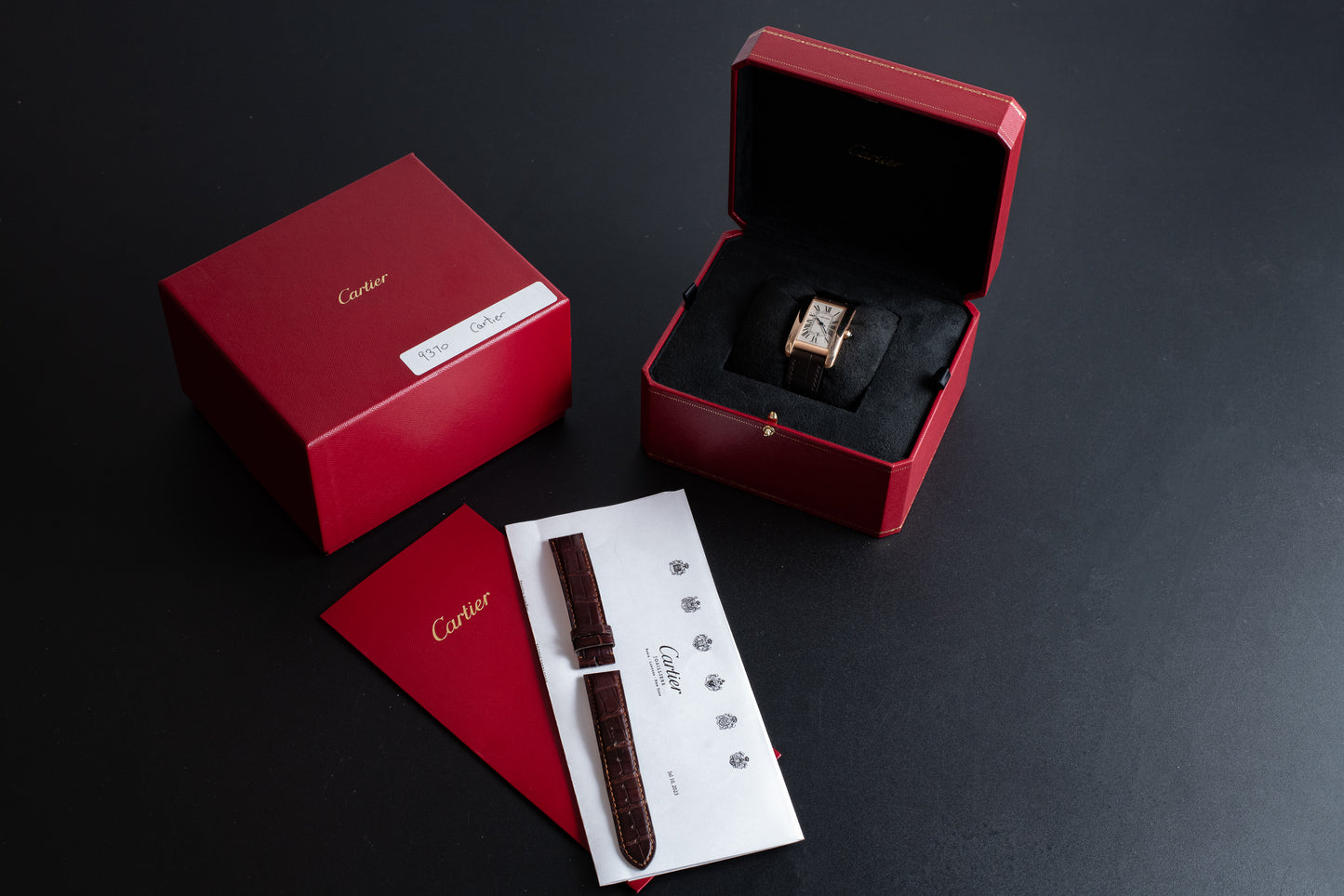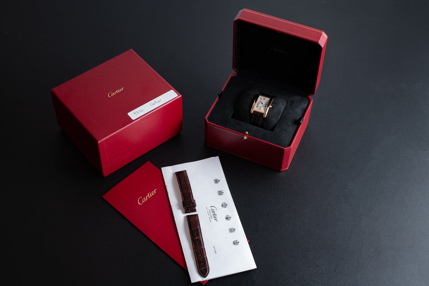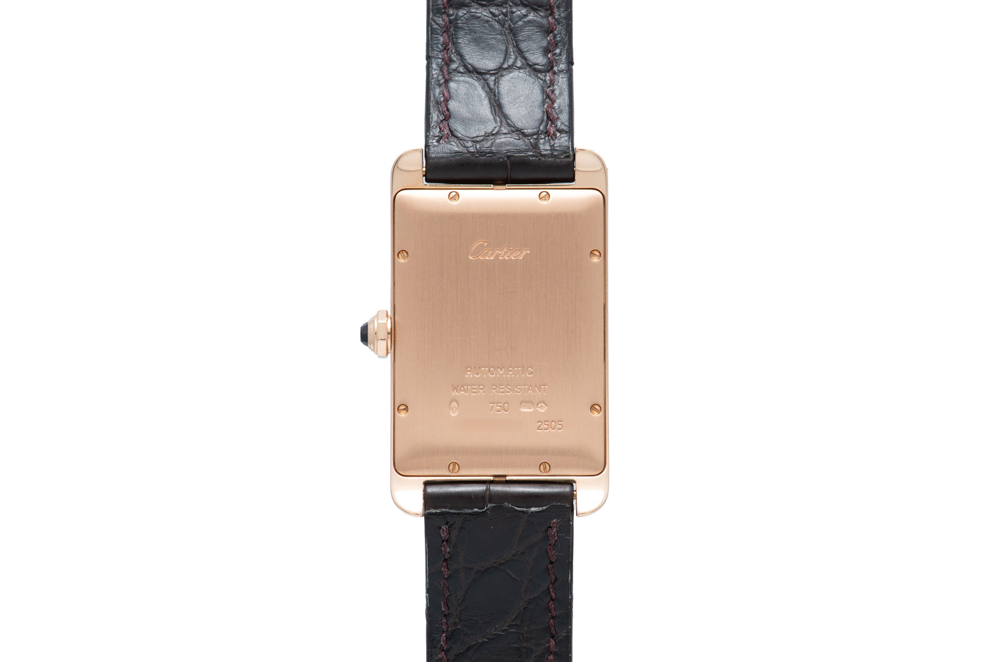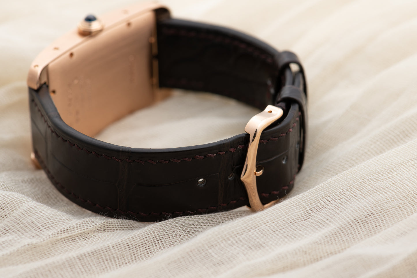 It’s comes paired to a Cartier signed brown alligator leather strap with a signed 18k rose gold ardillon pin buckle, a self-winding movement, its inner and outer box set, spare strap, and service paperwork from Cartier dated 2023.