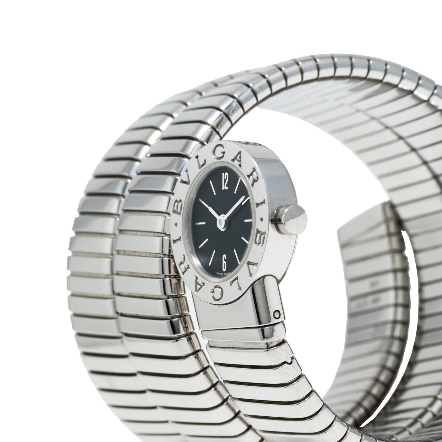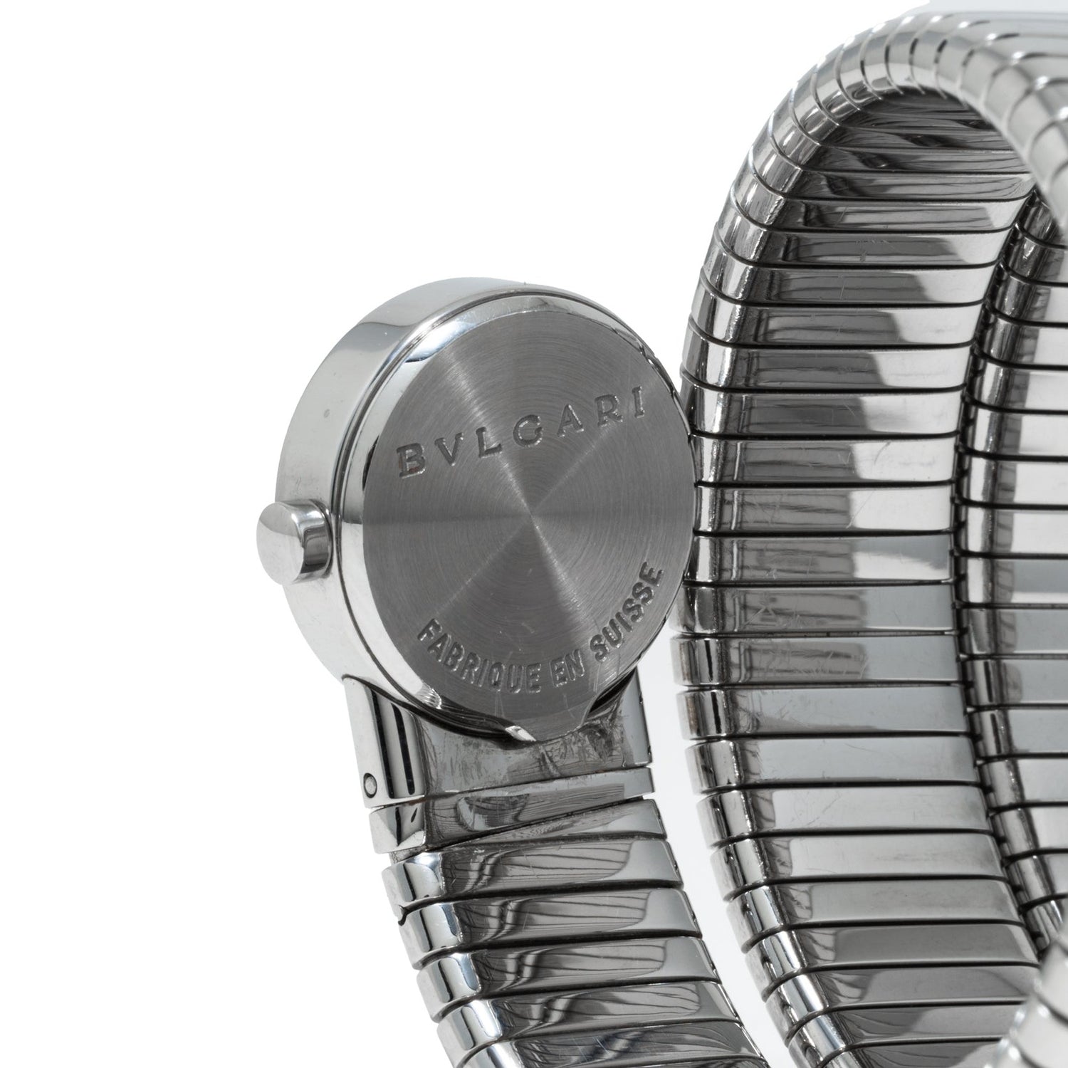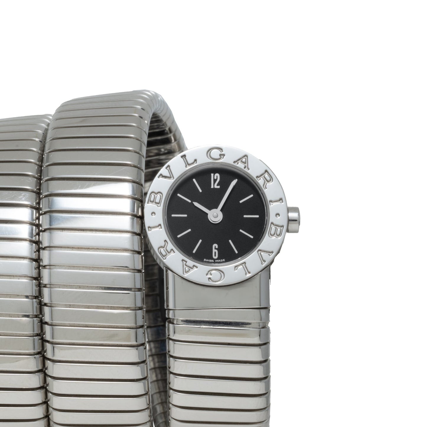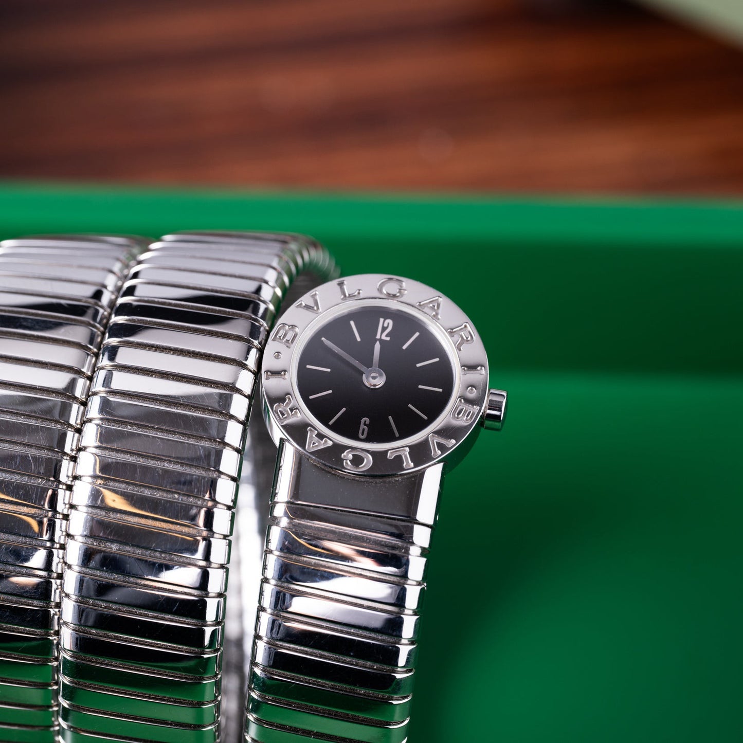 This timepiece dates to circa the 2000s and offers a fanciful twist on the Serpenti theme in the form of a more conventionally-shaped watch head. Measuring at 19mm in diameter, it features a white gold case and “BVLGARI”-signed bezel with the collection’s signature integrated, wrap-around cuff bracelet. The watch head itself contains a sunburst black dial with applied indices, a matching 'sword' handset, and a quartz movement.