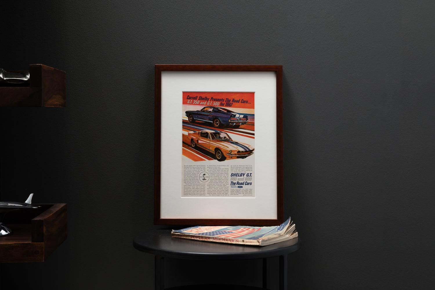 "Carroll Shelby presents the road cars...G.T. 350 and G.T. 500 for 1967." As was the case in this glorious style of mid-20th century advertising, this beautiful orange- and  blue-streaked page elucidates in detail the advantages and racing lineage of both cars, highlighting their speed and might. For someone who grew up during the heyday of American racing — or for a younger person who wishes he had seen such heady days himself — it's a transportive, intoxicating bit of imagery and copy.
