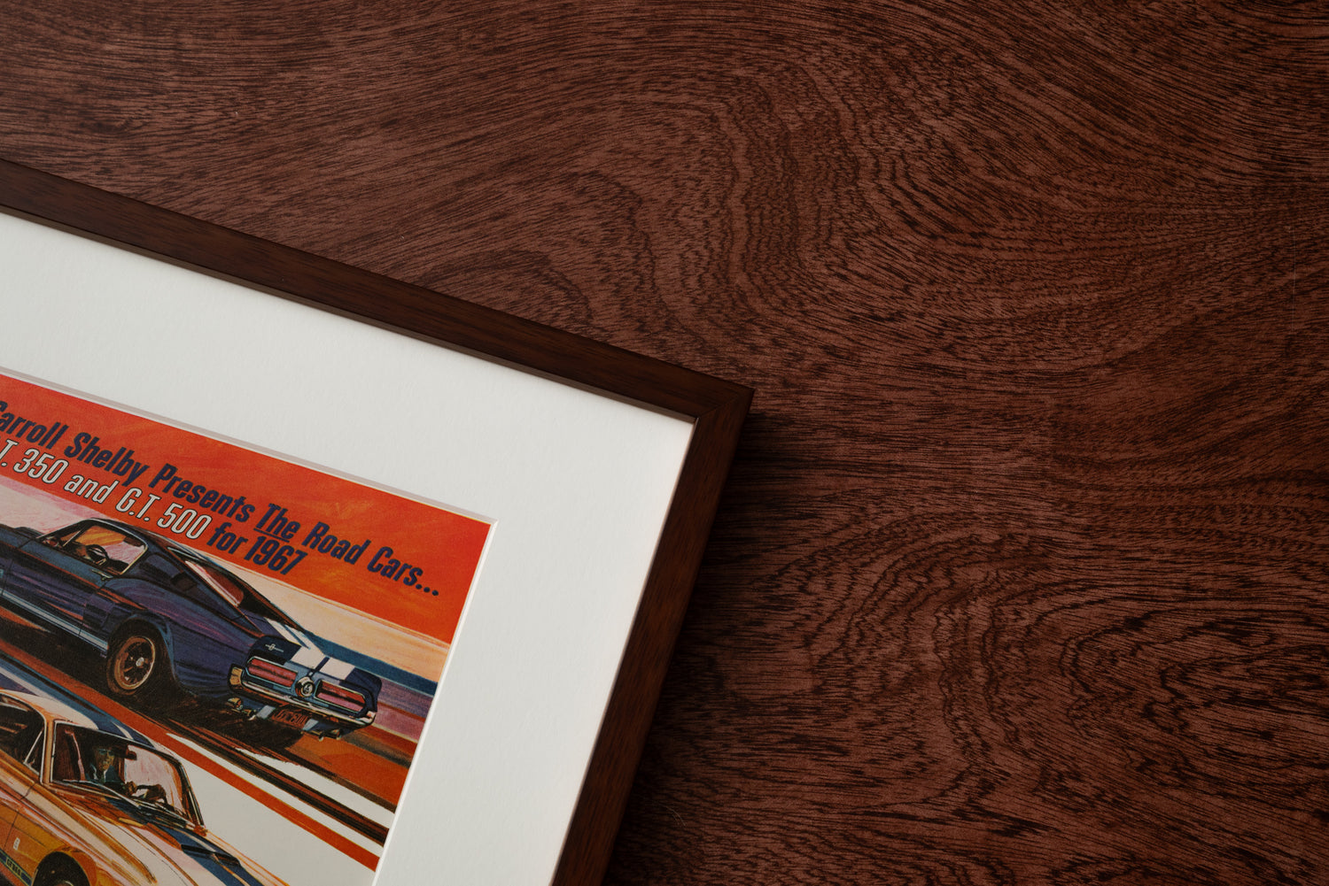 This ad is custom framed in a 12 3/8” x 15 1/2”  solid wood with walnut painted finish. It features a custom-measured, hand-cut 4-ply matte in cream, complimenting all the ad tones. Every material used is acid-free and the glass is anti-reflective and offers UV-protection to keep this precious ad preserved no matter where you decide to hang it up. Speaking of which, hanging your newly purchased ad is a seamless task, as this particular frame comes with an additional hanging wire and felt pads for wall protection.