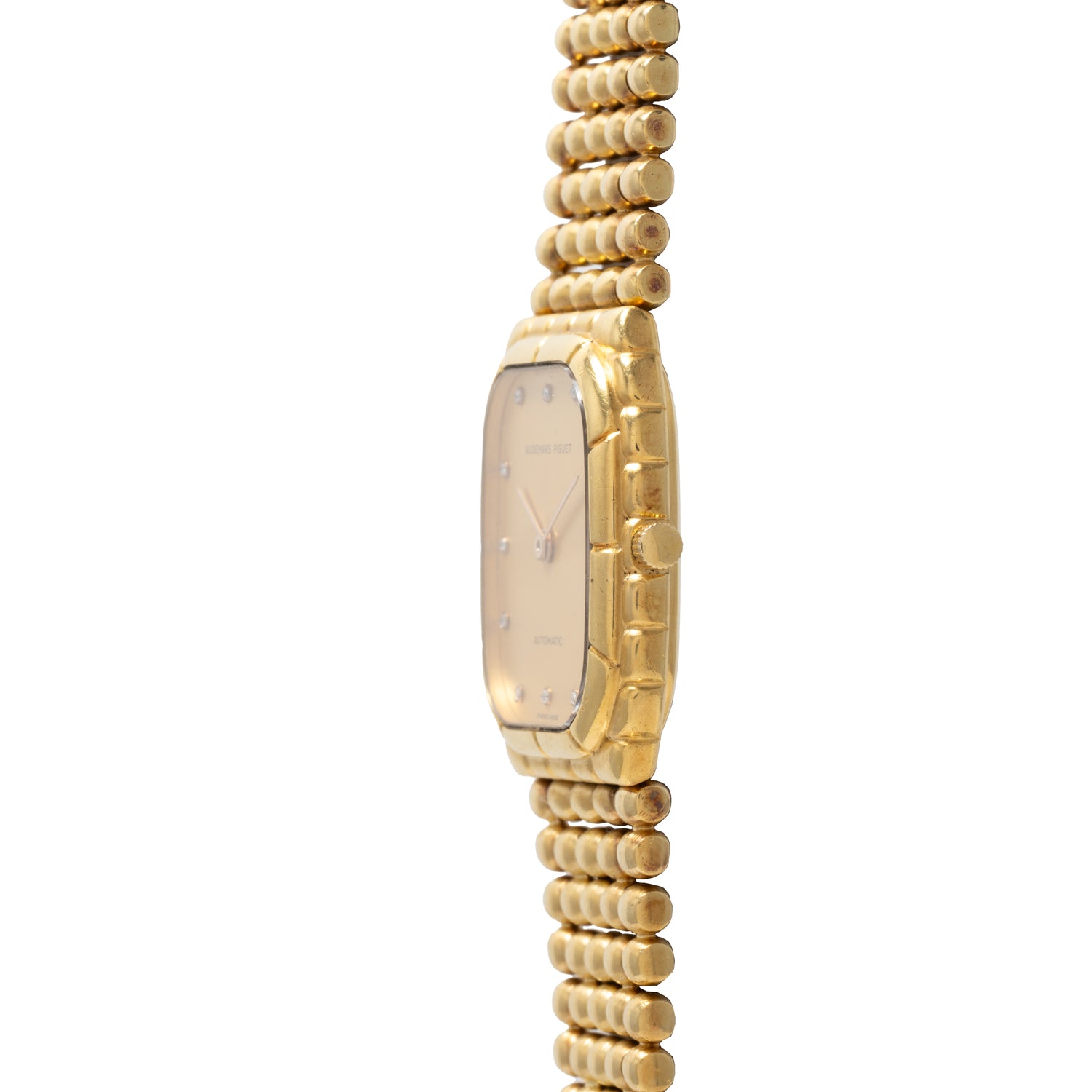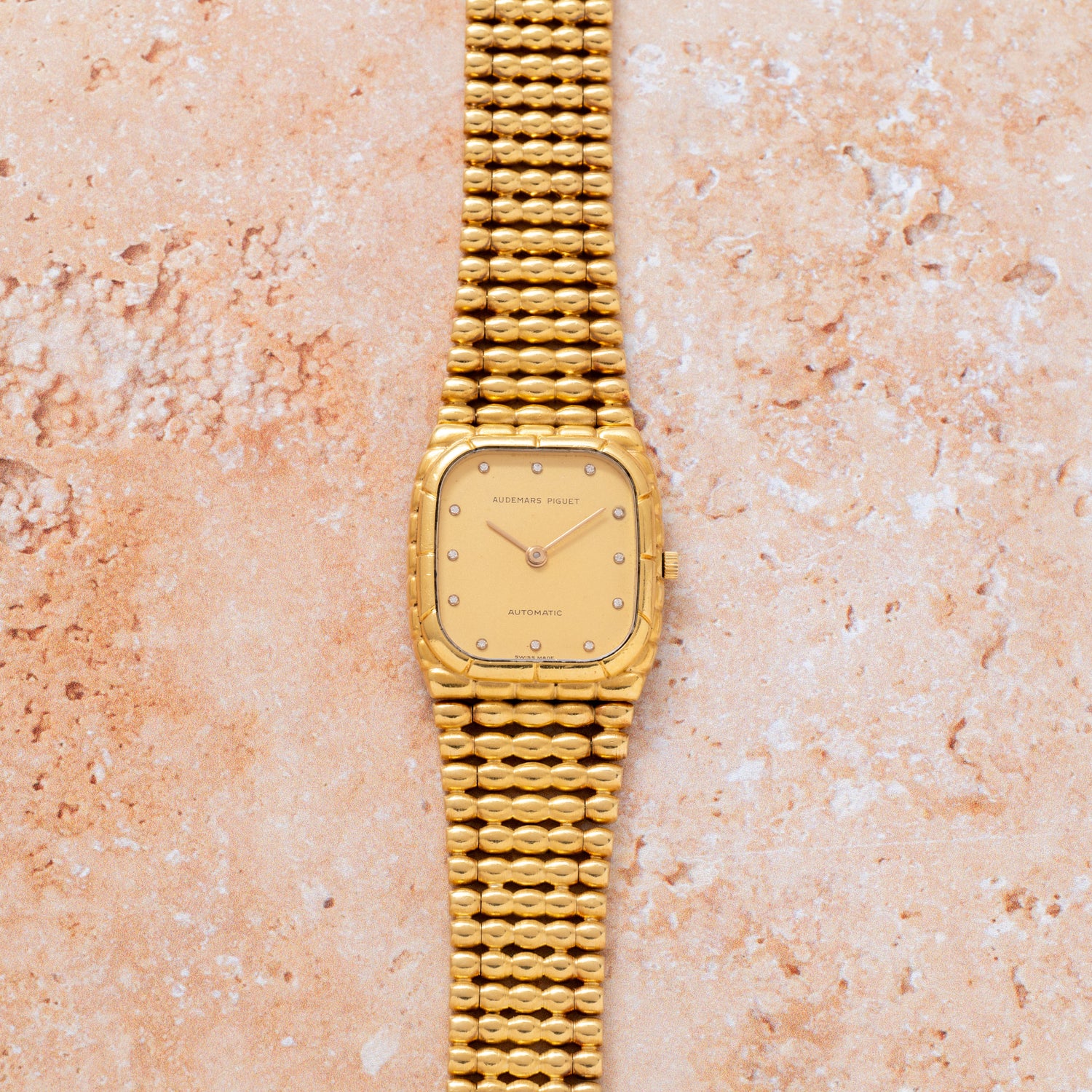 Housed in a 27mm 18K yellow gold case with a stunning integrated, woven bead bracelet with a signed locking clasp, it features a gold dial with diamond-set indices. Powered by an automatic-wound movement from Audemars Piguet, this 1970s dress watch in excellent condition is half-timepiece, half-work of art!
