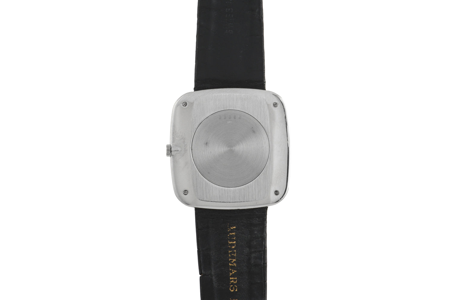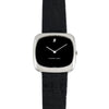 This particular piece features a 34mm oversized 'cushion' case with a thin profile and softly rounded edges, a matte black dial with a matching pencil handset, and an excellent signed black alligator leather strap with a matching white gold pin buckle.