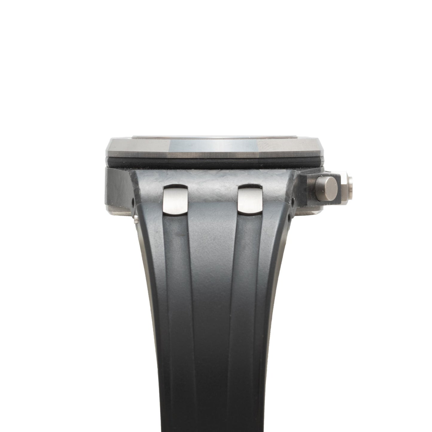 The Offshore that we have here, a limited edition piece for the Italian F1 driver Jarno Trulli, features a 42mm forged carbon case with a sapphire crystal, a signed titanium crown, titanium pushers, a titanium screw-in octagonal bezel, and a signed black rubber strap with a signed titanium deployant clasp. Inside, it has a grey 'macro-tappisserie' dial with applied red paint-filled indices and silver subsidiary registers, a matching handset, and a AP's automatic winding Calibre 3126/3840 chronograph movement, visible via a numbered and signed sapphire exhibition caseback.