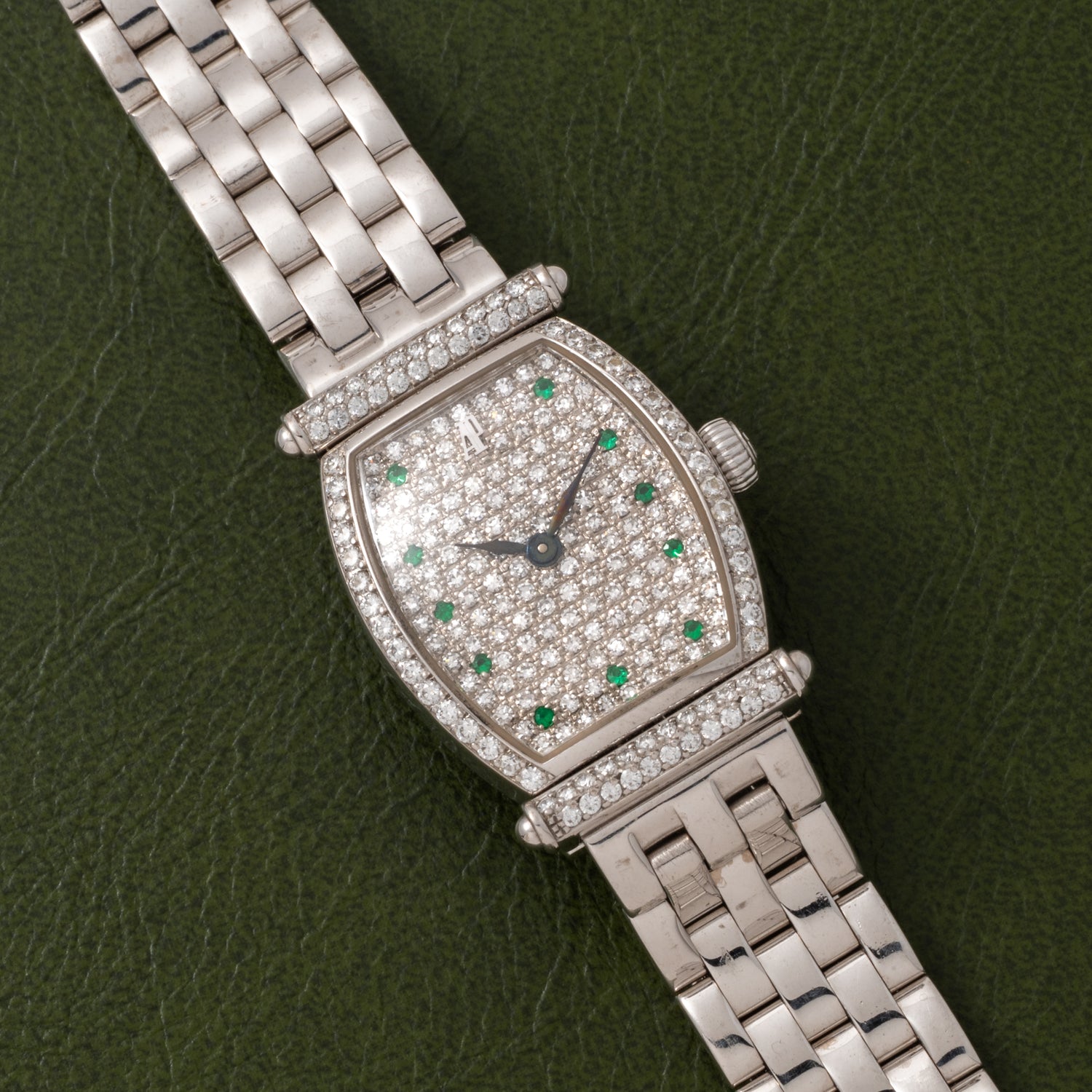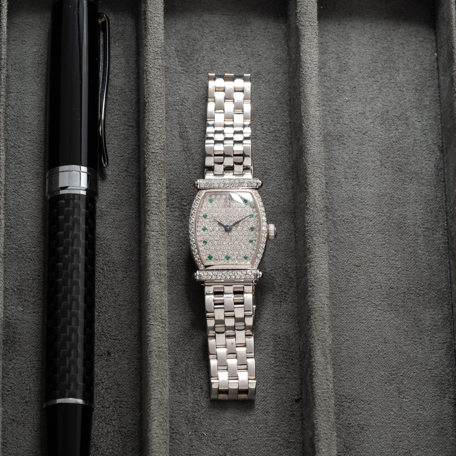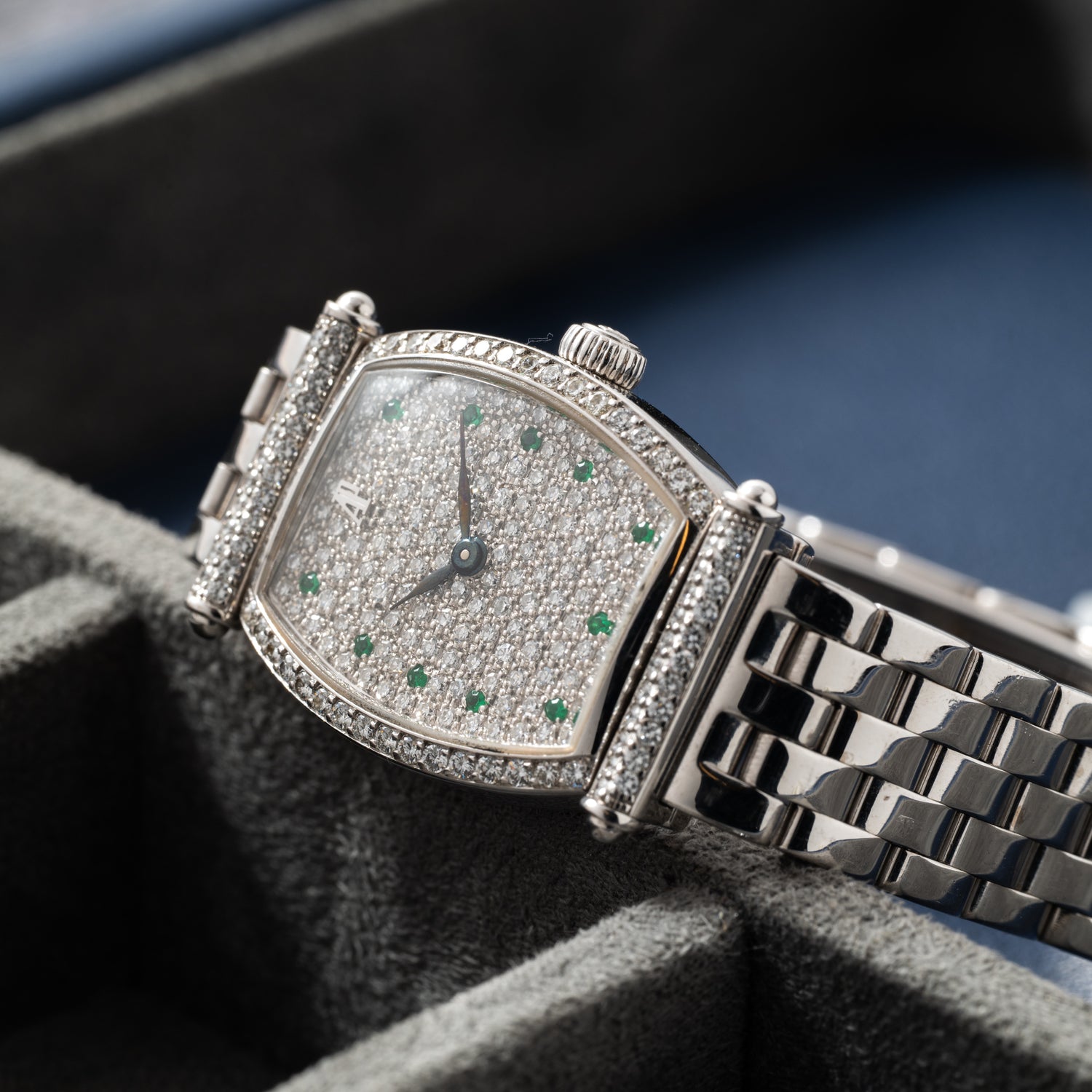 This beauty stands at the intersection of both watchmaking and high jewelry. Fashioned from white gold, this petite piece comes with a manually wound movement within, taking full advantage of AP's susbtantial watchmaking chops. That said, this piece goes on to include extensive stone settings, with a pave dial and stone numeral settings. But perhaps the most impressive feature of this watch is its diamond settings along the scrolled bracelet integration componentry. This is no easy feat, and showcases AP's excellence in the world of high jewelry.
