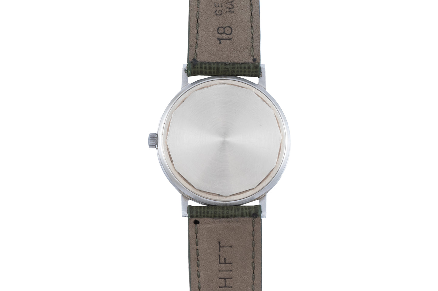 Dating to the second half of the 1960s, this piece features a 34mm white gold case with a stunning bark finished bezel, an acrylic crystal, and a beautiful bark finished silver dial with applied 'stick' indices and a matching 'pencil' handset.