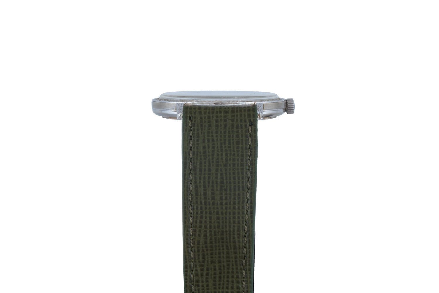 Powered by AP's Calibre 2120 automatic winding movement, this piece comes paired to one of our Analog:Shift green saffiano leather straps with a steel pin buckle.