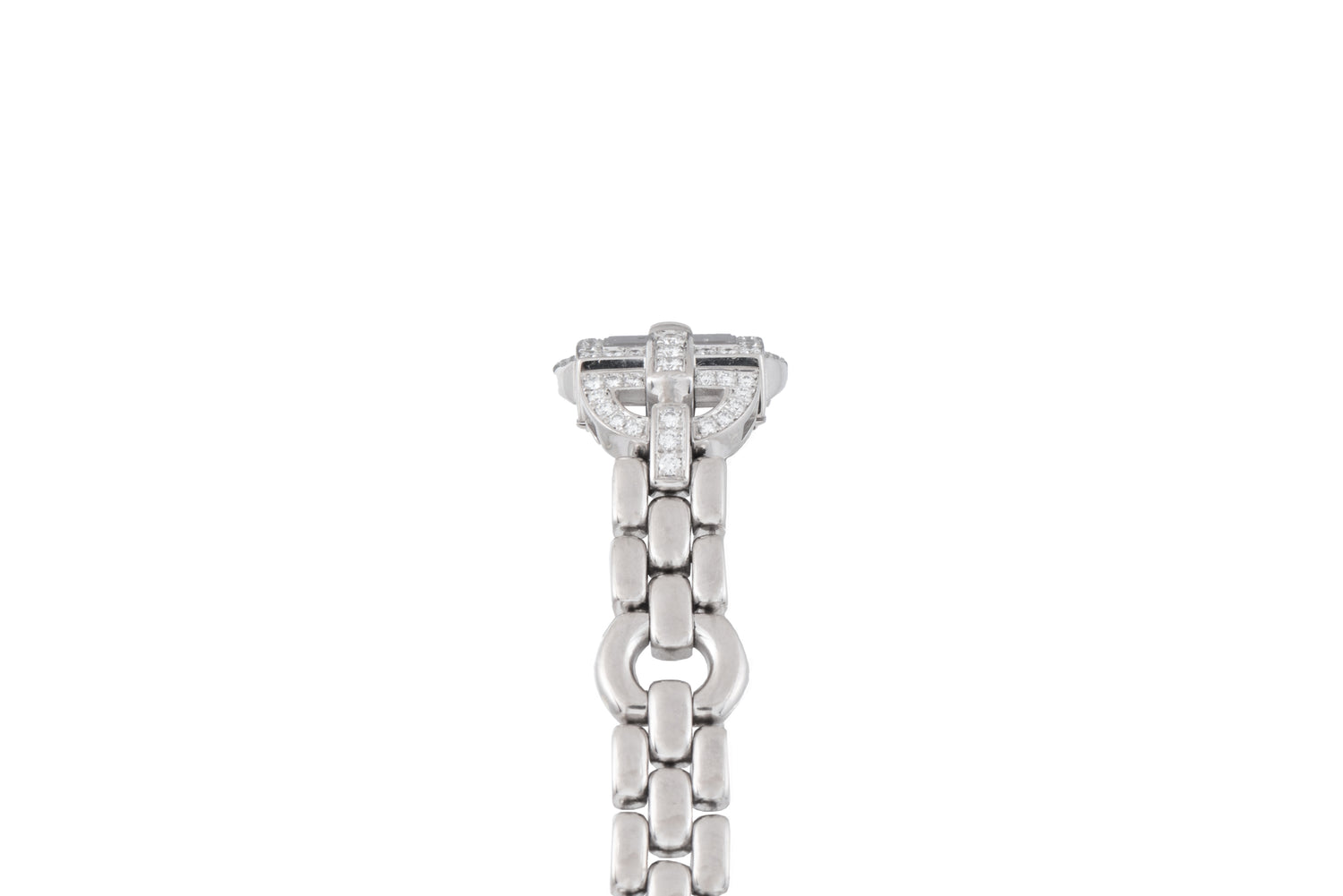 Housed in a 16.5mm white gold case with a mineral crystal, a diamond-encrusted top-case and first links at 6:00 & 12:00, it features a white dial with printed black indices, a matching 'pencil' handset, a reliable quartz movement, and a fantastic, matching white gold 'chain'-style bracelet with a signed locking clasp.