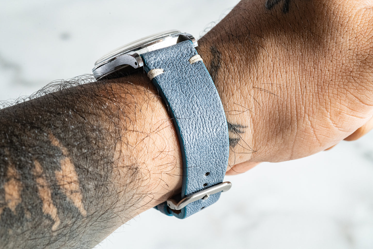 Our Montone Leather Strap collection is the evolution of our calf leather style, produced in core colors that evoke the colorful pop artwork in comic books and legendary graphic novels. These fun, vibrant straps are now produced with a more traditional vintage style stitching, and we've further upgraded them with a perforated backing for even more comfort on the wrist.