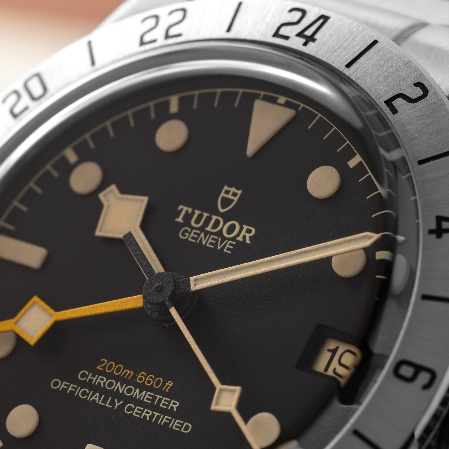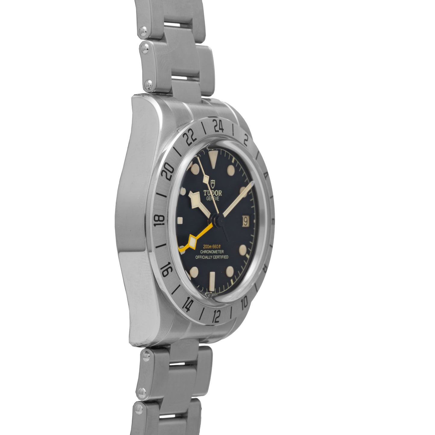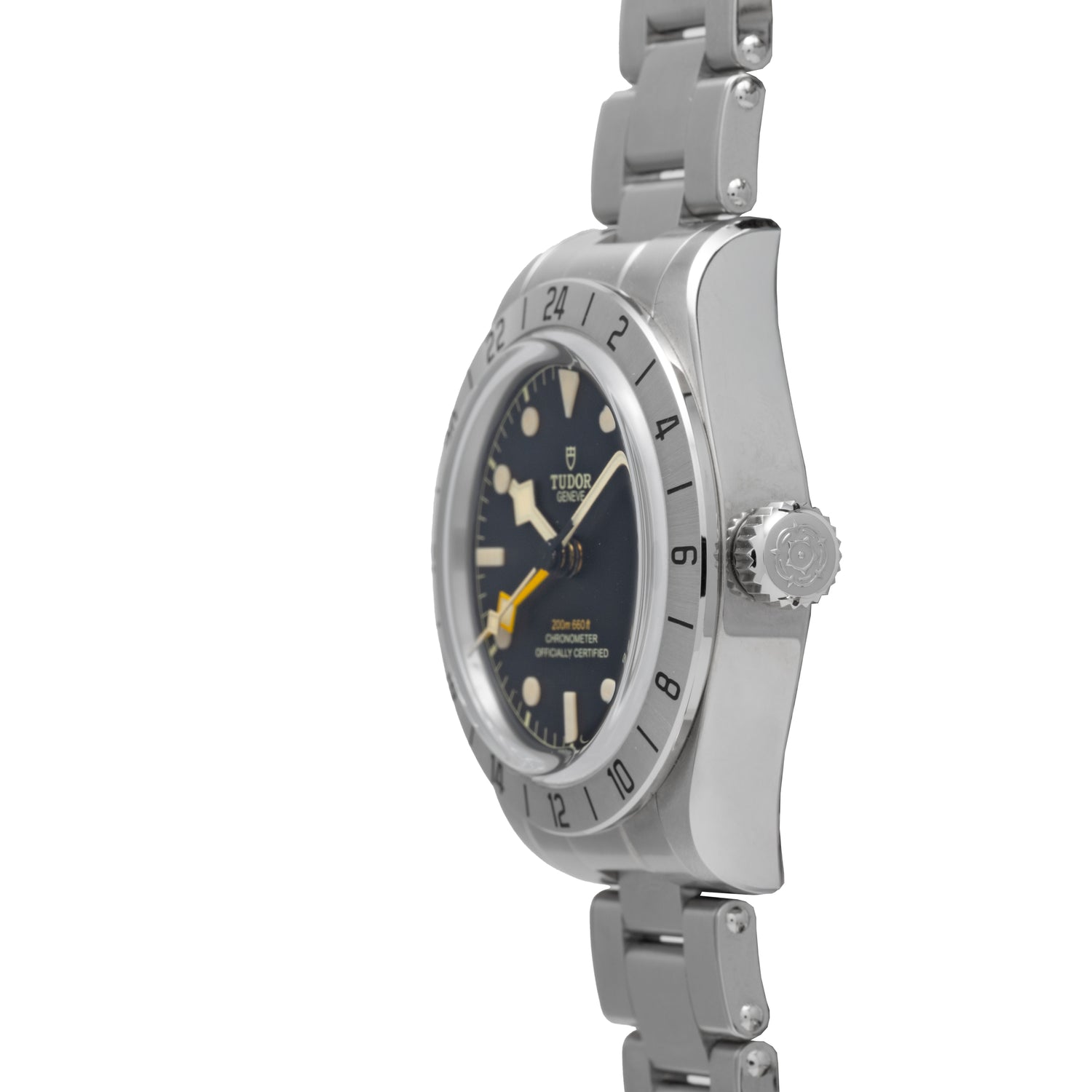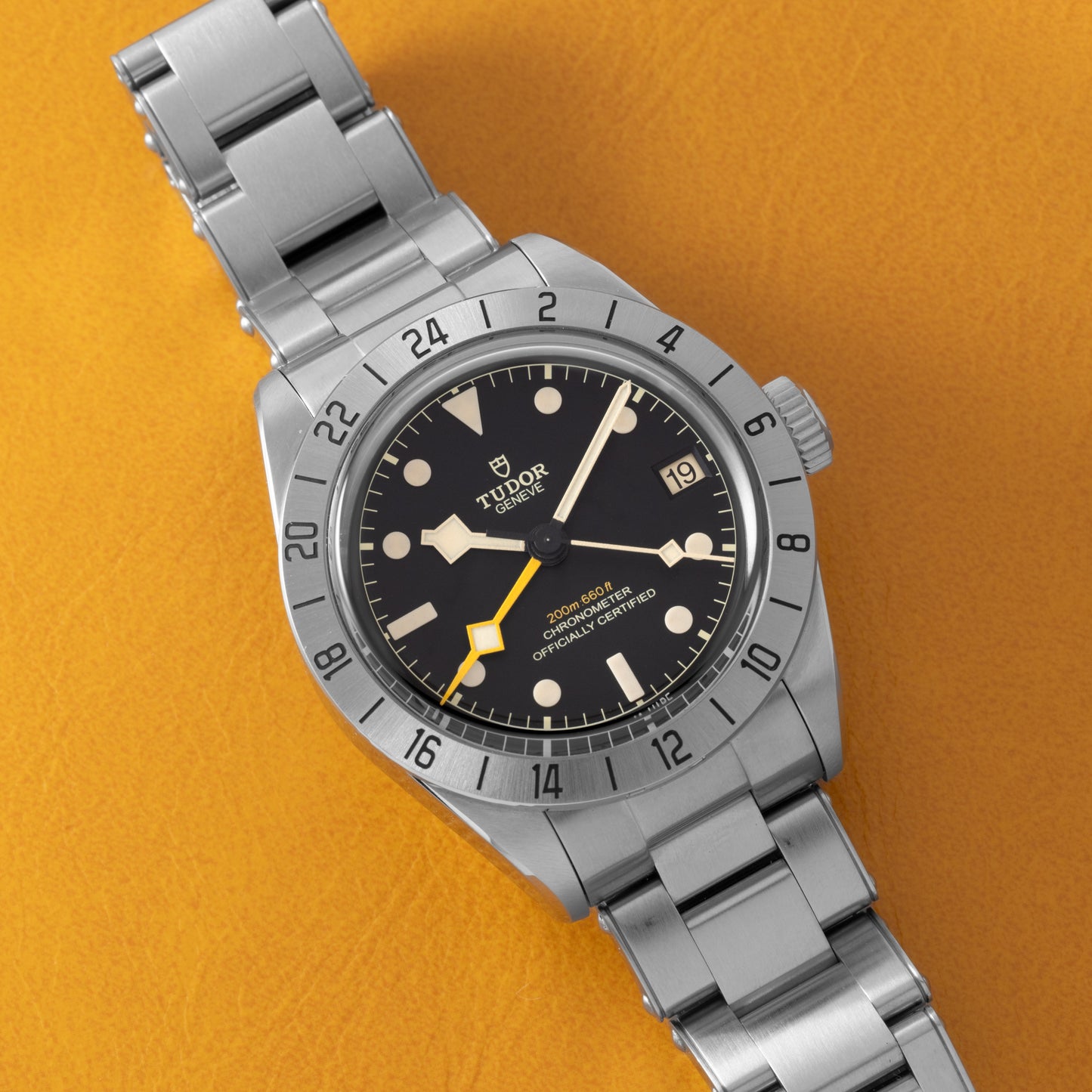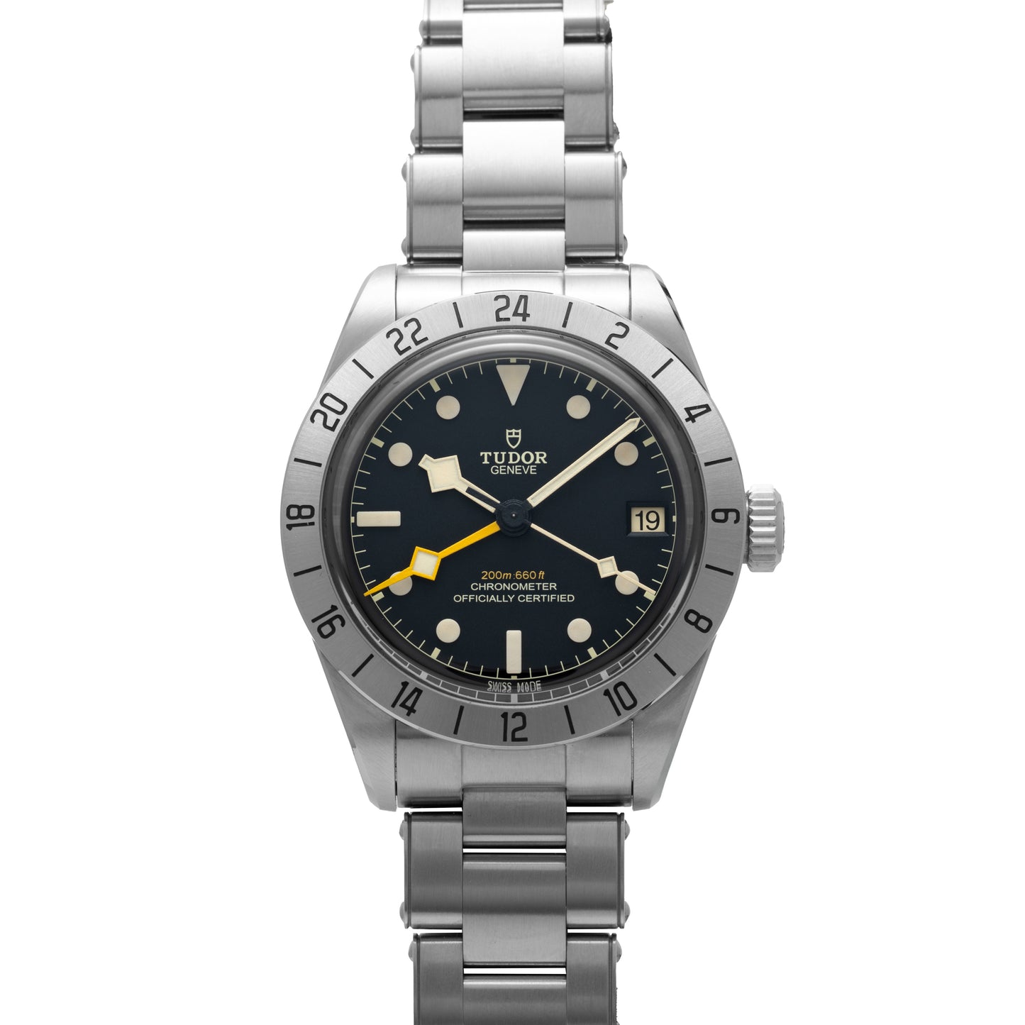 A Reference M79470, this model features a 39mm stainless steel case with a fixed steel bezel with 24-hour engravings, sapphire crystal, ‘rose’ signed screw-down crown and 200 meters of water resistance. Its luminous matte black dial features applied indices, Tudor's signature ‘snowflake’ handset, a yellow-orange ‘snowflake’ GMT hand and a date window at 3 o’clock.