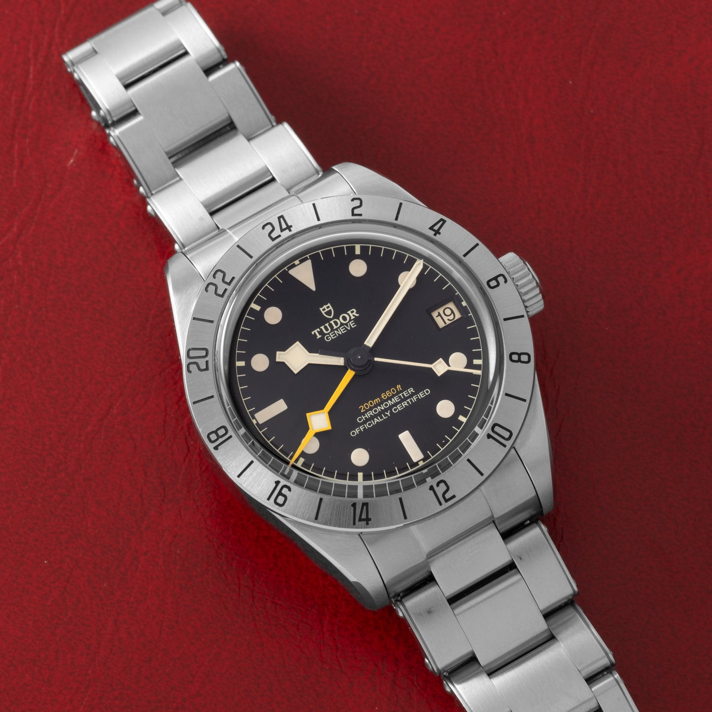 Fitted to an Oyster-style stainless steel bracelet with a signed locking clasp and Tudor’s proprietary ‘T-fit’ self-adjusting clasp system, this piece is powered by the in-house self-winding chronometer certified MT5652 movement which features a local-jumping hour hand.