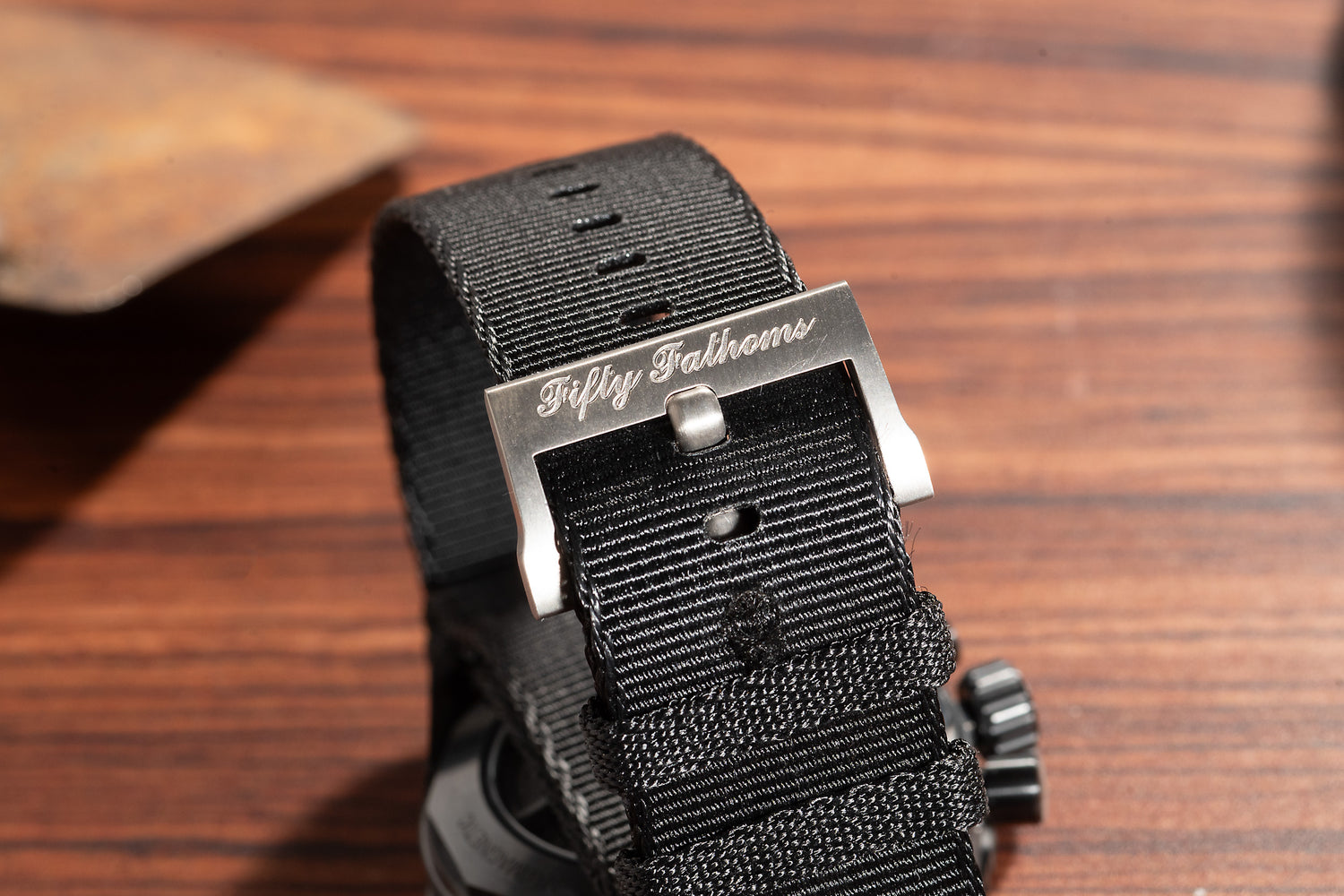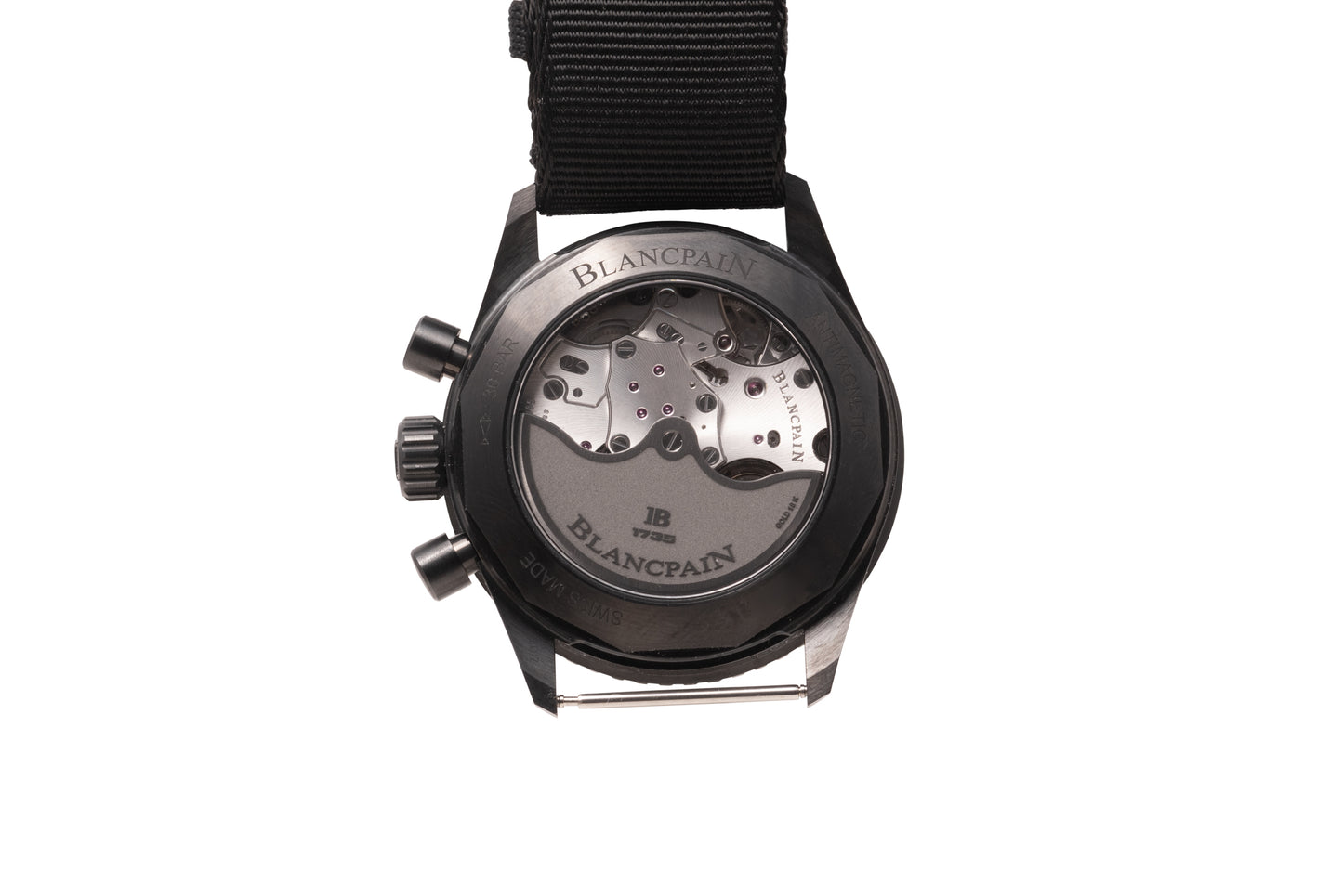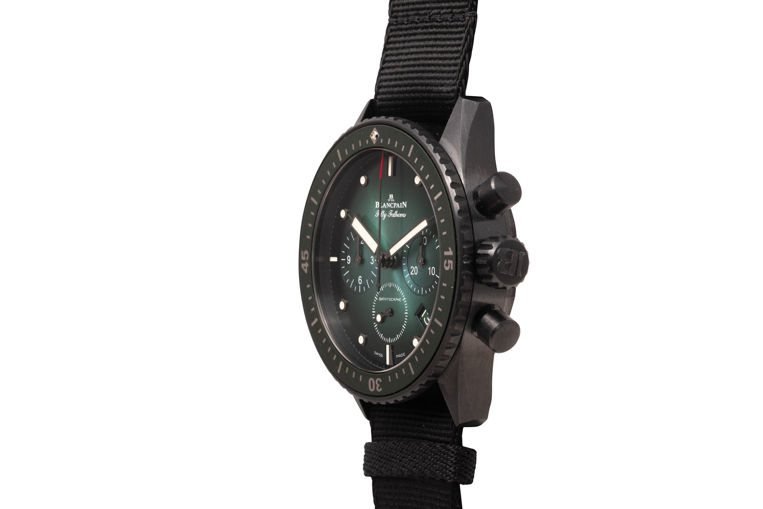 Paired to a black textile single-pass strap with a signed pin buckle, this piece is powered by Blancpain's automatic-winding Calibre F385 flyback chronograph movement.