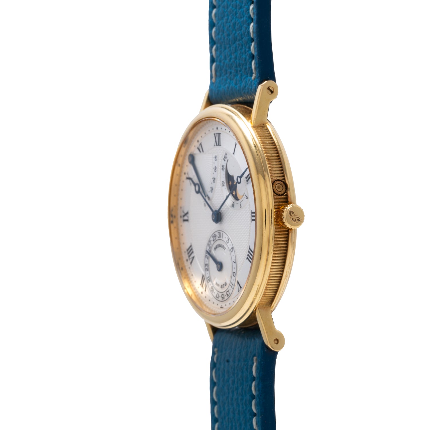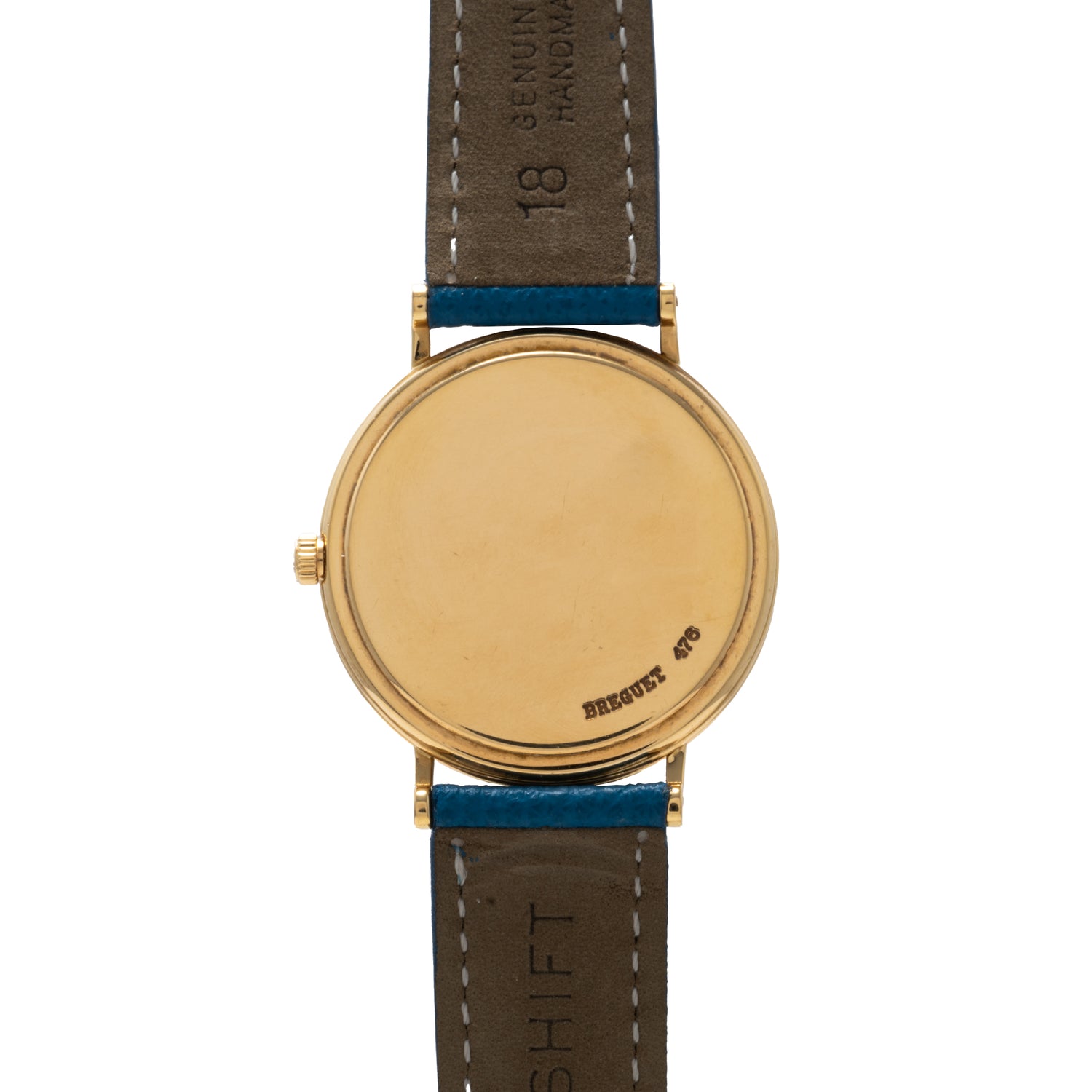 Powered by the automatic Breguet Calibre 502 movement with 37 jewels and paired to a blue leather strap with a gold-tone pin buckle, this piece is accompanied by its correct box. Stunning to behold and quite possibly perfectly sized, this Reference 3130 BA is stuff horological dreams are made of.
