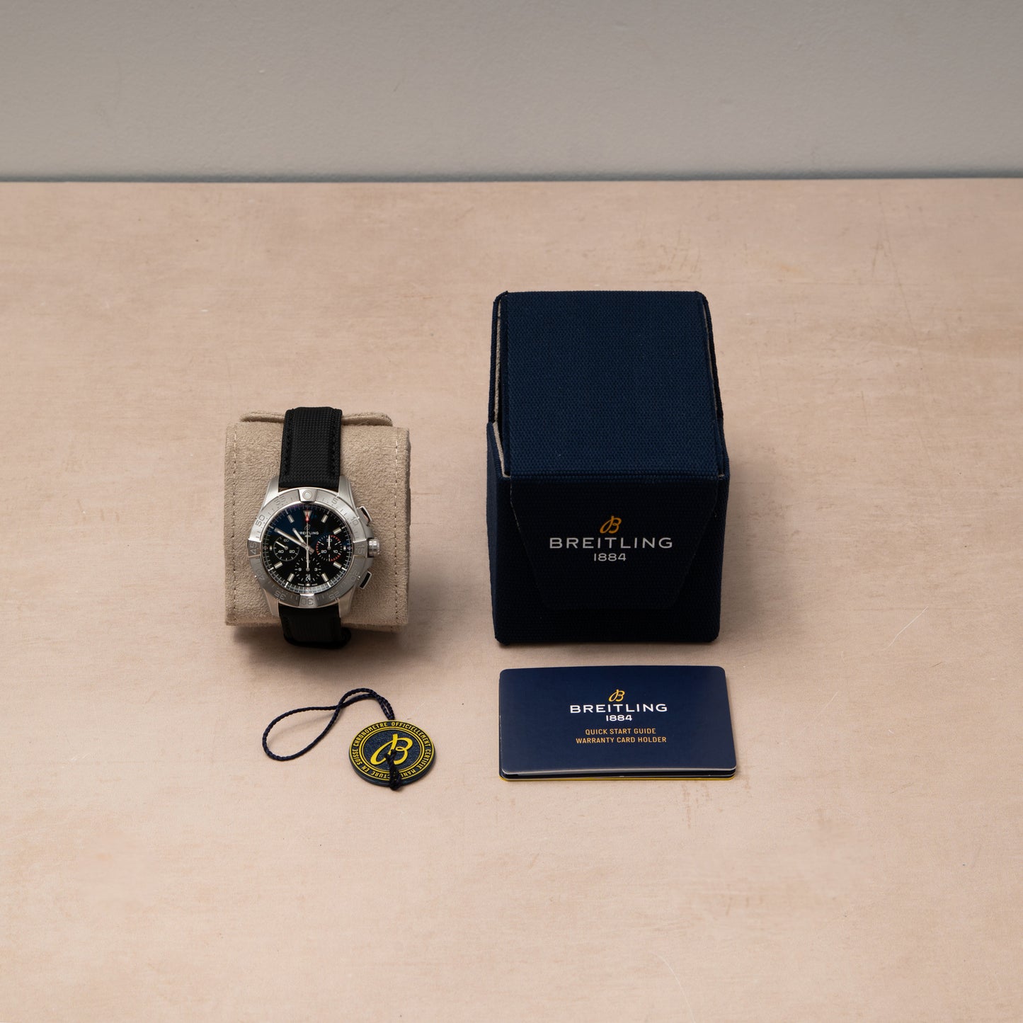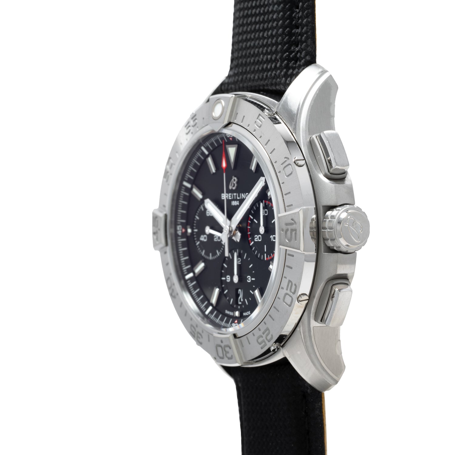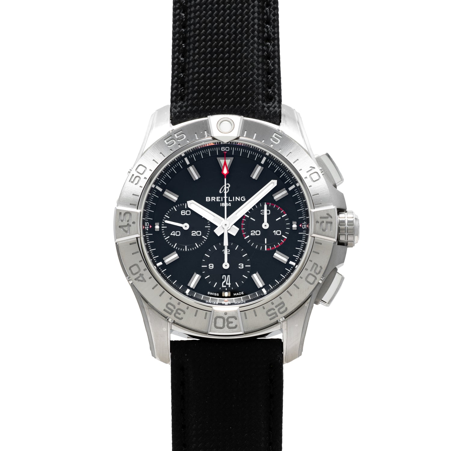 This particular piece, an Avenger B01 44, features — you guessed it — a 44mm stainless steel case with a sapphire crystal, a signed crown, and a unique dive bezel. Inside, it has a black dial with applied luminous indices and a matching handset.