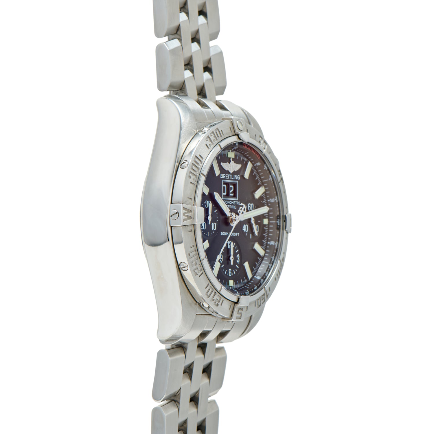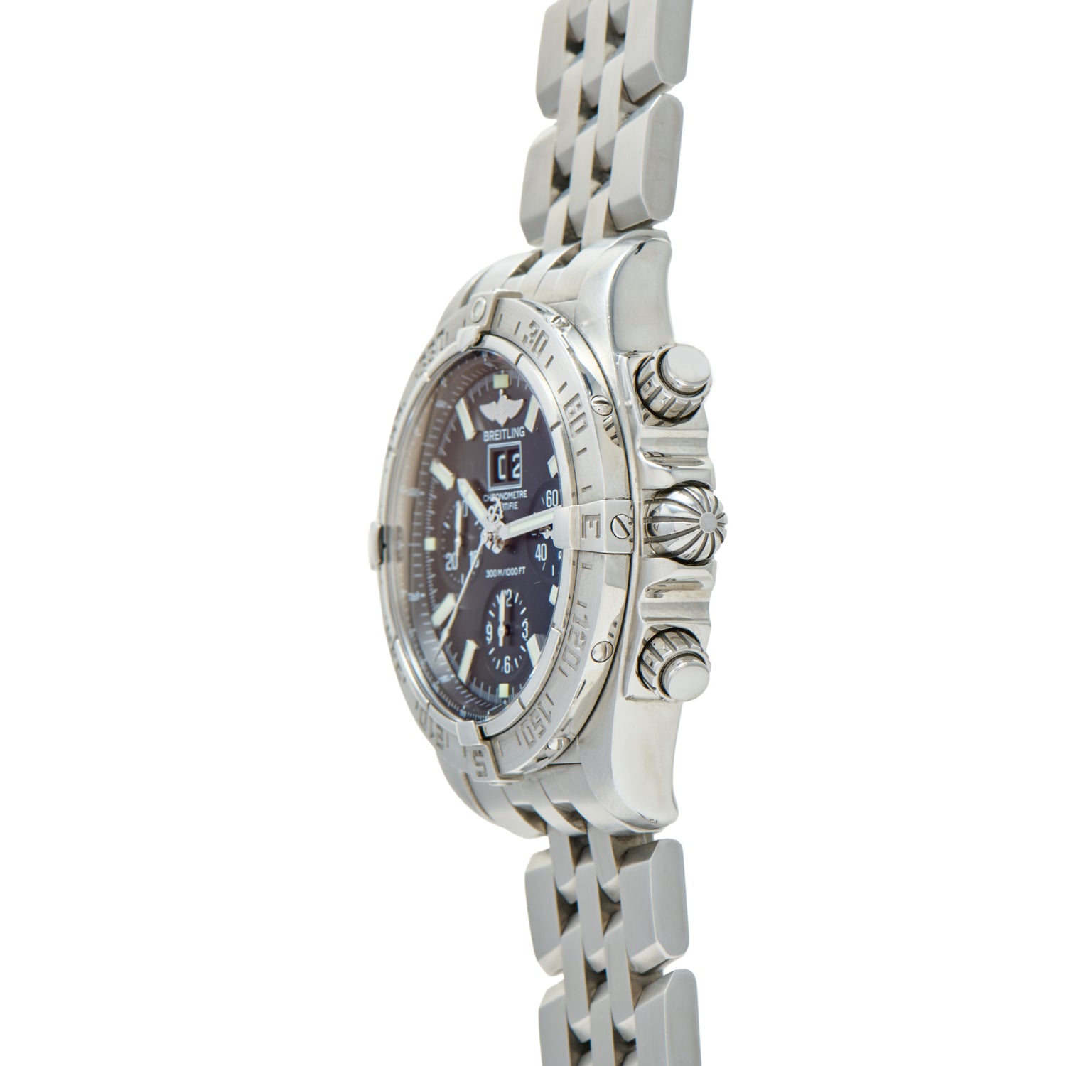 Powered by the automatic Breitling Caliber 44 modular chronograph movement (ETA 2892 base), this hardy tool watch comes paired to its correct stainless steel multi-link bracelet with a signed folding clasp. Happily, it also includes its Chronometer Certificate and punched Japanese papers dating to 2008.
