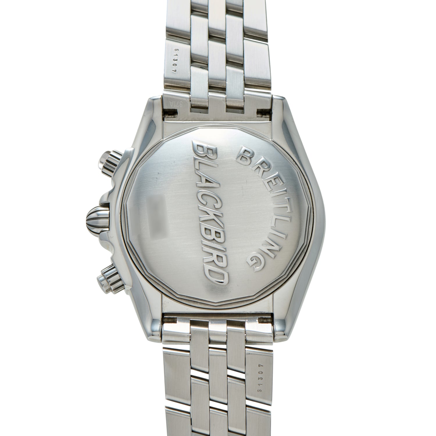 Released in the 1990s, this Chronomat sub-collection honors the SR-71 'Blackbird,' the fastest jet aircraft ever flown. Initially launched as a standard triple-register chronograph with date window, it expanded into the watch you see here in 2007: Housed in a whopping 44mm stainless steel case with a mix of brushed and polished surfaces, it features a sapphire crystal, compass bezel with 'rider tabs' at the cardinal indices, a signed crown, and dual screw-down pushers.