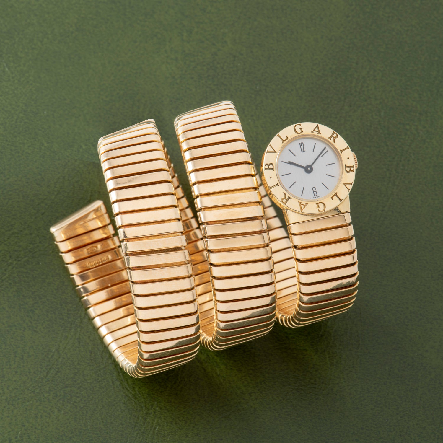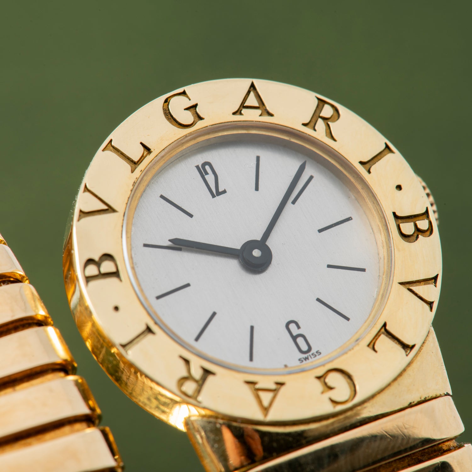 This timepiece dates to circa the 2000s and takes a subtler approach to serpentine influence. Coming in at 20mm in diameter, it features a yellow gold case paired to a matching yellow gold, triple-wrap, serpenti-tubogas bracelet. A white dial with applied black indices, a matching black 'sword' handset, and a quartz movement is surrounding by a "BVLGARI BVLGARI" bezel — an iconic elements of the Roman jeweler's design over the past 50 years.