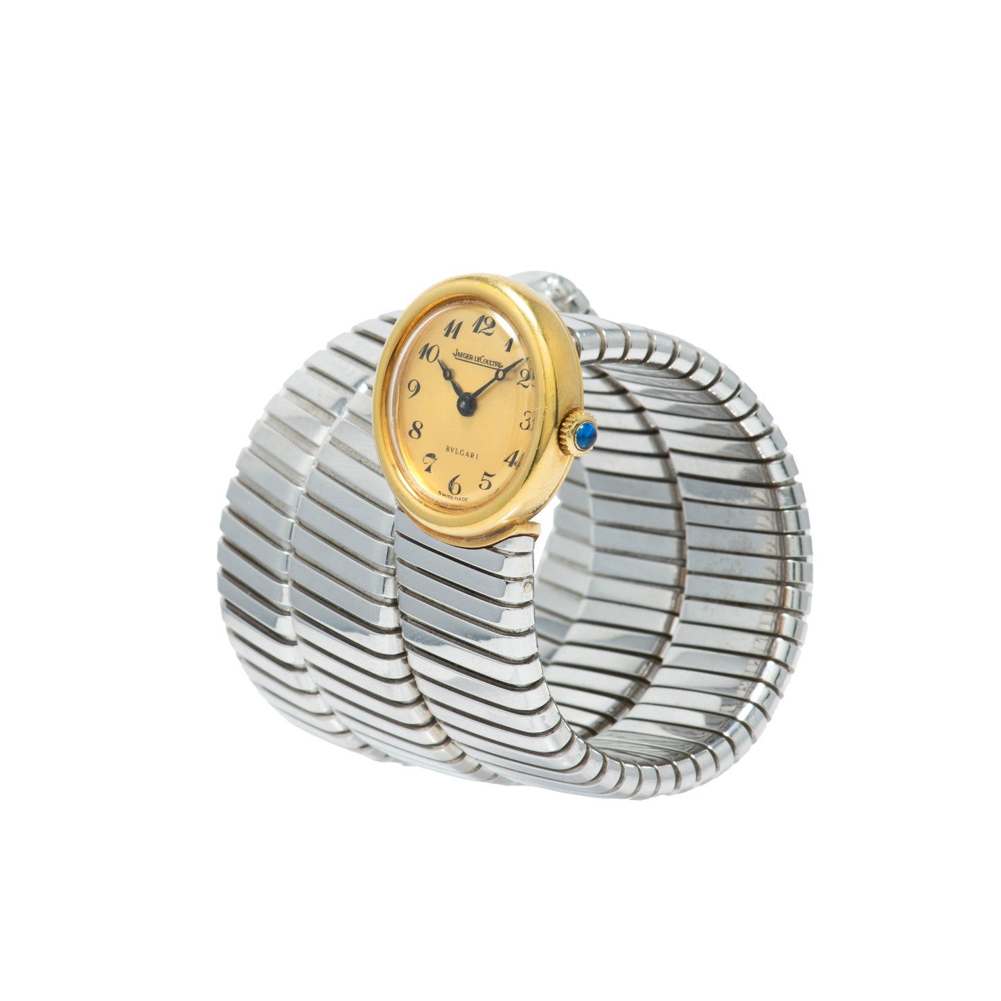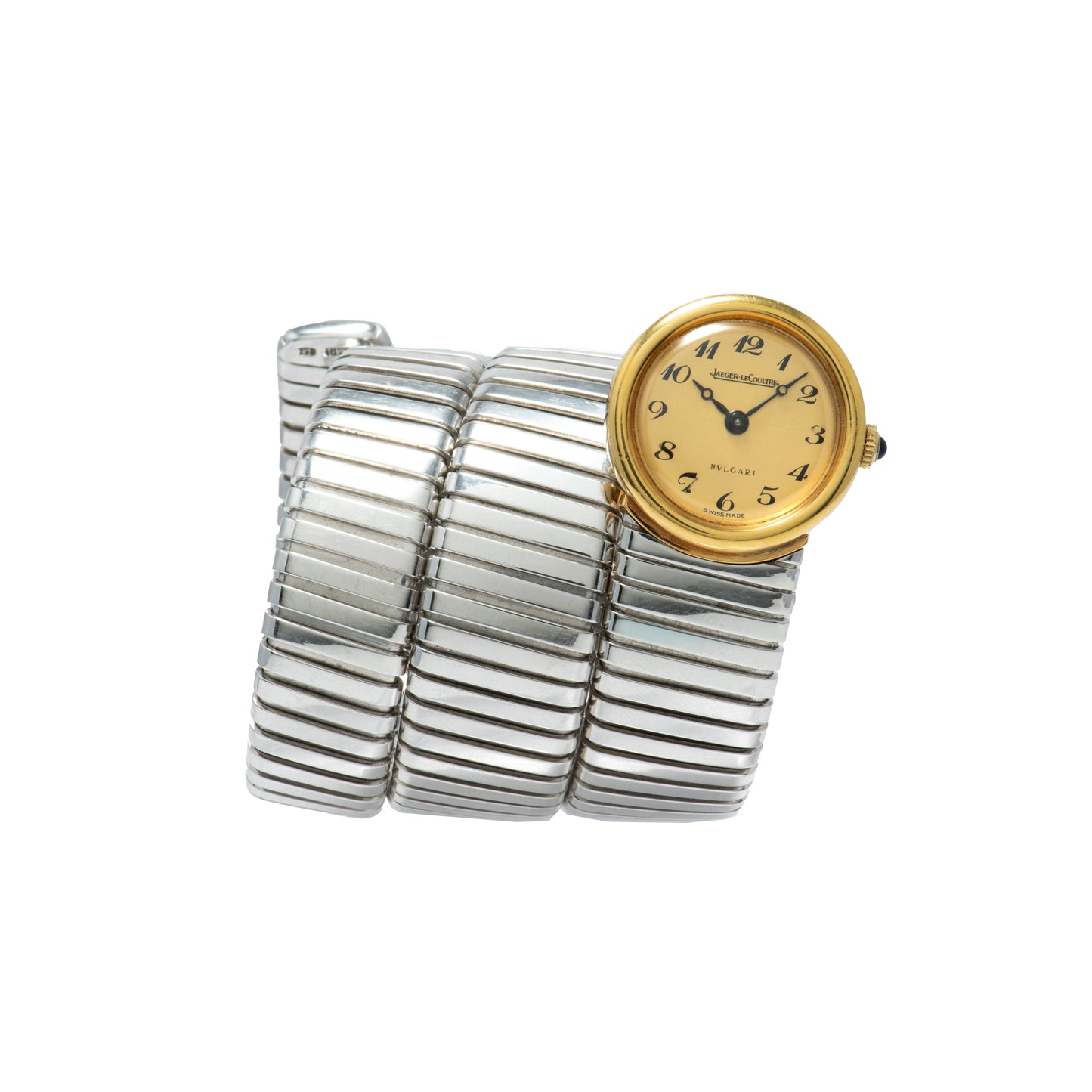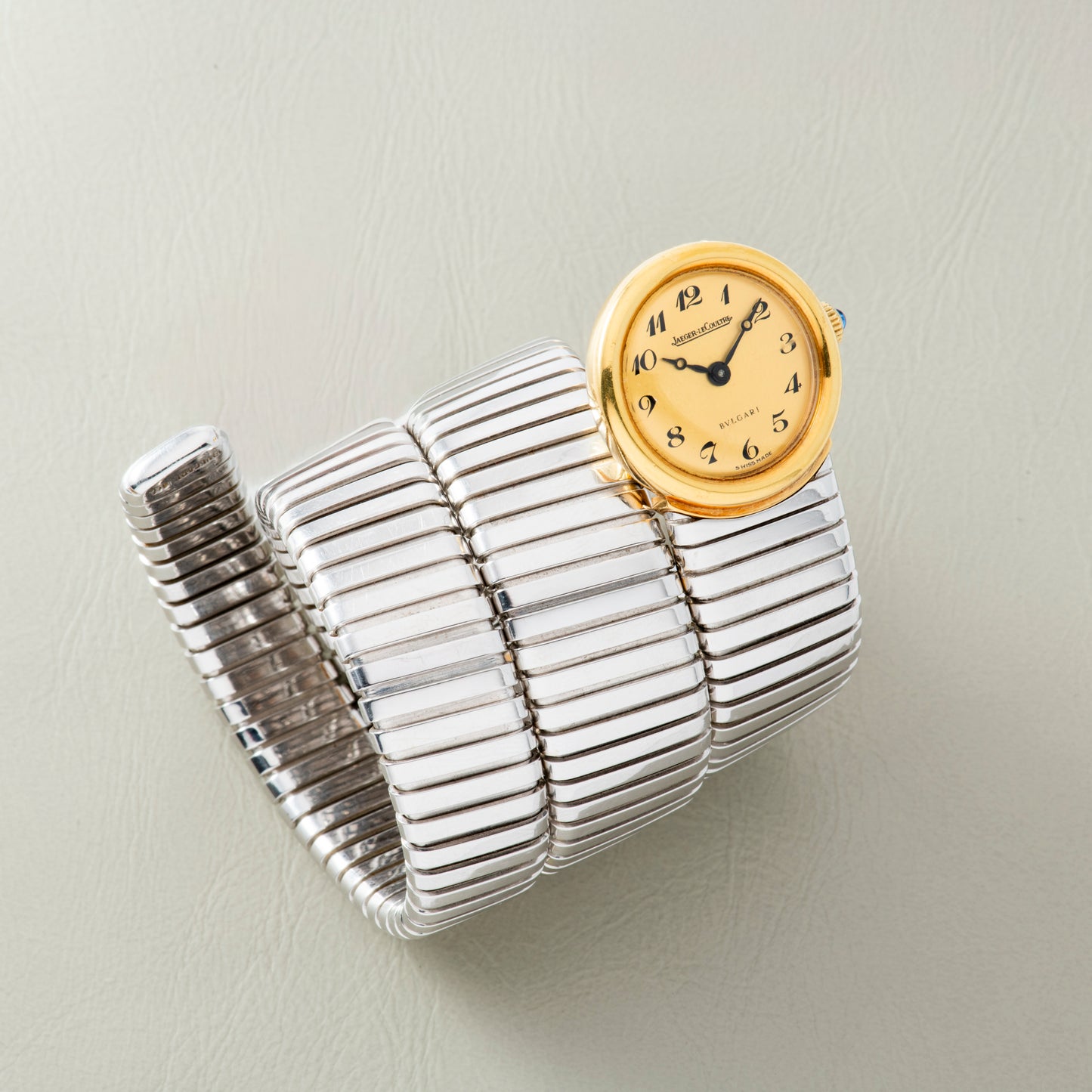 This particular Serpenti Tubogas dates to a time long before Bulgari was capable of manufacturing its own movements, and thus joined forces with some of the most prominent watchmakers of the day. Produced in the 1970s, it features a triple-wrap, 18K white gold tubogas bracelet fixed to a round, yellow gold watch head with a matching smooth bezel. Its intriguing dial is unusua: Executed in a champagne tone, it features black printed 'Breguet' indices, a matching black 'Breguet' handset, and dual signatures from Jaeger-LeCoultre and Bulgari. A blue cabochon crown operates the hand-wound JLC movement ticking a way within. The watch also comes with its period-correct leather-clad box with a padded interior.