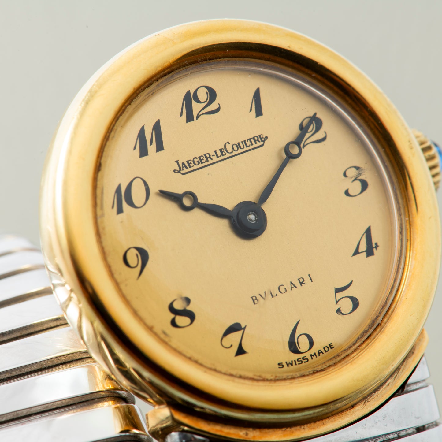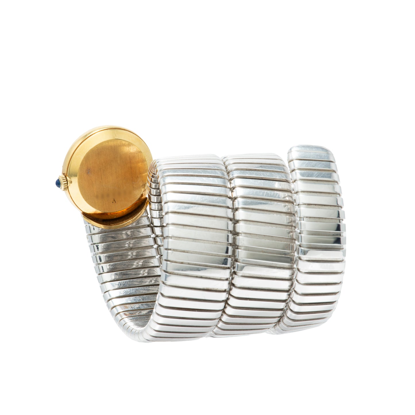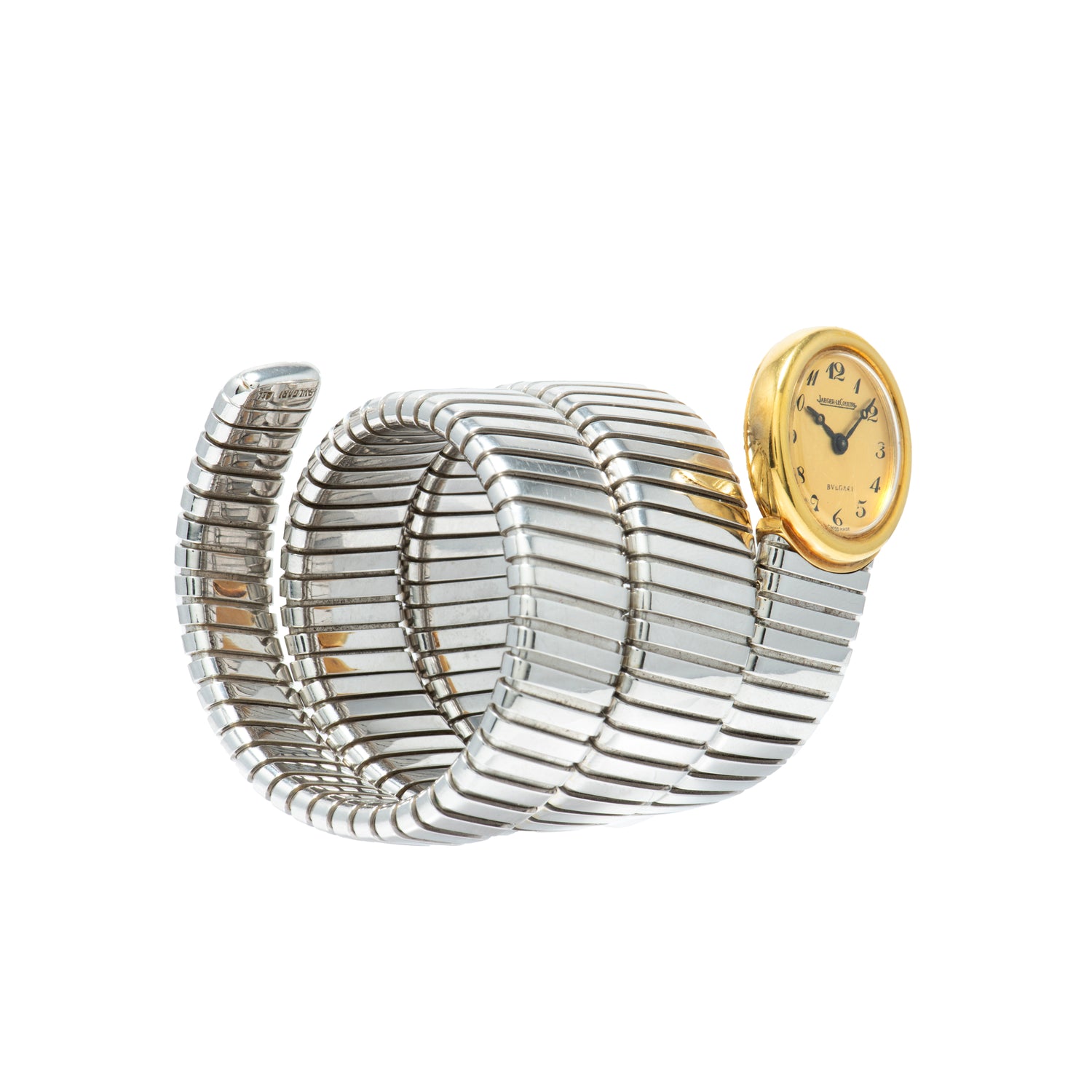 This particular Serpenti Tubogas dates to a time long before Bulgari was capable of manufacturing its own movements, and thus joined forces with some of the most prominent watchmakers of the day. Produced in the 1970s, it features a triple-wrap, 18K white gold tubogas bracelet fixed to a round, yellow gold watch head with a matching smooth bezel. Its intriguing dial is unusua: Executed in a champagne tone, it features black printed 'Breguet' indices, a matching black 'Breguet' handset, and dual signatures from Jaeger-LeCoultre and Bulgari. A blue cabochon crown operates the hand-wound JLC movement ticking a way within. The watch also comes with its period-correct leather-clad box with a padded interior.