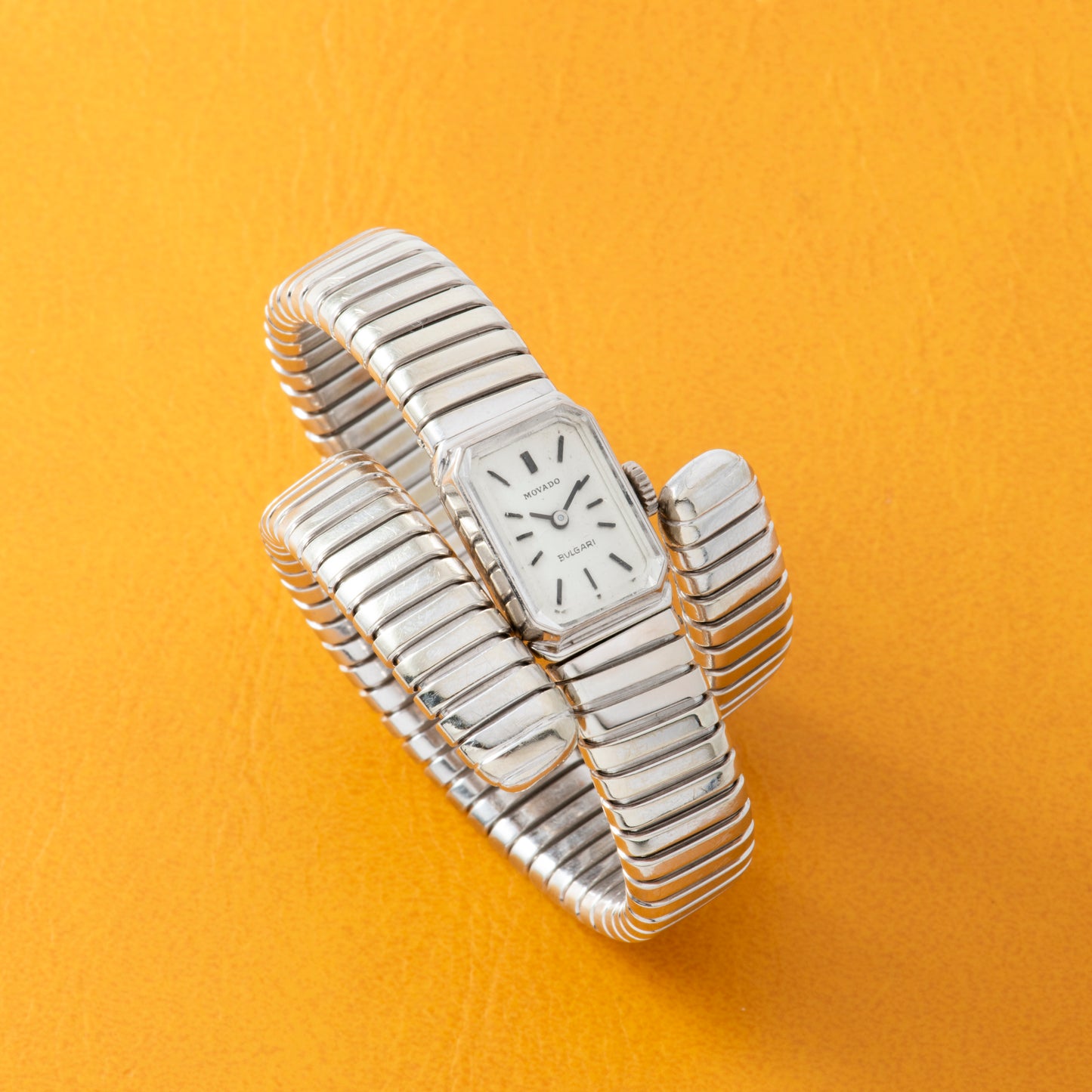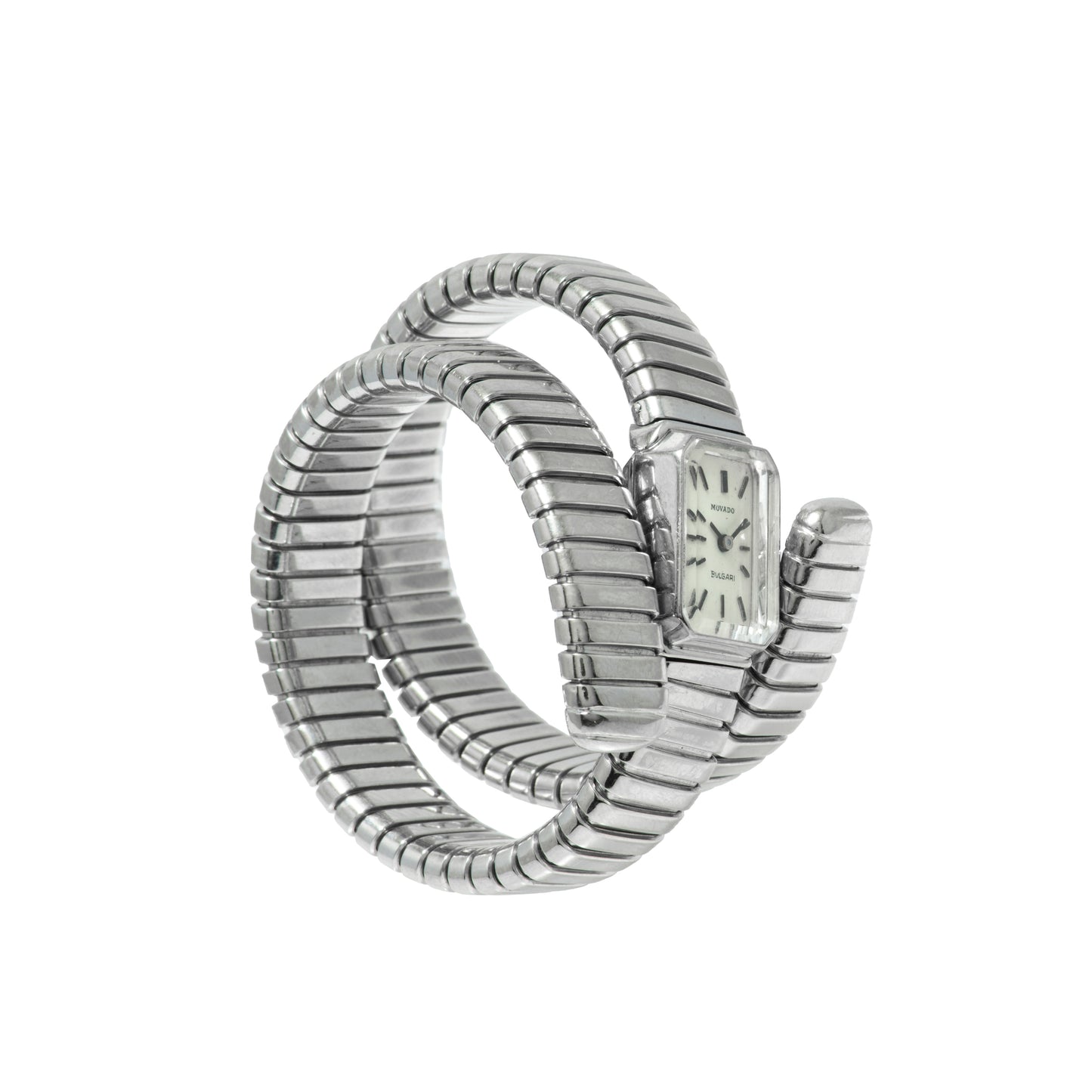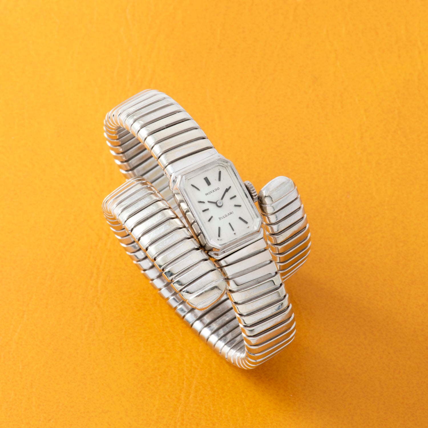 This particular Serpenti Tubgoas dates to a time long before Bulgari was capable of manufacturing its own movements, and this joined forces with some of the most prominent watchmakers of the day. Dating to the 1970s, it features a triple-wrap, 18K white gold, serpenti-tubogas bracelet fixed to a rectangular watch head with an octagonal bezel. The silvered dial — double-signed "Movado" and "Bulgari" and fitted with applied indices and a 'stick' handset — hints at the hand-wound Movado movement ticking away within. Unlike many other tubogas designs, however, the bracelet attaches conventionally at both ends of the watch head, making for a sort of hybrid timepiece with a unique character all its own.