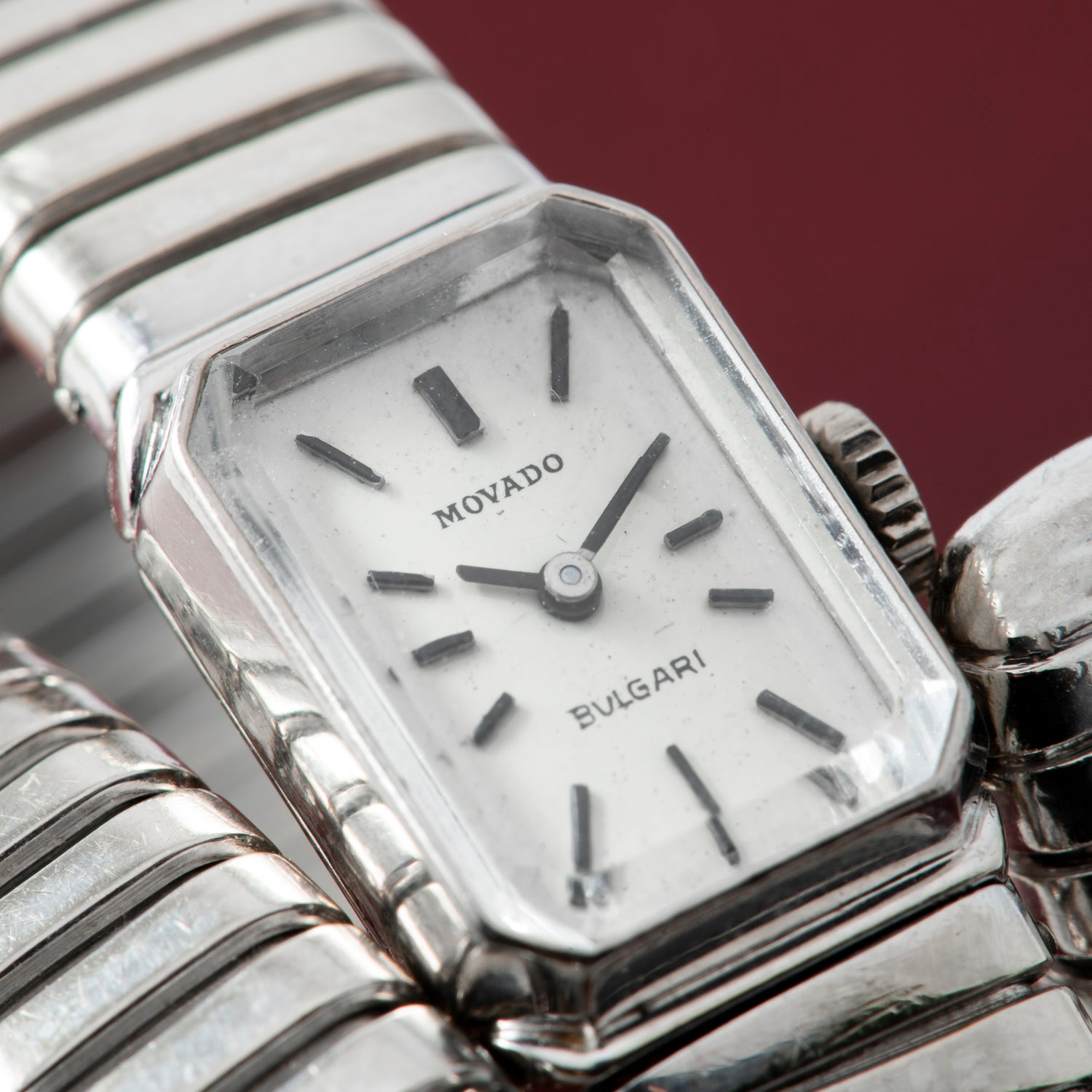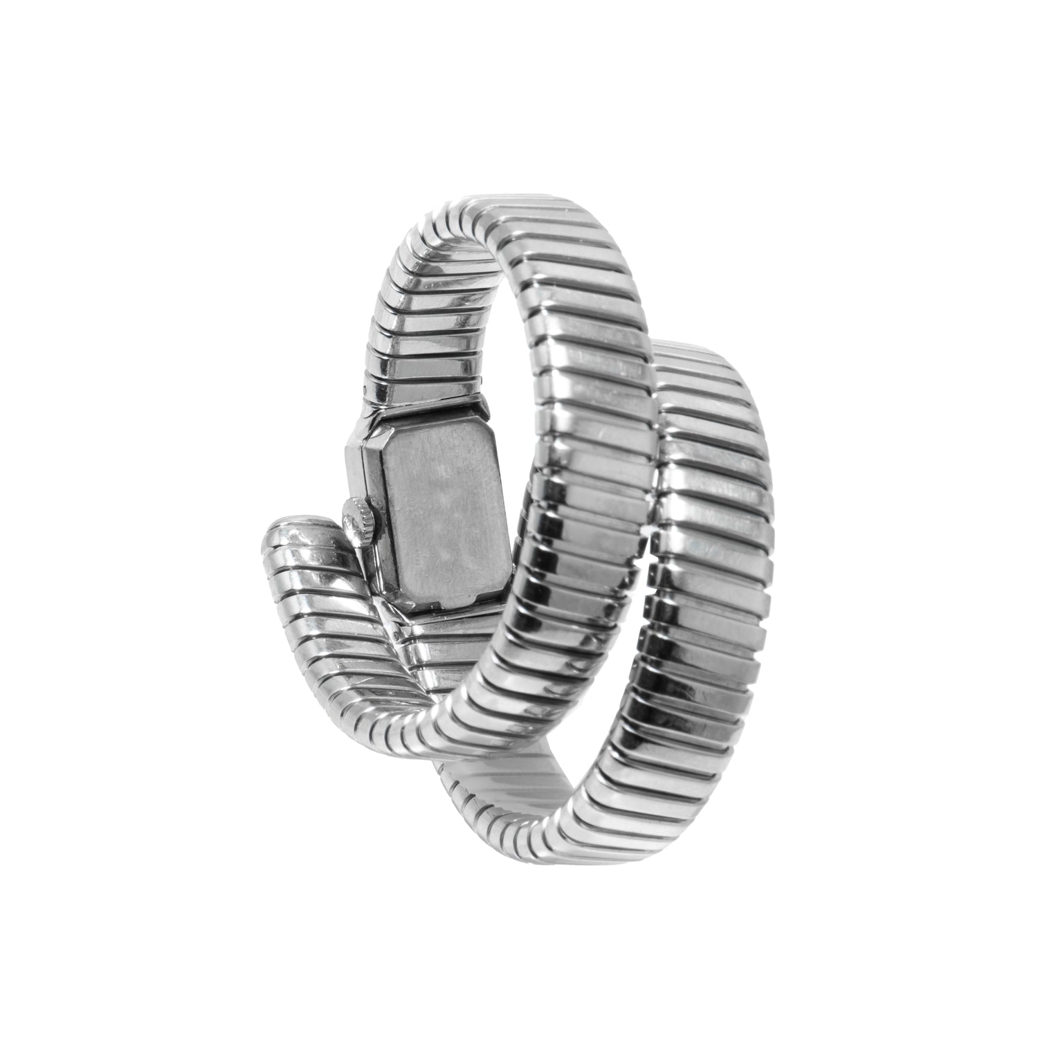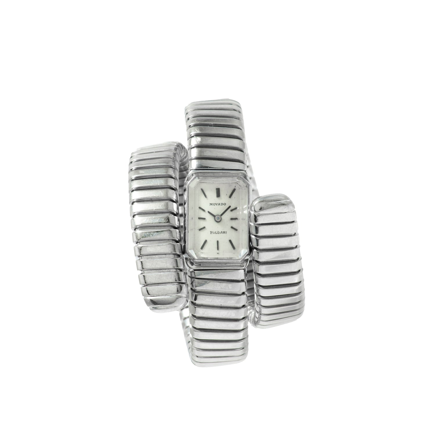 This particular Serpenti Tubgoas dates to a time long before Bulgari was capable of manufacturing its own movements, and this joined forces with some of the most prominent watchmakers of the day. Dating to the 1970s, it features a triple-wrap, 18K white gold, serpenti-tubogas bracelet fixed to a rectangular watch head with an octagonal bezel. The silvered dial — double-signed "Movado" and "Bulgari" and fitted with applied indices and a 'stick' handset — hints at the hand-wound Movado movement ticking away within. Unlike many other tubogas designs, however, the bracelet attaches conventionally at both ends of the watch head, making for a sort of hybrid timepiece with a unique character all its own.