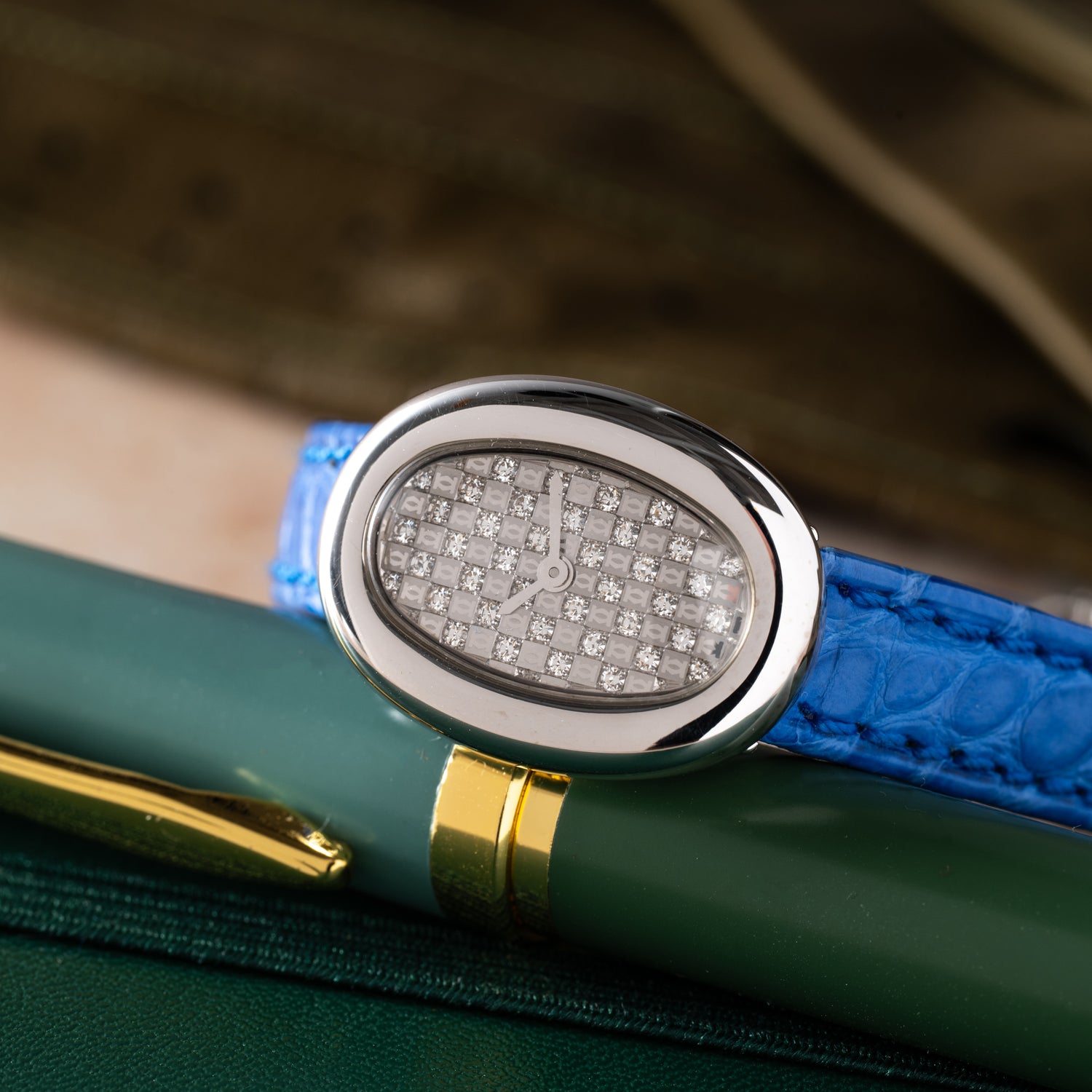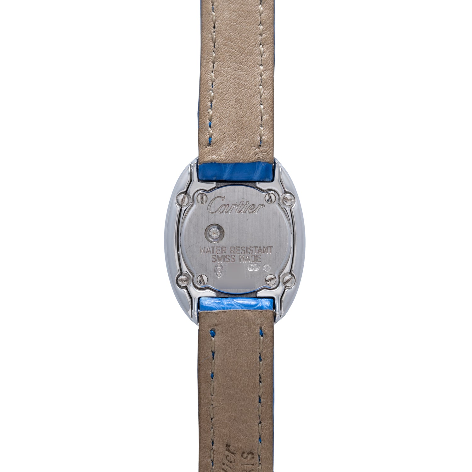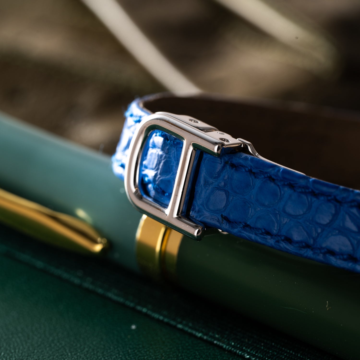 This particular example dates back to 2000-2001 and features a solid 18K white gold 18mm case with a factory-set diamond dial checkered with the Cartier logo, back time setting mechanism, sapphire crystal, and a matching 'sword' handset, and is fitted to a lovely blue alligator strap with a double fold-over deployant clasp.