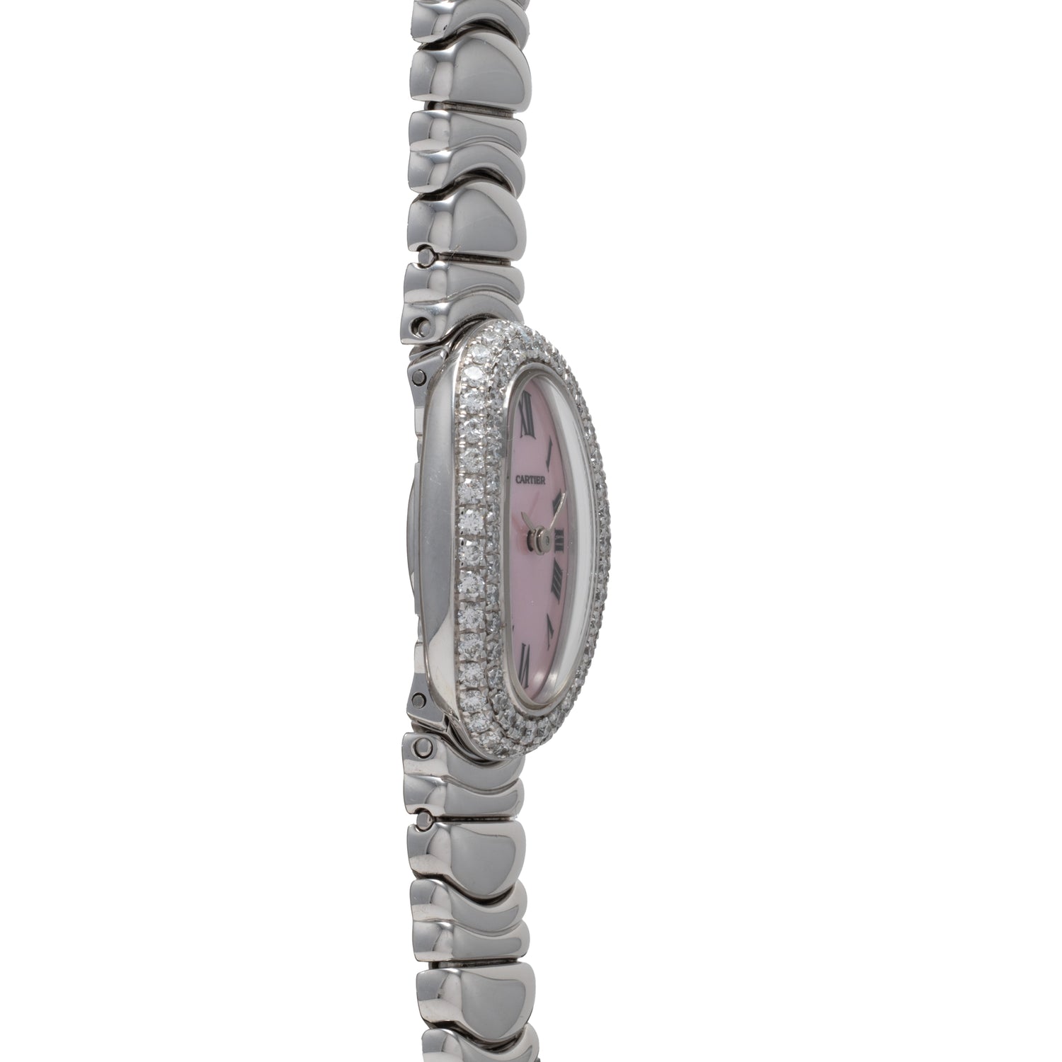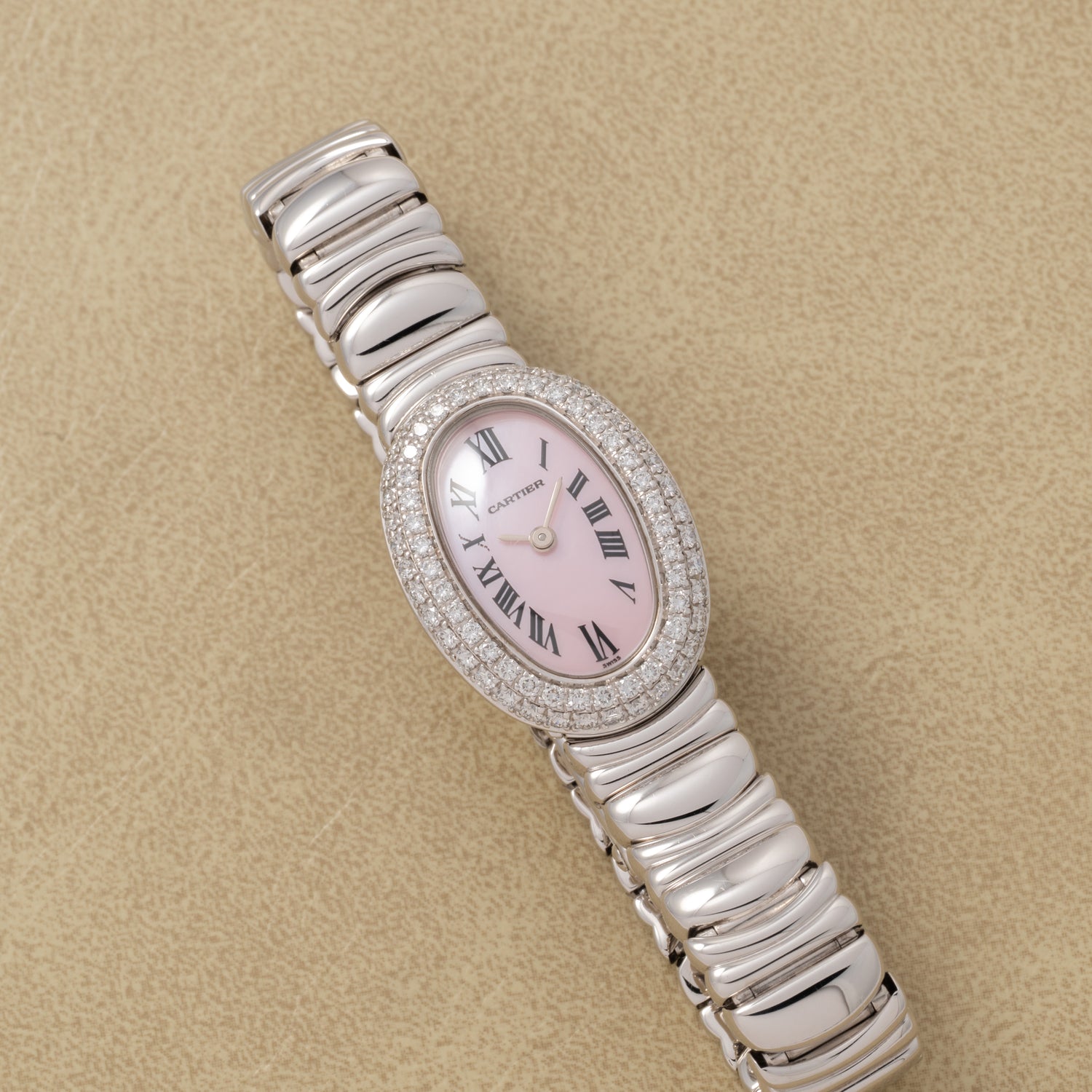 No watch better captures this philosophy than the Cartier Baignoire. This example features a beautiful case shape, with its soft curves and oblong ellipse aesthetic. Paired with a beautiful 18K white gold bracelet with an equally distinct link profile, this watch is anything but boring, and provides an incredible host of details to obsess over. Furthermore, this example comes with a beautifully-set diamond bezel and and a simply stunning dial with pink mother of pearl finish.