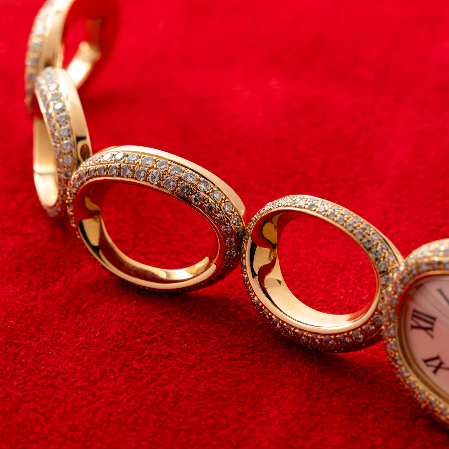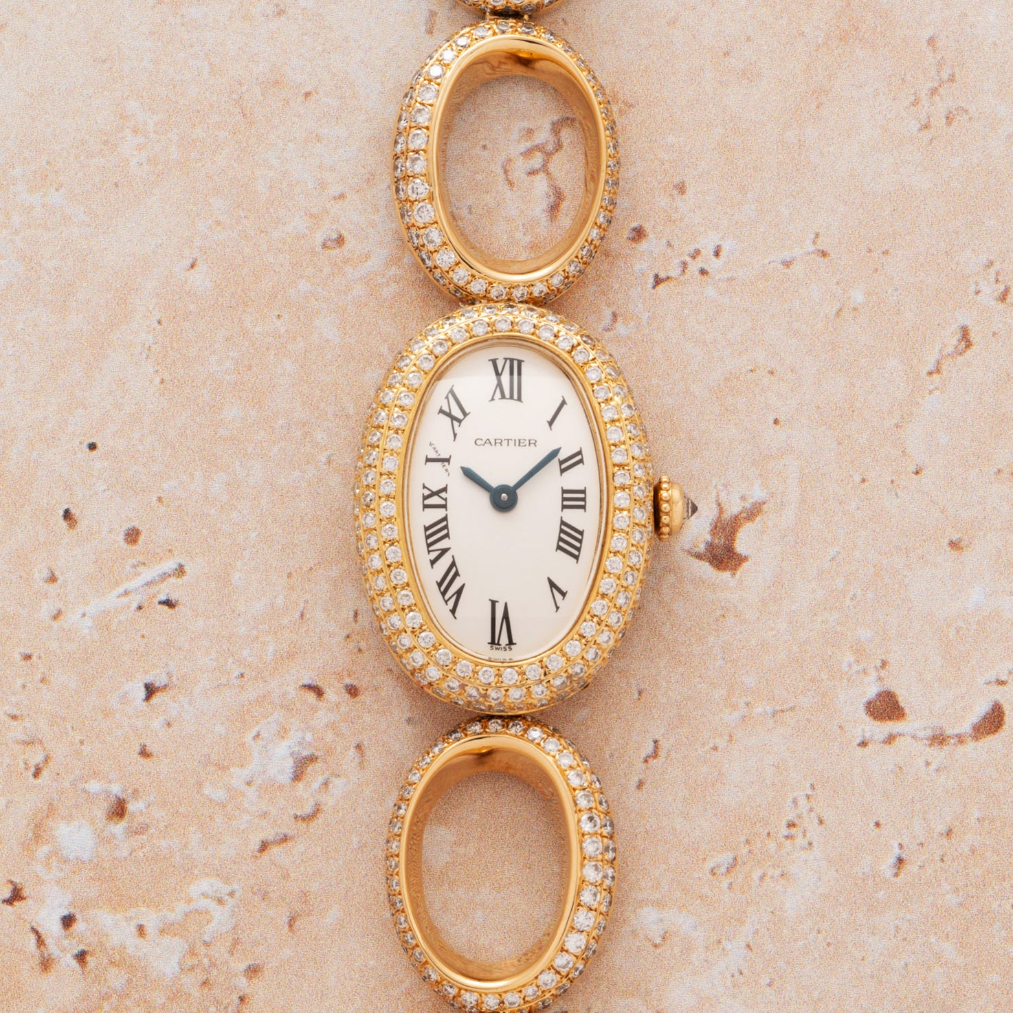 Playing off the oval case shape of this Baignoire, and continuing the diamond-set theme of the bezel straight through to the clasp, this exceptional Cartier features oval links, all set with diamonds. This piece is equally bracelet, jewelry, and wristwatch, and we can't get enough of it.