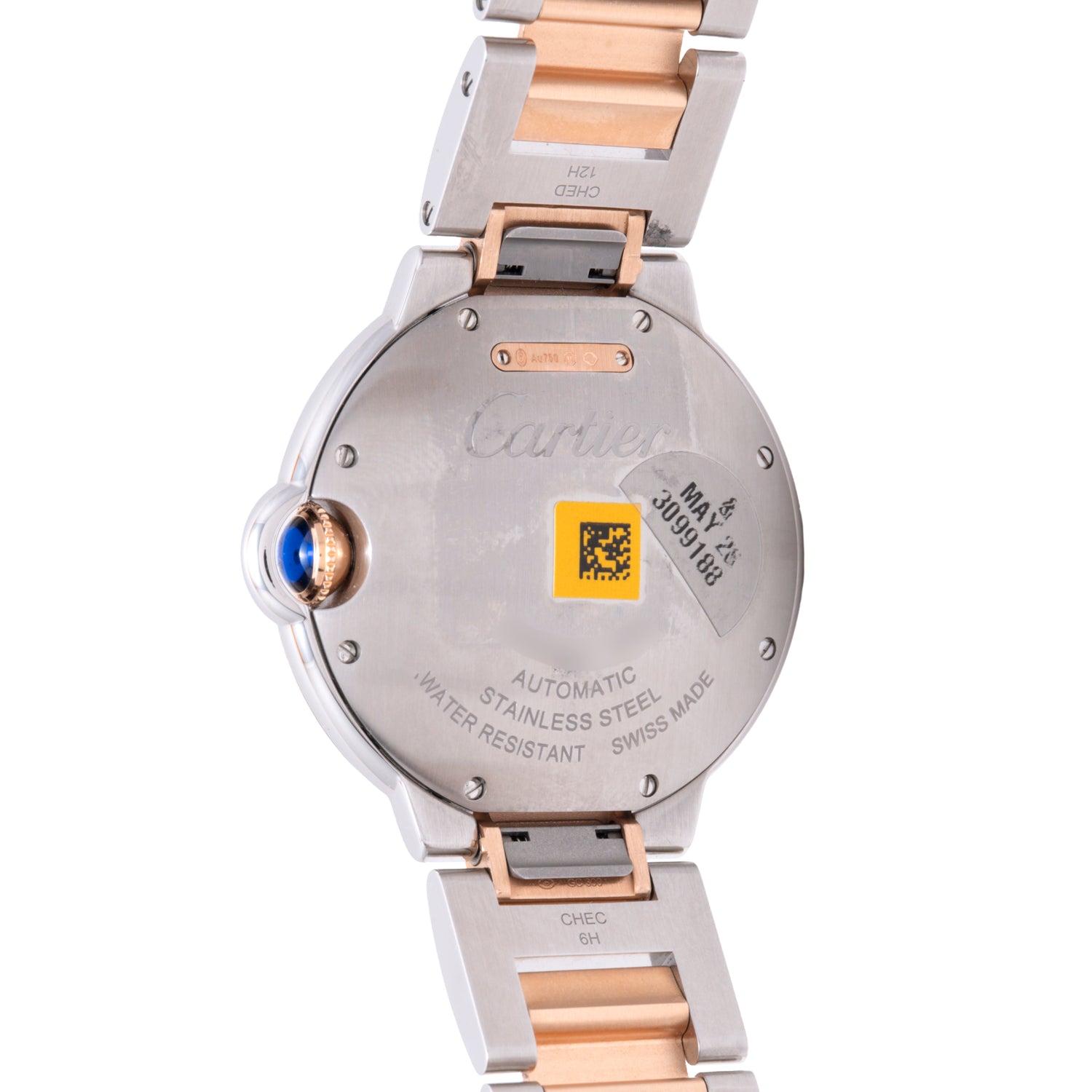 This particular Ballon Bleu features a 36mm stainless steel and rose gold housing with a sapphire crystal, a 'bubble' sapphire cabochon crown, a rose gold bezel, and a lovely sunburst grey guilloché dial with black 'Roman' indices, a blued steel 'sword' handset, and an inner black minute track.