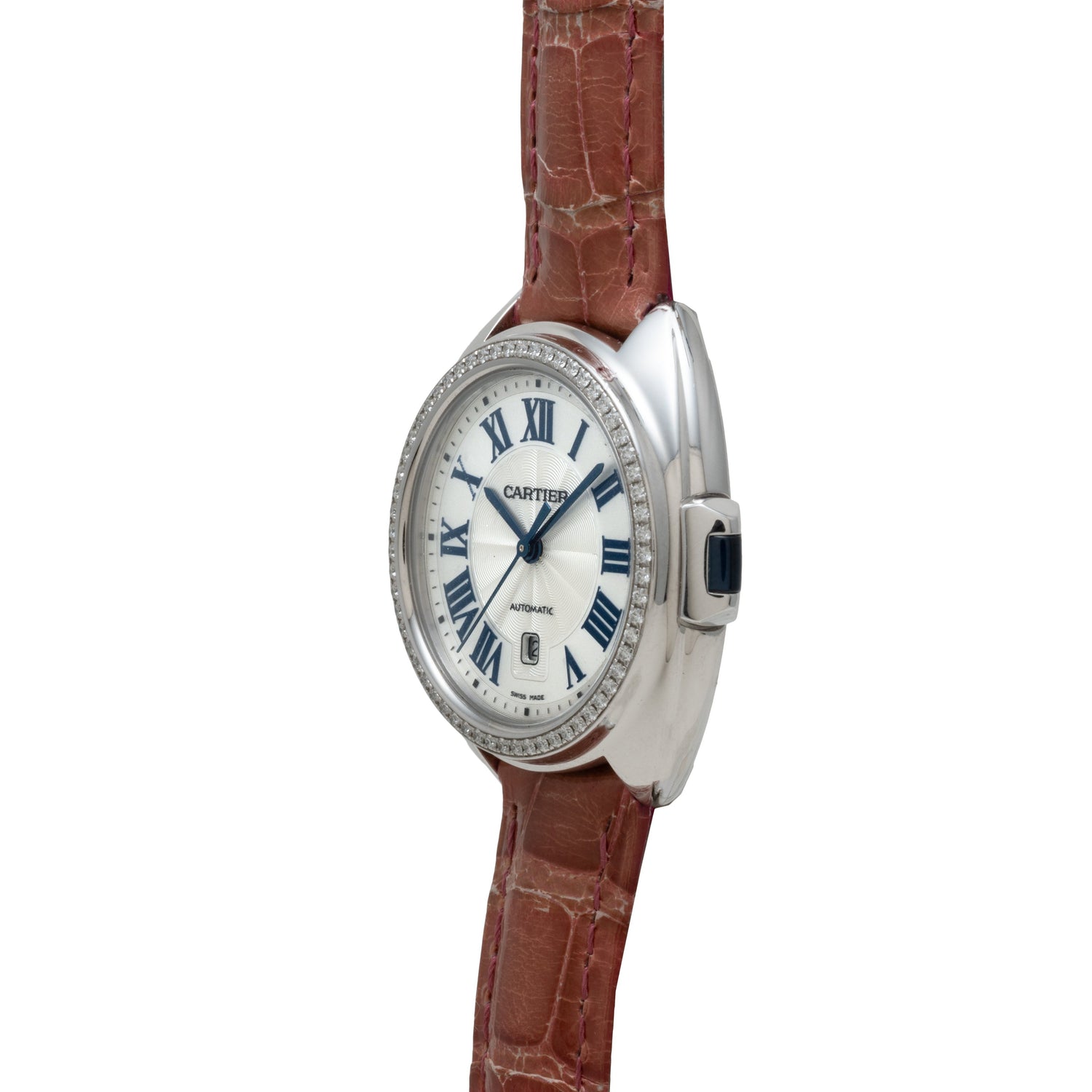 Take this Clé de Cartier for example. This example, a Reference 3804, features a beautiful 34mm white gold cushion case shape with soft curves. This watch is anything but boring, and provides an incredible host of details to obsess over. The diamond-set bezel, for example, is just the first of many small touches that help this Clé stand out.