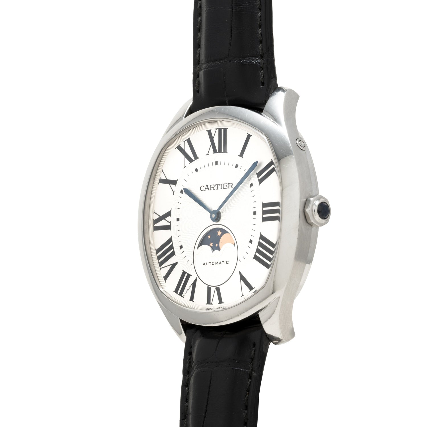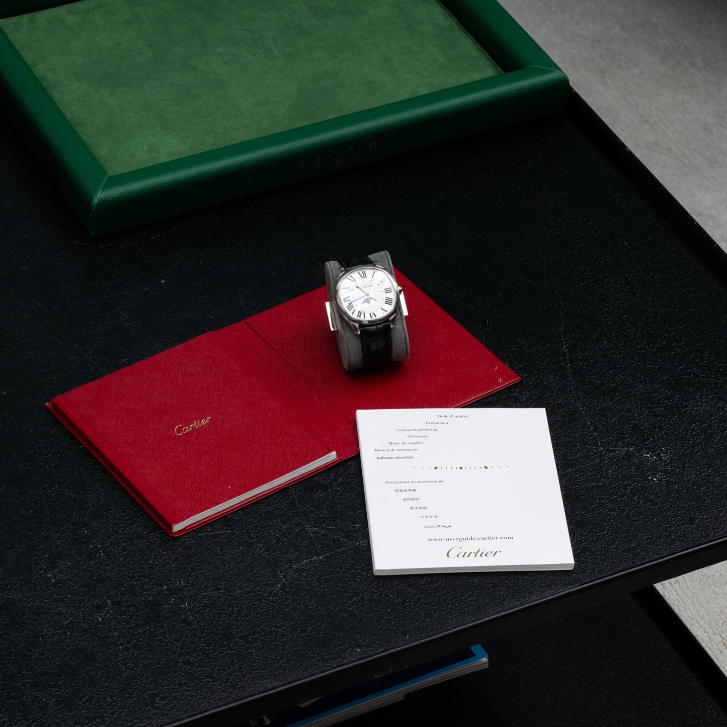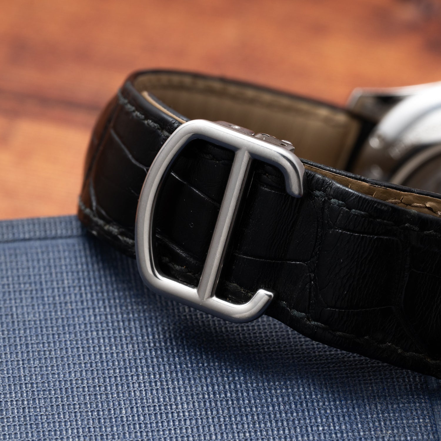 This Drive de Cartier is a sumptuous model dating to the 2020s. Housed in a svelte 40mm stainless steel case with a sapphire crystal and a sapphire cabochon crown, it features a sunburst silver dial with painted black Roman indices, a blued steel ‘sword’ handset, an inner minute track and lastly, a gorgeous moonphase display. Powered by the self-winding Cartier Calibre 1904 LU MC movement, it comes paired to a black alligator leather strap with a stainless steel, signed pin buckle.