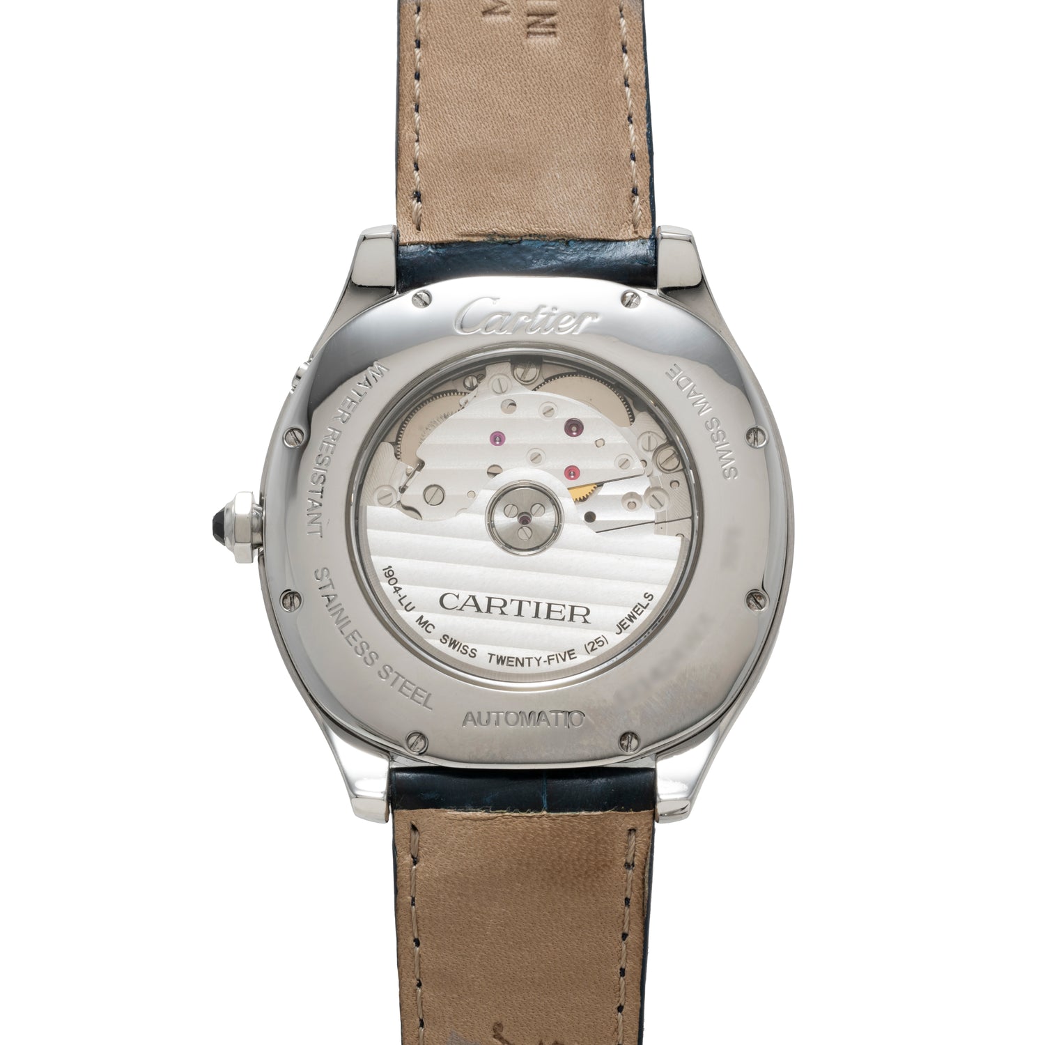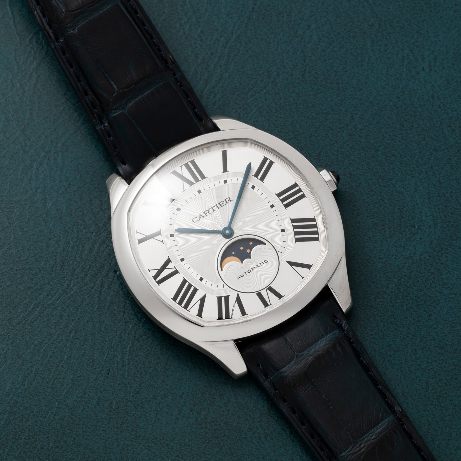 This Drive de Cartier is a sumptuous model dating to the 2020s. Housed in a svelte 40mm stainless steel case with a sapphire crystal and a sapphire cabochon crown, it features a sunburst silver dial with painted black Roman indices, a blued steel ‘sword’ handset, an inner minute track and lastly, a gorgeous moonphase display. Powered by the self-winding Cartier Calibre 1904 LU MC movement, it comes paired to a black alligator leather strap with a stainless steel, signed pin buckle.