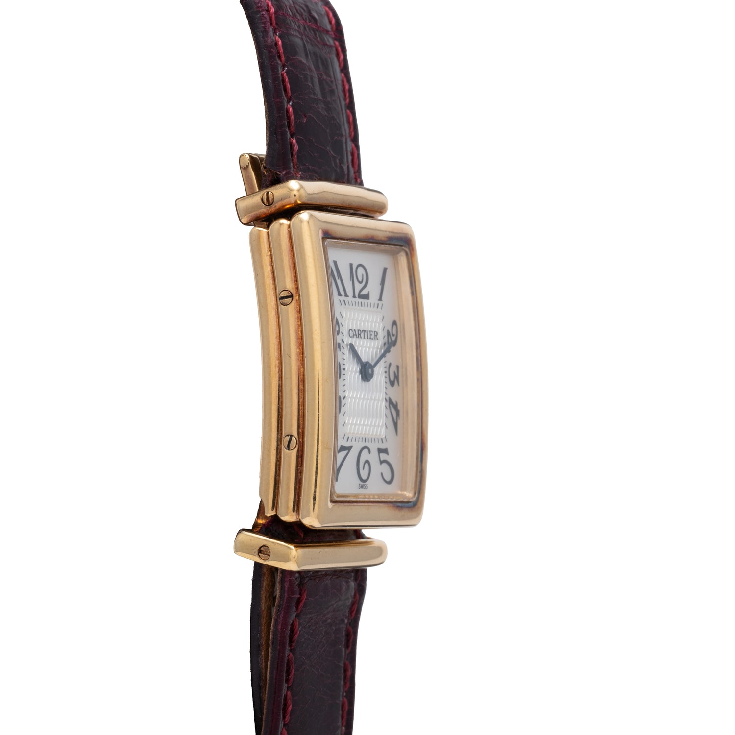 This piece measures 22mm x 33.5mm in yellow gold and features a unique articulating lug structure that allows the watch to conform to a variety of wrist sizes optimally. This watch is somewhat of a design anomaly in the world of Cartier, which adds to the appeal of the piece.