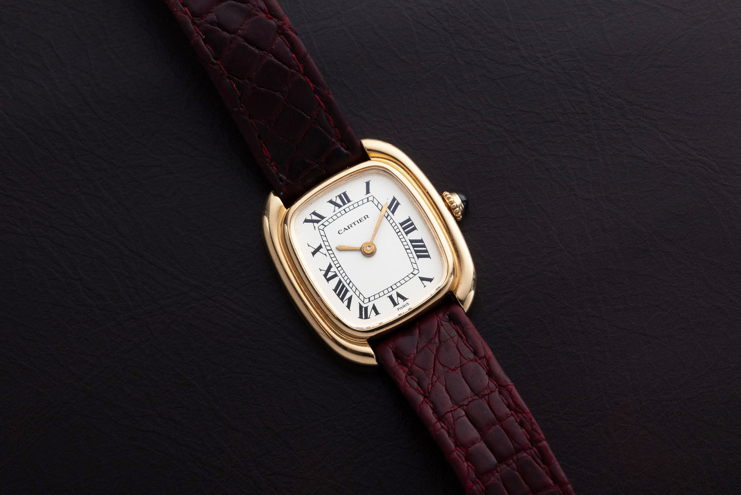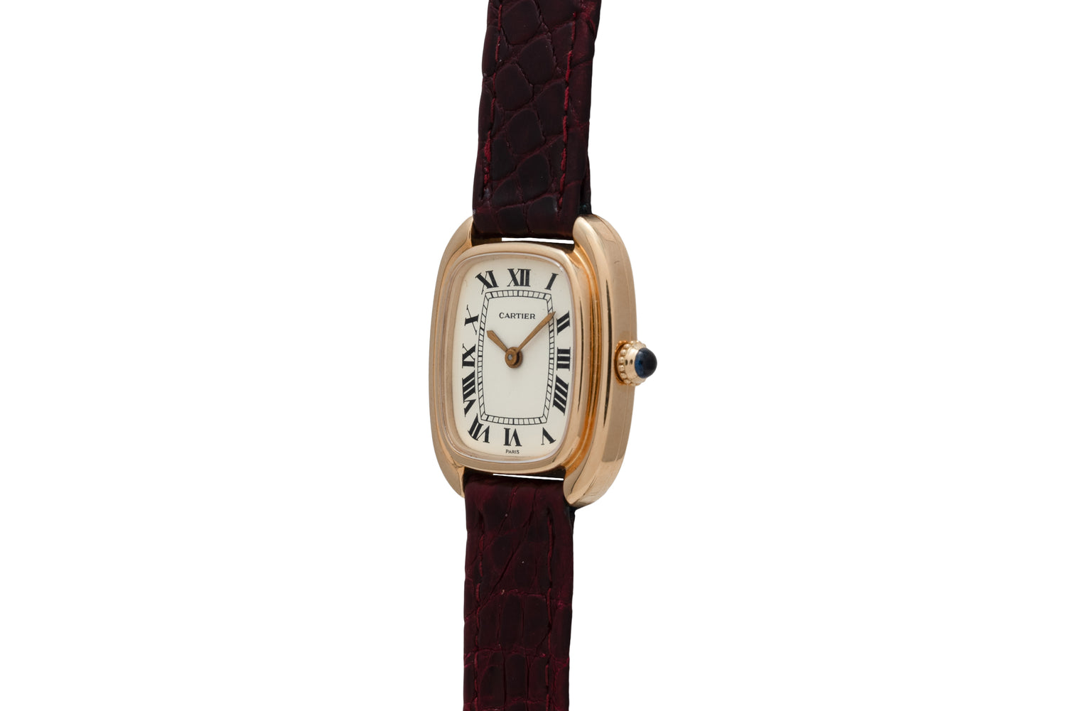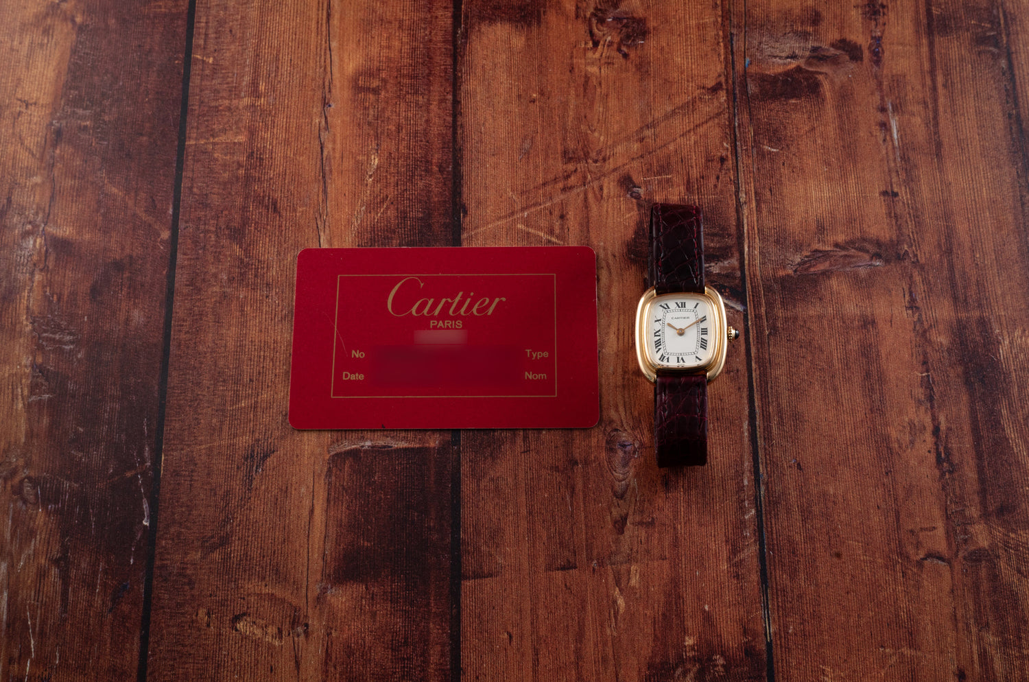 This particular example, a Gondole ladies model, dates to circa 1990s and is in excellent condition throughout. It features a 27 x 24mm tonneau-shaped 18k yellow gold case with Cartier's ubiquitous cabochon winding crown, white Roman dial with Paris signature, and a manually-winding movement.