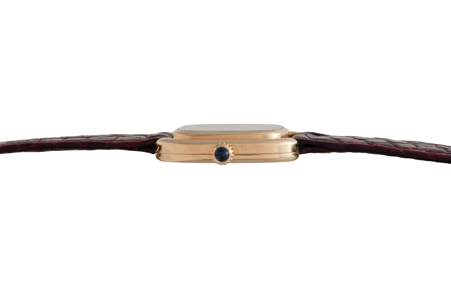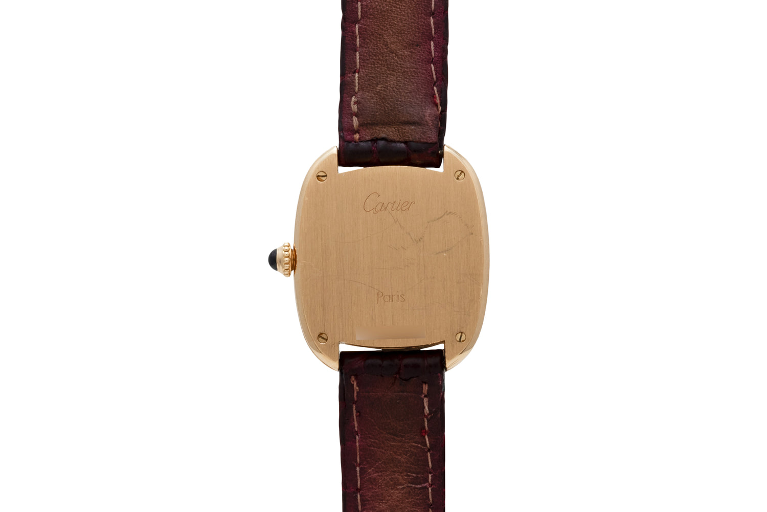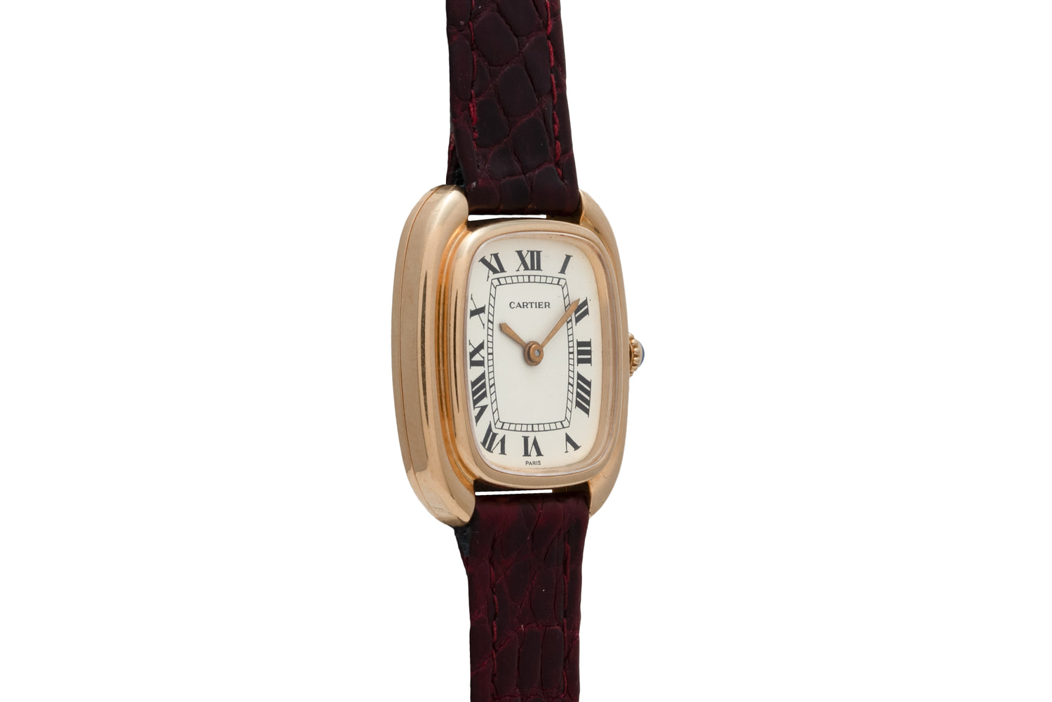This particular example, a Gondole ladies model, dates to circa 1990s and is in excellent condition throughout. It features a 27 x 24mm tonneau-shaped 18k yellow gold case with Cartier's ubiquitous cabochon winding crown, white Roman dial with Paris signature, and a manually-winding movement.