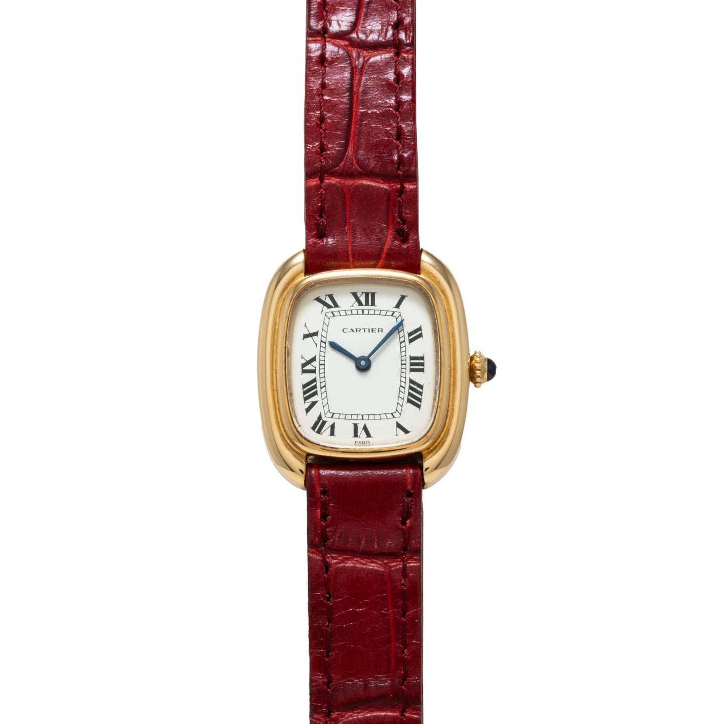 This particular example, a Gondole ladies model, dates to circa 1990s and was made at the firm’s Paris location. Housed in a 24mm 18K yellow gold tonneau case with a blue cabochon winding crown, an acrylic crystal, and a stepped bezel, it features a handsome white ‘Roman’ dial with an inner chemin de fer minute track, a black ‘sword’ handset, and a ‘Paris’ signature. Powered by a manually-wound movement, it comes paired to a red lizard strap with a signed yellow gold buckle.